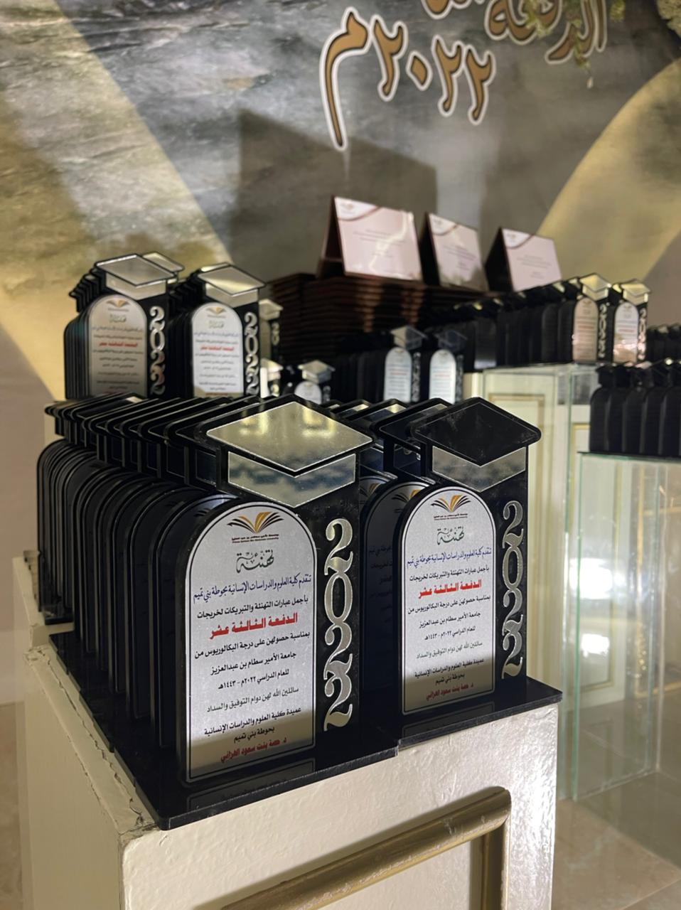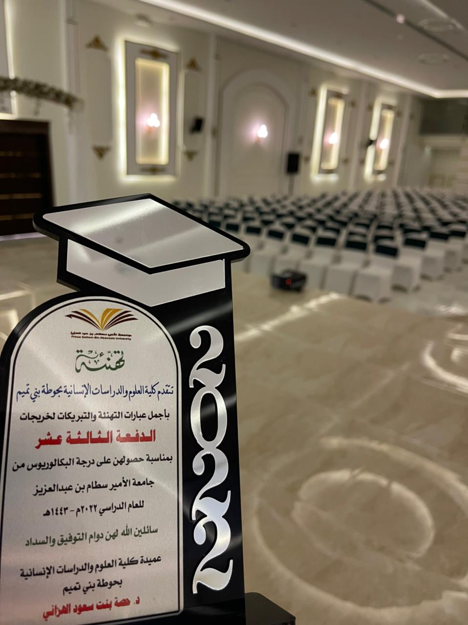 وحانت لحظات لباس الخريجات ورفع القبعات وانهالت دموع فرح الأمهات بحديث طويل اُجمل في دعوة من كلية العلوم والدراسات الإنسانية بحوطة بني تميم يوم الأربعاء الموافق:١٤٤٣/١٠/٢٤هـ، حيث نظمت كلية العلوم والدراسات الإنسانية بحوطة بني تميم حفل تخريج الدفعة الثالثة عشر من مرحلة البكالوريوس لطالبات الكلية تحت رعاية سعادة عميدة الكلية الدكتورة: حصة بنت سعود الهزاني وبحضور وكيلة الكلية للشؤون التعليمية والأكاديمية الدكتورة : بيان بنت إبراهيم السيف والمشرفة على الشؤون الإدارية والمالية الأستاذة: تهاني الجويعد ووكيلة التطوير والجودة الدكتورة: ندى التميمي، ومشرفات الأقسام، وعدد كبير من أعضاء هيئة التدريس والطاقم الإداري والضيوف من منسوبات التعليم ومديرة بنك الراجحي وأمهات الخريجات.