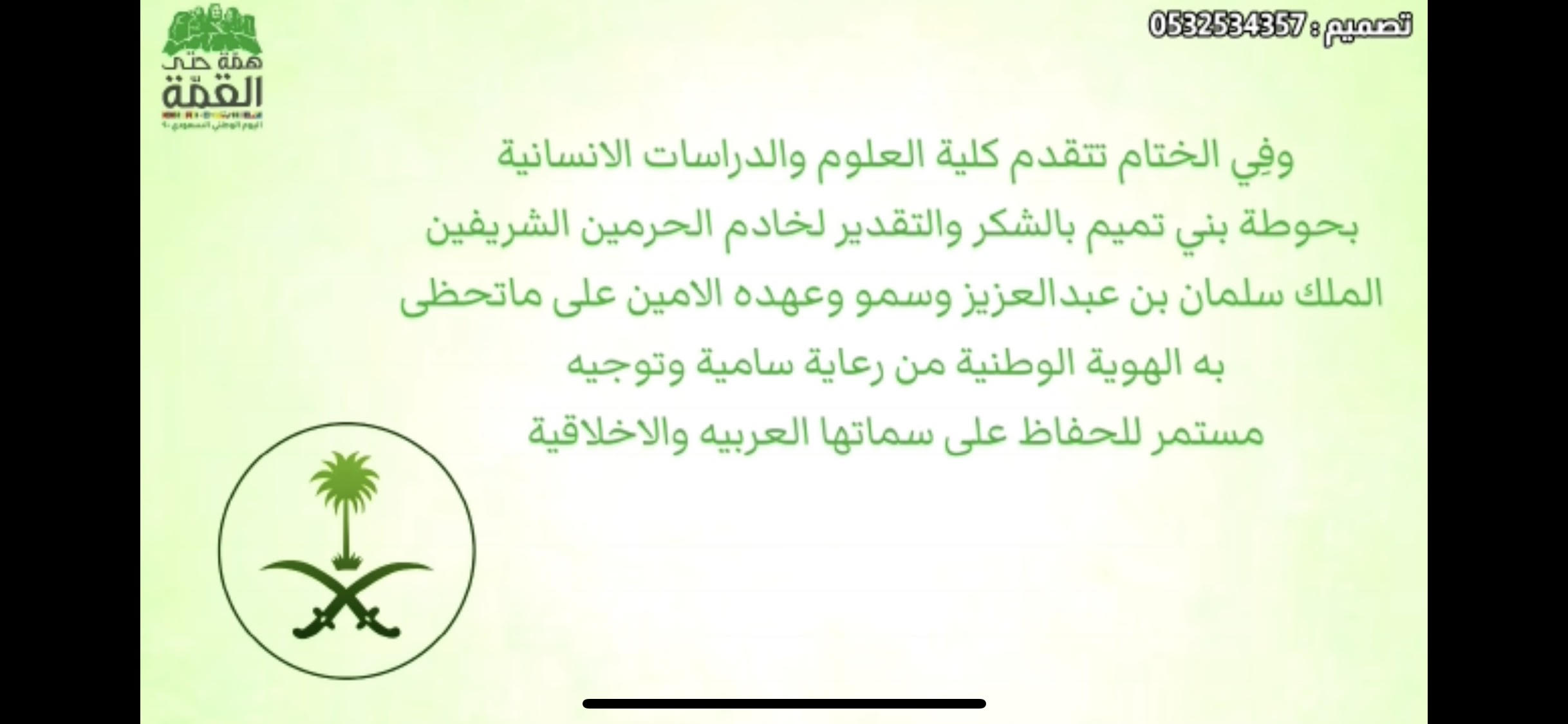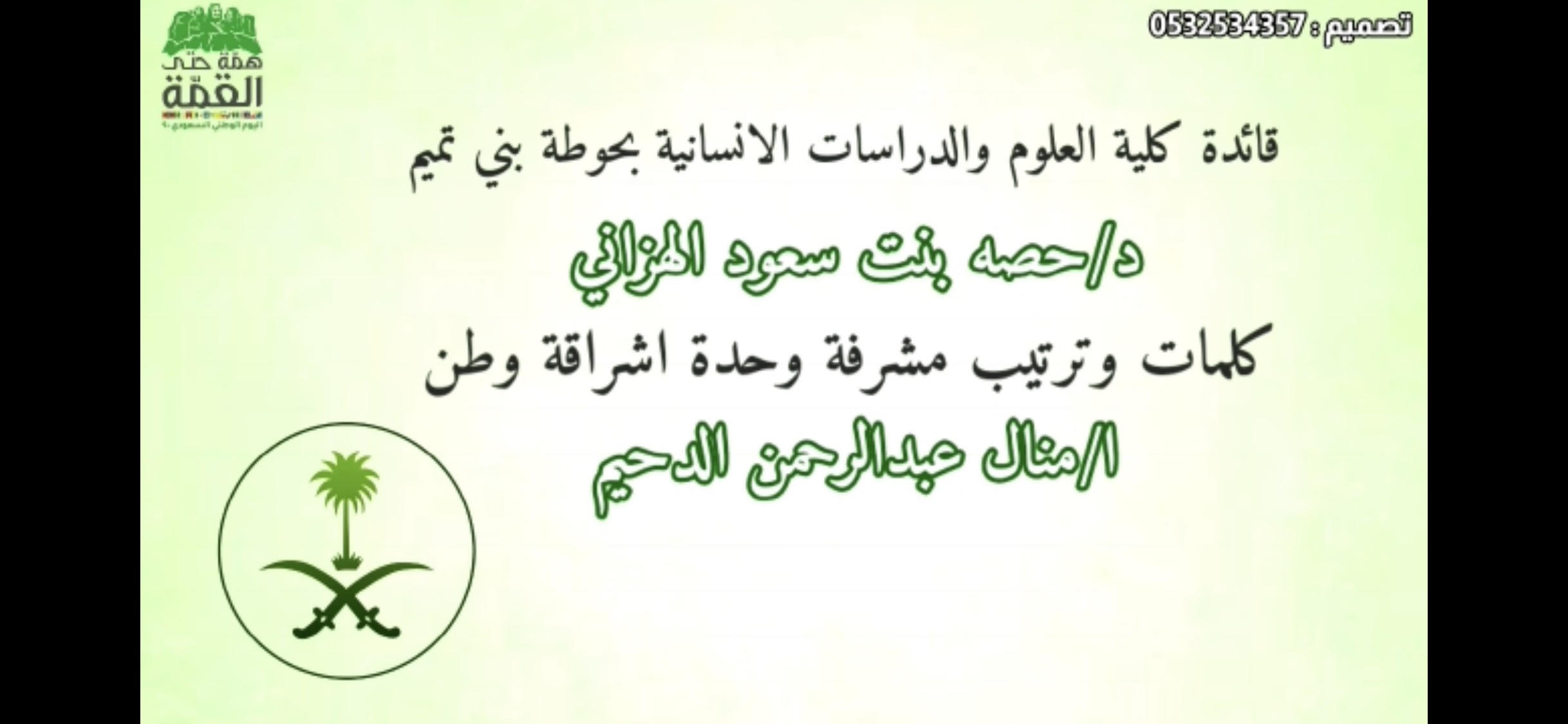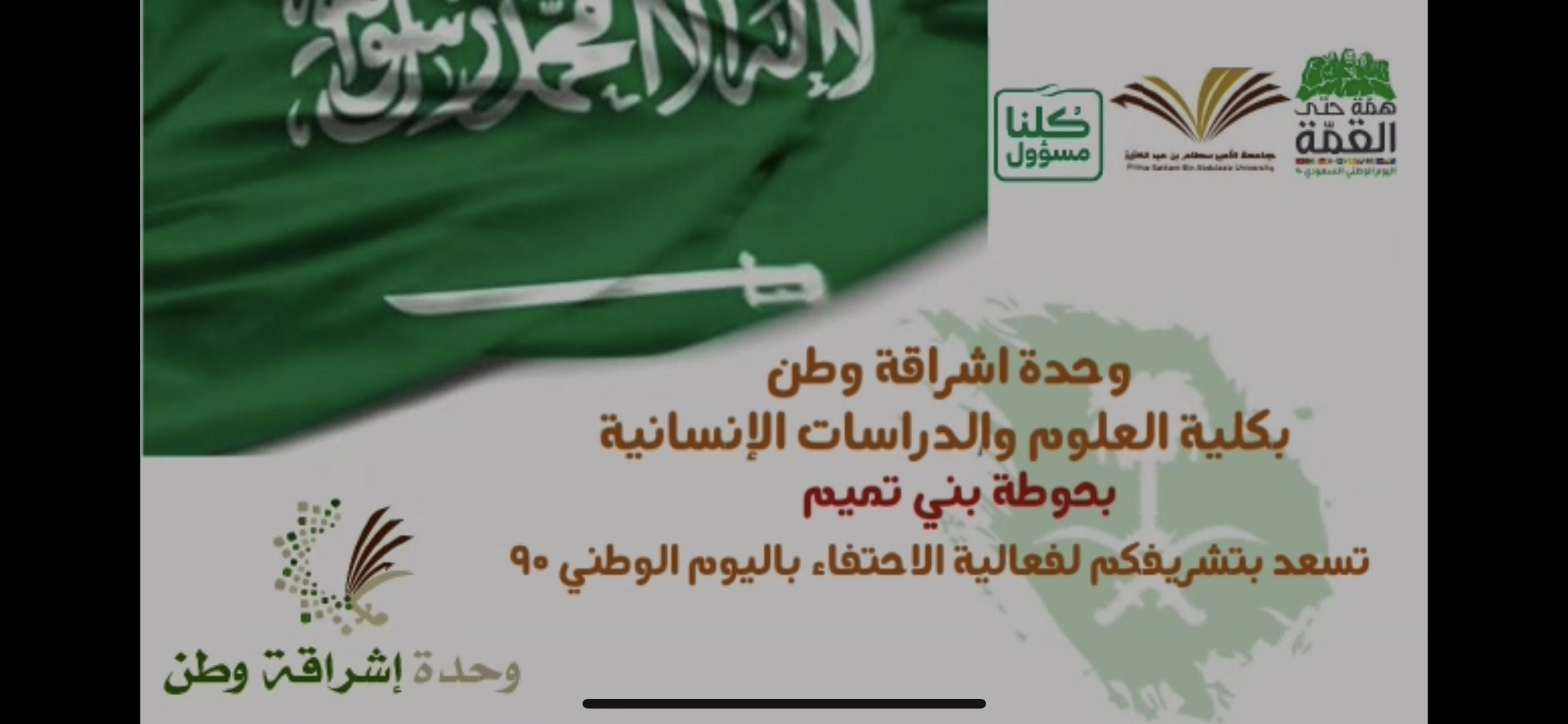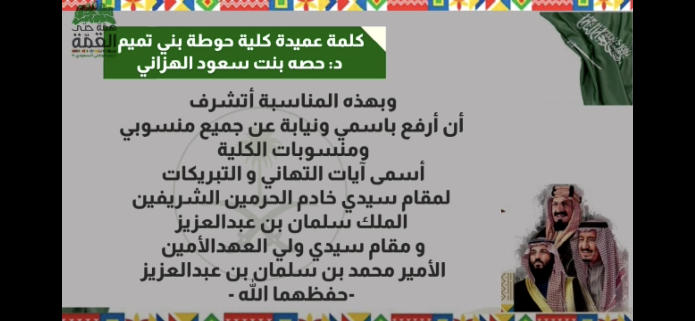 نحو قمة حتى الهمة، تعتلي الهمم نحو القمم. تحت قيادة عميد كلية العلوم والدراسات الإنسانية بحوطه بني تميم الدكتورة حصة بنت سعود الهزاني. أقامت وحدة إشراقة وطن احتفلا ًباليوم الوطني 90 تحت إشراف مشرفة الوحدة ا/منال الدحيم تشد به الهمم في جو افتراضي يعلو بالصوت ولو كانا بعيداً( ارفع الخفاق أخضر) لتنطلق فعاليات الاحتفال الوطني ليومين متتاليين. يوم الأحد الموافق: 1442/2/3هــ. في مونتاج مرئي بدأ بالسلام الملكي تلاه مرور جائحة كورونا في ظل الاحتفال باليوم الوطني ٩٠، ومن ثم عرض ملوك المملكة العربية السعودية على راسهم مؤسس البلاد الملك عبد العزيز آل سعود طيب الله ثراه ومن ثم الفخر والعزة بالانتماء إلى الوطن. تلا ذلك كلمة عميدة الكلية التي سميت بأمجاد هذا الوطن ودور القيادة الحكيمة وواجبنا تجاه هذه المعطيات، ومن ثم انطلاقة في التطور والرقي الذي وصل الوطن له بالهوية الوطنية وبث الوعي بها عن طريق إقامة مسابقة لأجمل تعليق لتجد من الطالبات قبولاً وتنافساً، وتم ترشيح الطالبات الفائزات. وفي الختام تهاني وشكر لخادم الحرمين الشريفين وولي عهده على ما وصلت له الهوية الوطنية في ظل التأسيس للعام التسعون. لينطلق بثها عن طريق مواقع التواصل المتعددة حيث لاقي أصدقاء الانتماء والحب والفخر لهذا الوطن. وفي اليوم التالي يوم الاثنين الموافق 1442/2/4هـ.حيث قدمت دورة بعنوان صانعات المجد في وطن المعرفة للدكتورة هبة الله الويشي أستاذ مساعد نظم المعلومات حيث تناولت الدورة تاريخ اليوم الوطني السعودي، ومجتمع المعرفة التعليم ، و رؤية 2030عالم فوكا وقد تتالت الأفكار الوطنية في سمو صوتي من قبل الدكتورة.