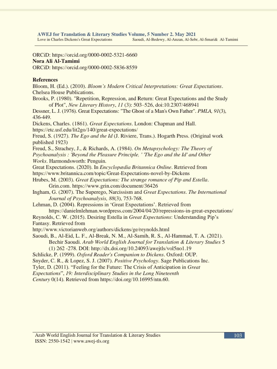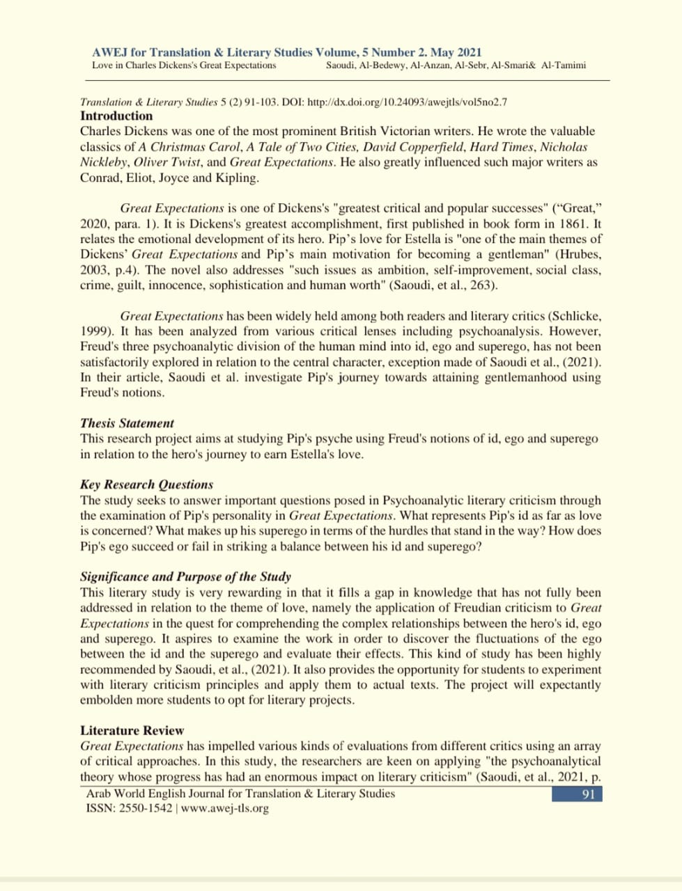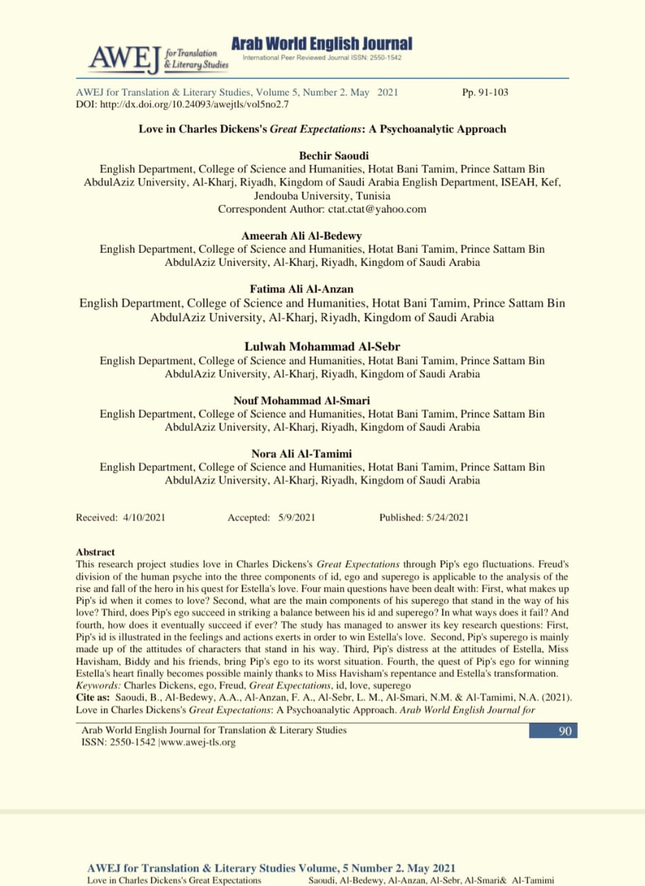 تألقت طالبات قسم اللغة الإنجليزية بكلية العلوم والدراسات الإنسانية بحوطة بني تميم مرة أخرى في نشر المقال العلمي الثالث على التوالي، و يستند المقال إلى مشروع تخرج الطالبات المتألقات وهن: أميرة علي البديوي، فاطمة علي العنزان، لولوه محمد السبر، نوف محمد السماري، ونورة علي التميمي للفصل الدراسي الثاني للعام الجامعي1442هـ، تحت رعاية عميدة الكلية الدكتورة حصة بنت سعود الهزاني، وإشراف أستاذ الأدب الإنجليزي الدكتور بشير حامد السعودي، و تم نشر المقال بعنوان: Love in Charles Dickens's Great Expectations: A Psychoanalytic Approach (الحب في رواية توقعات عظيمة للكاتب الإنجليزي تشارلز ديكنز: مقاربة تحليلية نفسية)، في المجلة الأمريكية العلمية المحكمة The Arab World English Journal والمصنفة في شبكة العلوم Web of Science في المجلد الخامس، رقم 2من المجلة بتاريخ 24 مايو 2021.