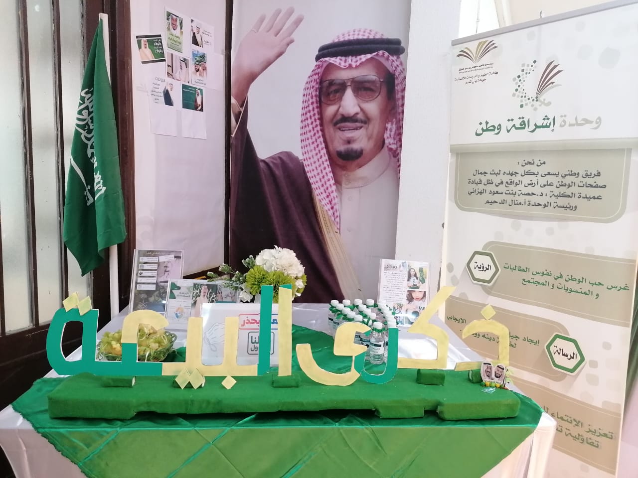 حيث تم إقامة ركن فخري لبث ونشر هذا اليوم لإعلان مثل هذه المناسبة القديرة. وقد سبق هذا الركن تفعيل مسابقة كلنا سلمان ولاء وعطاء وقد شارك فيه العديد من الطالبات. وتم حصر المراكز الأولى من بعد الترشيح حيث كان تحفيز عميدة الكلية للطالبات في تقديم الجوائز أكبر الأثر للمشاركات وتقديراً لهذه المناسبة القديرة. فكانت النتائج الفائزات بالمسابقة كالتالي: المركزالأول/ نورة عبدالله الوبران قسم اللغة الإنجليزية.