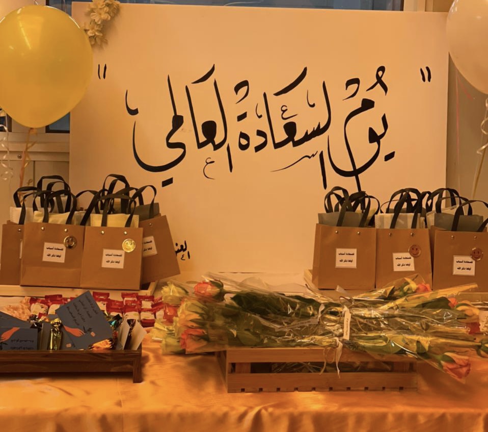 السعادة تمد الشخص بالقوة لكي يستطيع العيش بطريقة إيجابية، ولأهميته نظمت وحدة التدريب والخدمة المجتمعية مع طالبات قسم اللغة العربية تحت رعاية عميدة كلية العلوم والدراسات الإنسانية بحوطة بني تميم الدكتورة/ حصة بنت سعود الهزاني ركنًا للاحتفاء بيوم السعادة العالمي تحت شعار" السعادة عادة العقلاء" بإشراف د. أميرة محمد صالح ود. نادية لطفي يوم الاثنين الموافق: 1443/8/18 هـ بساحة الكلية.