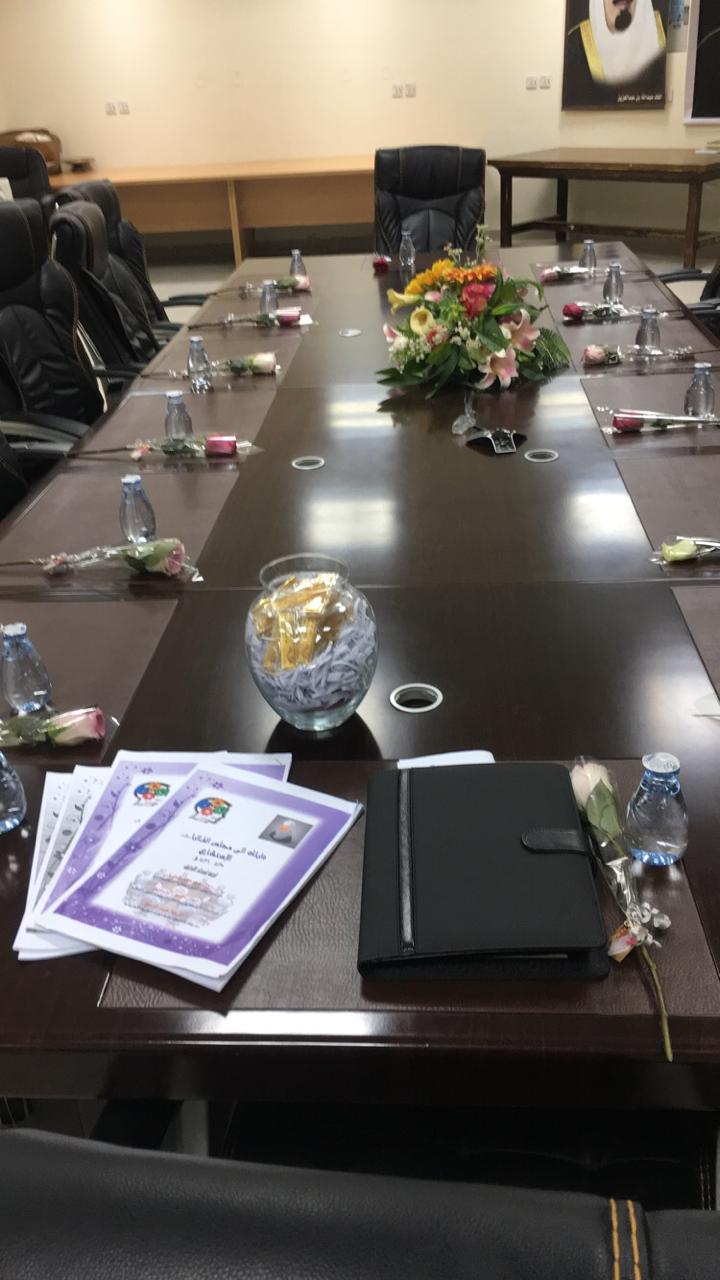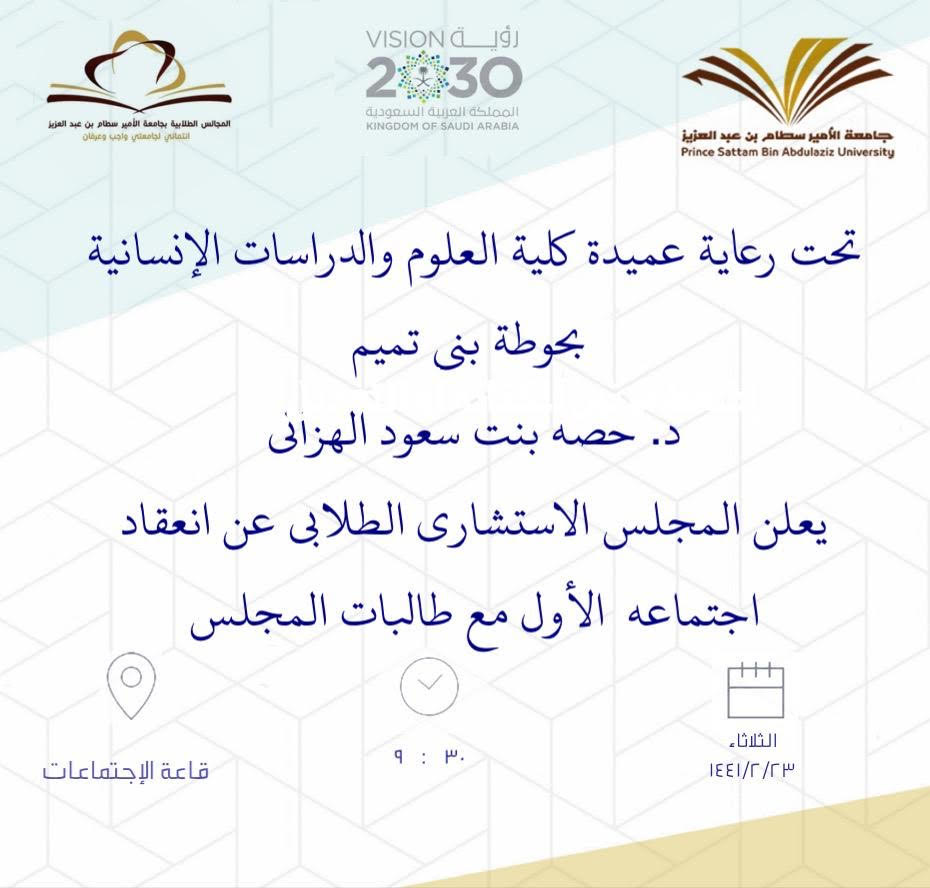 عُقد صباح اليوم الثلاثاء الموافق: ٢٣/ ٢/ ١٤٤١هـ اجتماع المجلس الاستشاري الطلابي الأول تحت قيادة عميدة كلية العلوم والدراسات الإنسانية بحوطة بني تميم في تمام الساعة التاسعة والنصف في قاعة الاجتماعات بحضور عميدة الكلية د. حصة بنت سعود الهزاني ومشرفة العمل الطلابي أ. اسلام العمري ومنسقة المجلس الطلابي أ. منيرة إبراهيم التميمي وطالبات المجلس الاستشاري الطلابي. في البداية تم الترحيب بالطالبات والتعرف عليهن، ومناقشة أهداف المجلس الطلابي ومهامه، والعمل على نشر مفهوم المجلس بين الطالبات وتشجيع الطالبات على الانضمام لعضوية المجالس الطلابية، كما تم مناقشة الخطة الفصلية للمجالس الطلابية وتوزيع شعار المجلس على الطالبات.