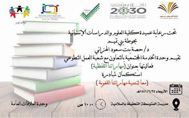 تسعى كلية العلوم والدراسات الإنسانية بحوطة بني تميم في ظل قيادة عميدة الكلية د/ حصة بنت سعود الهزاني، إلى استكمال المبادرات لتنمية المهارات اللغوية لدى الطالبات فهن نواة المجتمع. حيث أقامت وحدة التدريب وخدمة المجتمع بالتعاون مع شعبة العمل التطوعي بالكلية فعاليتها بعنوان ( مهاراتنا اللفظية) استكمال لمبادرة( معا لتنمية مهاراتنا اللغوية) وذلك في يوم الأربعاء الموافق: ١٤٤١/٦/٢٥هـ. بمتوسطة التحفيظ بالسلامية، في تمام الساعة العاشرة صباحاً، وبمشاركة طالبات اللغة العربية مستوى سادس. تحت وإشراف ا/ أمل عبد المنعم منسقة الخدمة المجتمعية بقسم التربية. هدفت الفعالية إلى الوقوف على مستوى الطالبات في مهارتي القراءة والكتابة باستخدام بعض القصص ومعرفة الضعيفات منهم لتحسين مستواهن من خلال مبادرة ( معا لتنمية مهاراتنا اللغوية ). وتم توزيع بطاقات للقراء والإملاء لبعض العبارات. واختتمت في تمام الساعة الحادية عشر ونصف بتفاعل من طالبات المدرسة والقائمات على البرنامج.