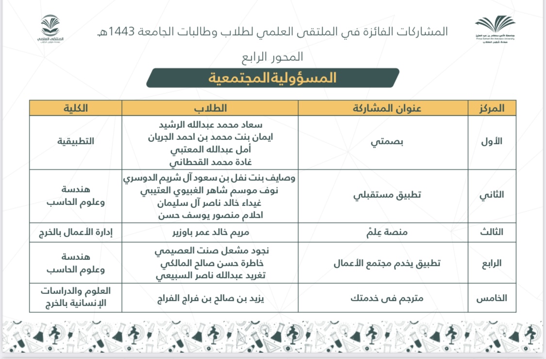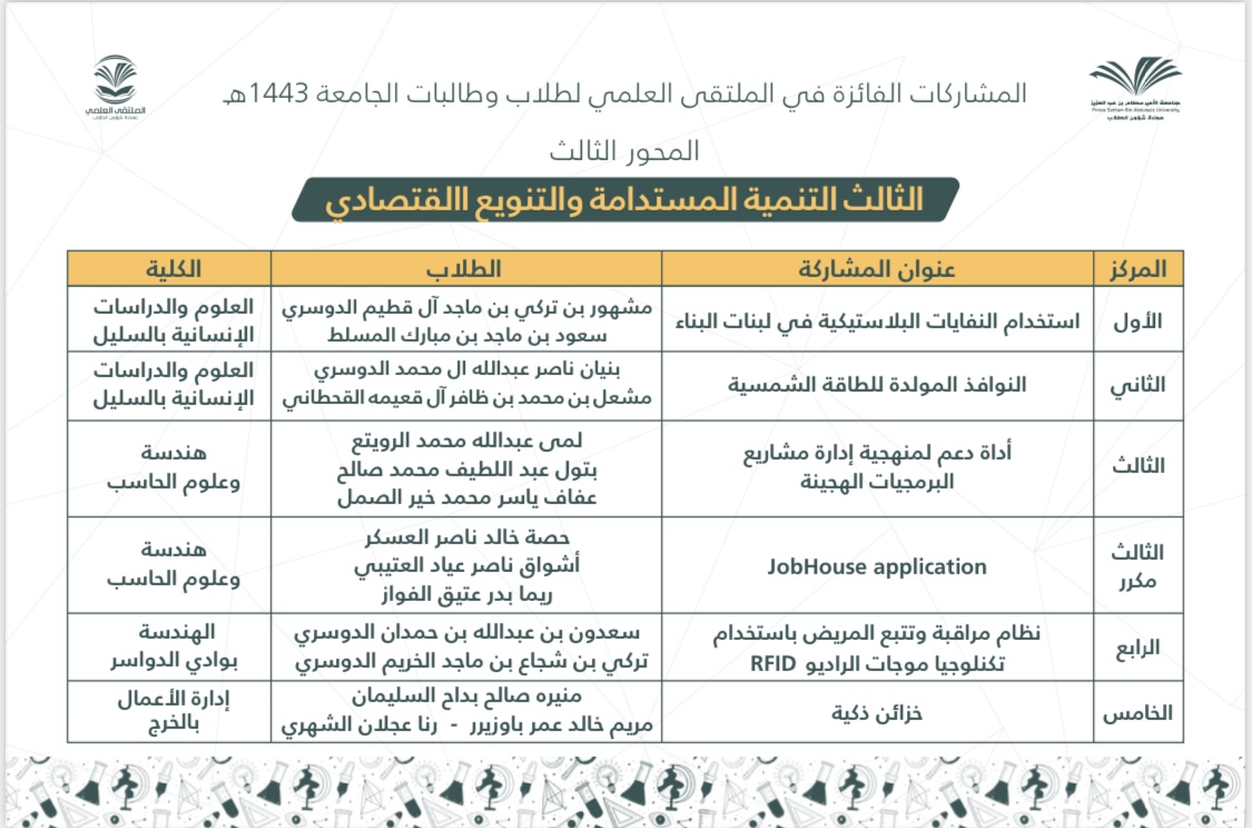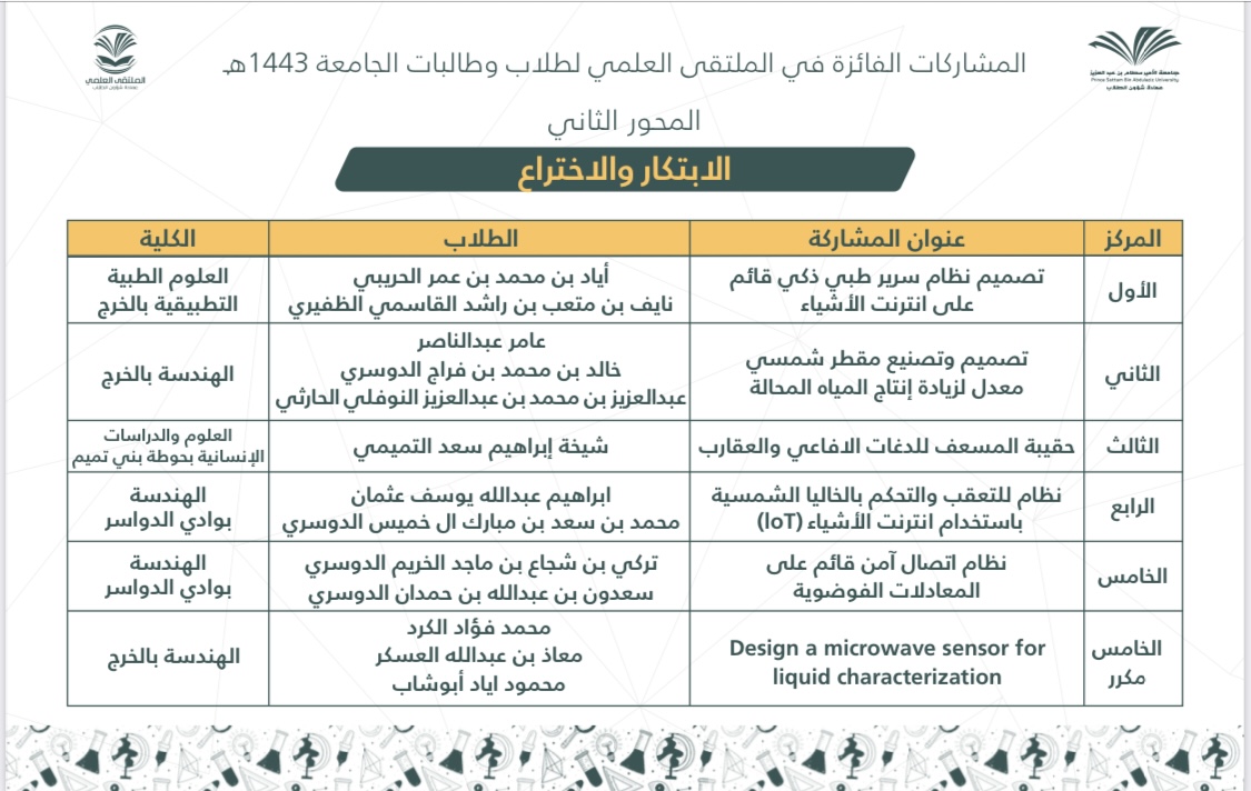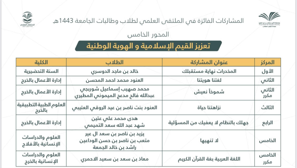وقد ترشحت من كلية العلوم والدراسات الإنسانية بحوطة بني تميم مشاركتان بعد تحكيم المشاركات على مستوى الكليات.