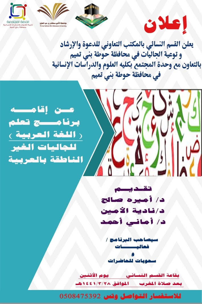 نظراً للإقبال المتزايد على تعلم اللغة العربية من قبل الناطقين بغيرها لدوافع متنوعة منها؛ دينية وثقافية وسياسية واقتصادية وغيرها . قامت وحدة التدريب وخدمة المجتمع بكلية العلوم و الدراسات الإنسانية بحوطة بني تميم، بتنفيذ برنامج "تعلم اللغة العربية للجاليات الغير الناطقة بالعربية "بالتعاون مع القسم النسائي بمكتب التعاوني للدعوة والإرشاد وتوعية الجاليات بحوطة بني تميم . تحت قيادة عميدة الكلية الدكتورة/ حصة بنت سعود الهزاني، في يوم الاثنين الموافق:1441/3/28هـ من تقديم/ د. أميرة صالح .ود. نادية الامين ود. أماني أحمد. وهدف البرنامج إلى نشر اللغة العربية وتعزيز التواصل الثقافي والحضاري بين مختلف الثقافات بالمحافظة. وقد حضر البرنامج عدد من أفراد الجاليات المختلفة. كما نال على استحسان الحضور.