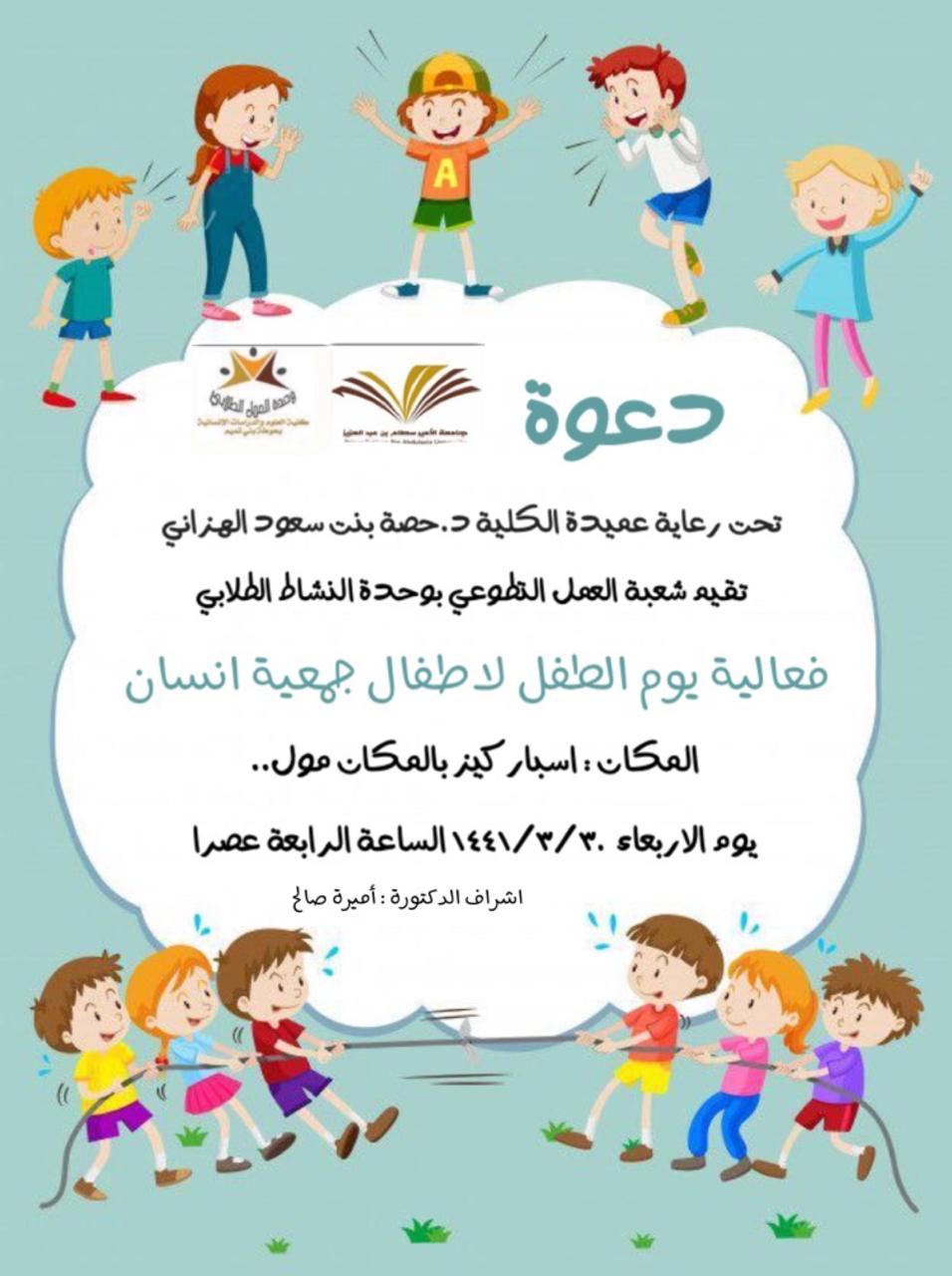 من منطلق حرص كلية العلوم و الدراسات الإنسانية بحوطة بني تميم في تعزيز وتنمية حس المسؤولية لدى الطالبات والتوعية تجاه الإسهام في بناء المجتمع والاهتمام بالأخرين. أقامت شعبة العمل التطوعي بوحدة النشاط الطلابي بقسم اللغة العربية برنامجاً ترفيهياً لأطفال جمعية إنسان بسباركيز، تحت قيادة عميدة كلية العلوم و الدراسات الإنسانية بحوطة بني تميم، الدكتورة: حصة بنت سعود الهزاني، مساء يوم الأربعاء الموافق : 1441/3/30 بأشراف د. أميرة صالح ود. نادية الأمين. بالمكان مول اشتمل على تذاكر للأطفال وتوزيعات، وتم توزيع وجبة للأطفال في ختام البرنامج. وقد حضر البرنامج عدد من أمهات الأطفال ومشرفات جمعية إنسان وقدمت الأمهات والمشرفات شكرهن للطالبات وللكلية التي أولت الأيتام رعاية خاصة .