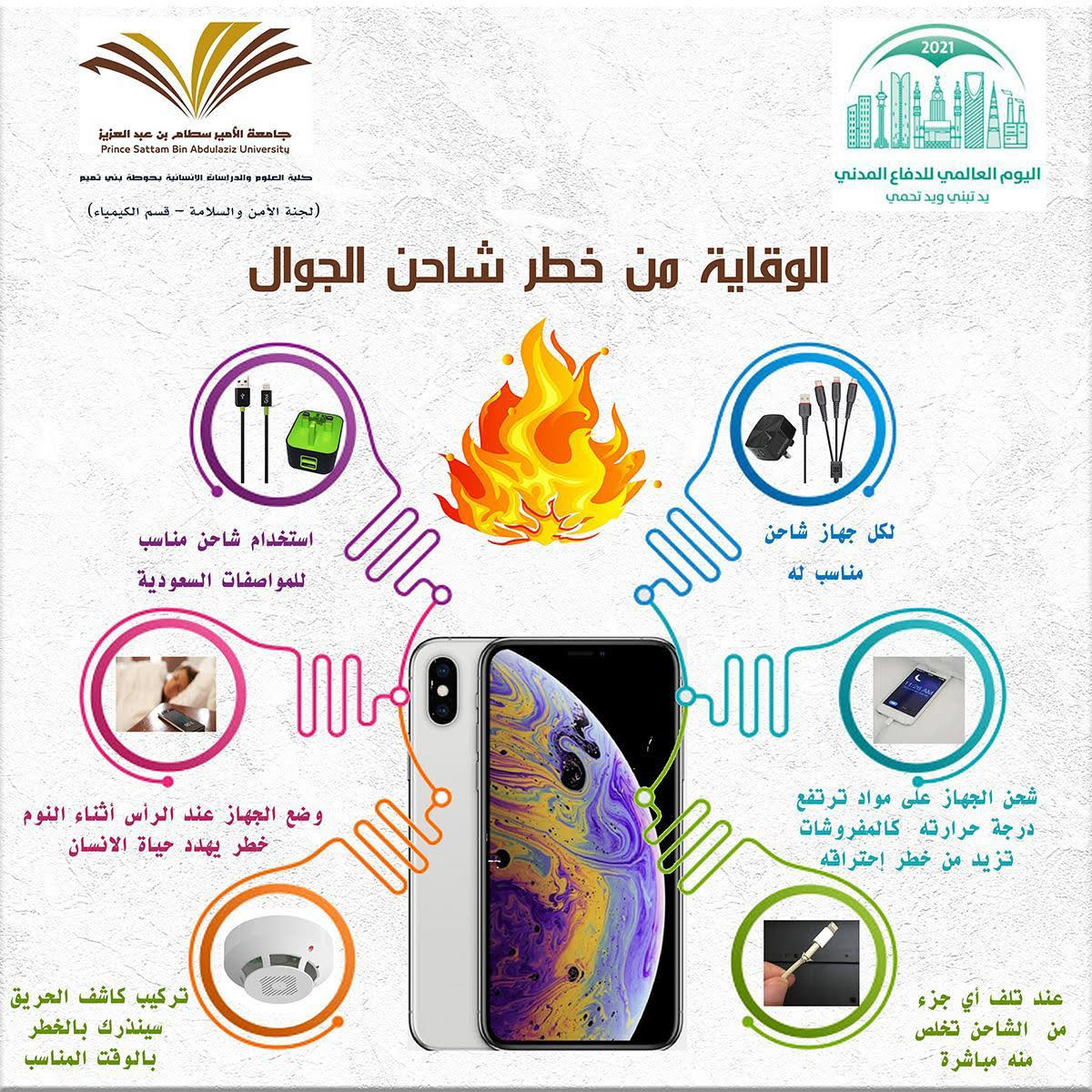 1مارس يُعتبر يوماً دولياً للاحتفال باليوم العالمي للدفاع المدني ويُقام هذا العام تحت شعار" يدٌ تبني ويدٌ تحمي"، وذلك تقديراً لما تقوم به أجهزة الدفاع المدني من جهود عظيمة للحفاظ على أمن وسلامة المجتمعات الإنسانية من خطر الكوارث الطبيعية والبشرية والتقليل من الآثار المأساوية التي تنجم عنها، وأجهزة الهاتف المحمول أصبحت إحدى الضروريات التي لا يمكن الاستغناء عنها وعملية شحنها لا تتم فقط في المنازل وإنما في أماكن العمل، والمقاهي وغيرها، ويحذر الدفاع المدني مراراً من عدم ترك الشاحن موصولاً بالكهرباء لمدة طويلة حيث تتسبب تلك الخطورة في اندلاع الحرائق.