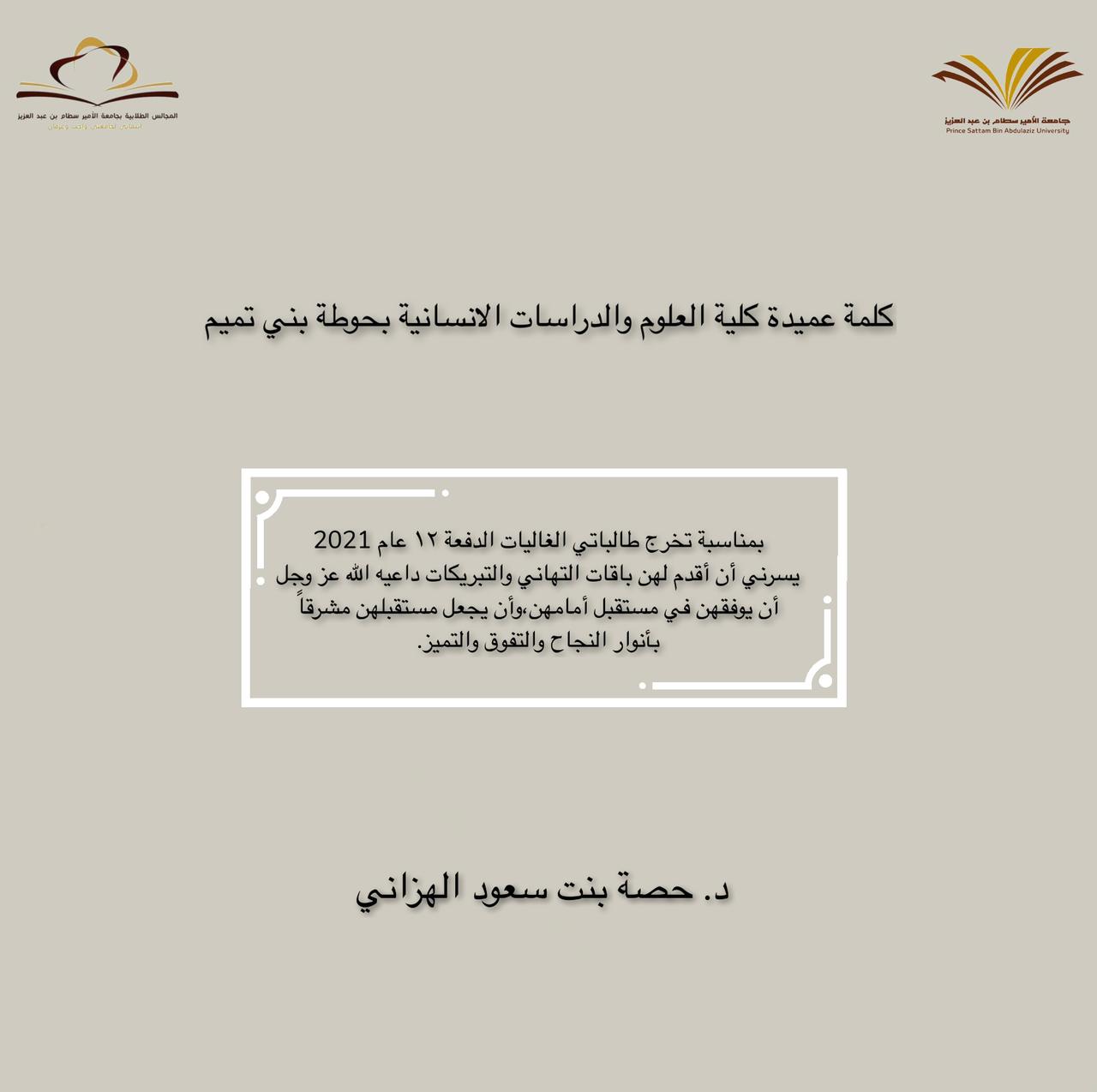 يبقى التخرج هو الذكرى الجميلة في حياة الإنسان، والتي يظل يتذكرها طوال حياته، لذا يبحث عن أعذب الكلمات عن التخرج ليسجل بها تلك الذكرى، وذلك من خلال مشاركة من المجلس الاستشاري الطلابي لطالباتنا خريجات الدفعة (١٢) تحت رعاية عميدة كلية العلوم والدراسات الإنسانية بحوطة بني تميم د. حصة بنت سعود الهزاني، وبإشراف منسقة المجلس أ. منيرة إبراهيم التميمي.