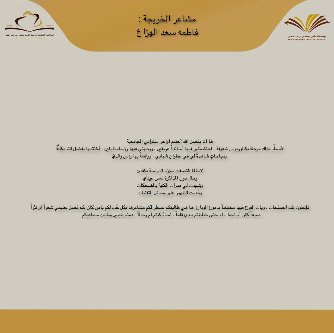 هنيئاً لطالباتنا هذا الإنجاز وهنيئاً لهن حصاد الثمر وحصول المبتغى، والشكر الأوفى والثناء الأجزل لعميدتنا الفاضلة لمشاركتها طالباتنا الخريجات والشكر موصول لأعضاء الهيئة التعليمية الذين أخلصوا النية وأحسنوا العمل وأجزلوا العطاء فأثمرت جهودهم الموفقة نبتاً طيباً تمثل في هذه الكوكبة من الخريجات في مختلف مجالات العلم والمعرفة.