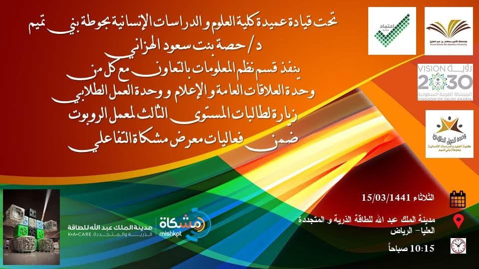 في إطار تفعيل استراتيجيات التدريس الحديثة و بخاصة التعلم التفاعلي النشط الذي يستخدم فيه عضو هيئة التدريس محفزات التفاعل النشط لتشجيع الطلاب على المشاركة في الأنشطة التي تتيح لهم التفاعل مع المادة العلمية التي يدرسونها بشكل مباشر. اختارت د/ هبة الله أحمد الويشي أستاذ مقرر برمجة الحاسب1 – المستوى الثالث قسم نظم المعلومات – تقنية العملية العرضية كأحد التقنيات الحديثة للتعلم التفاعلي التي ينصب فيها التركيز على كيفية حل المشكلات الواقعية بنقل الطالبات لبيئة المتغيرات المعاصرة، و بالتعاون مع وحدة العلاقات العامة و الإعلام و وحدة العمل الطلابي تحت قيادة عميدة الكلية د/ حصة بنت سعود الهزاني. حيث تم تنفيذ زيارة لمعرض مشكاة التفاعلي بمدينة الملك عبد الله للطاقة الذرية و المتجددة بالرياض يوم الثلاثاء الموافق: 1441/3/15هـ بحضور (15 طالبة). بدأت الزيارة في تمام الساعة 10:15 صباحاً باستقبال الطالبات و الترحيب بهن من خلال عرض تقديمي تعريفي بمعرض مشكاة التفاعلي و نشأته و أركانه التي تتبنى التعلم بالاستكشاف، حيث انتقلت الطالبات لمنطقة اكتشاف تحولات الطاقة و التي أثارت فضولهن و العديد من التساؤلات التي تم الإجابة عليها بمساعد منسقات المعرض اللاتي سمحن للطالبات بتجربة و اختبار محولات الطاقة بأنفسهن. تلتها جولة في منطقة مستقبل الطاقة لتعزيز فهم علوم و تقنيات الطاقة المستدامة. اختتمت الزيارة بتعرف الطالبات على قطع الروبوت المبرمجة Robot Blocks for Modular Robotics و التي يتم تركيبها بعدة طرق لتحريك الروبوت لتنفيذ مهام مسبقة الإعداد. أعربت الطالبات عن مدى إعجابهن الشديد بأجنحة المعرض و أثره على تنمية قدراتهن المعرفية و مهاراتهن العلمية.