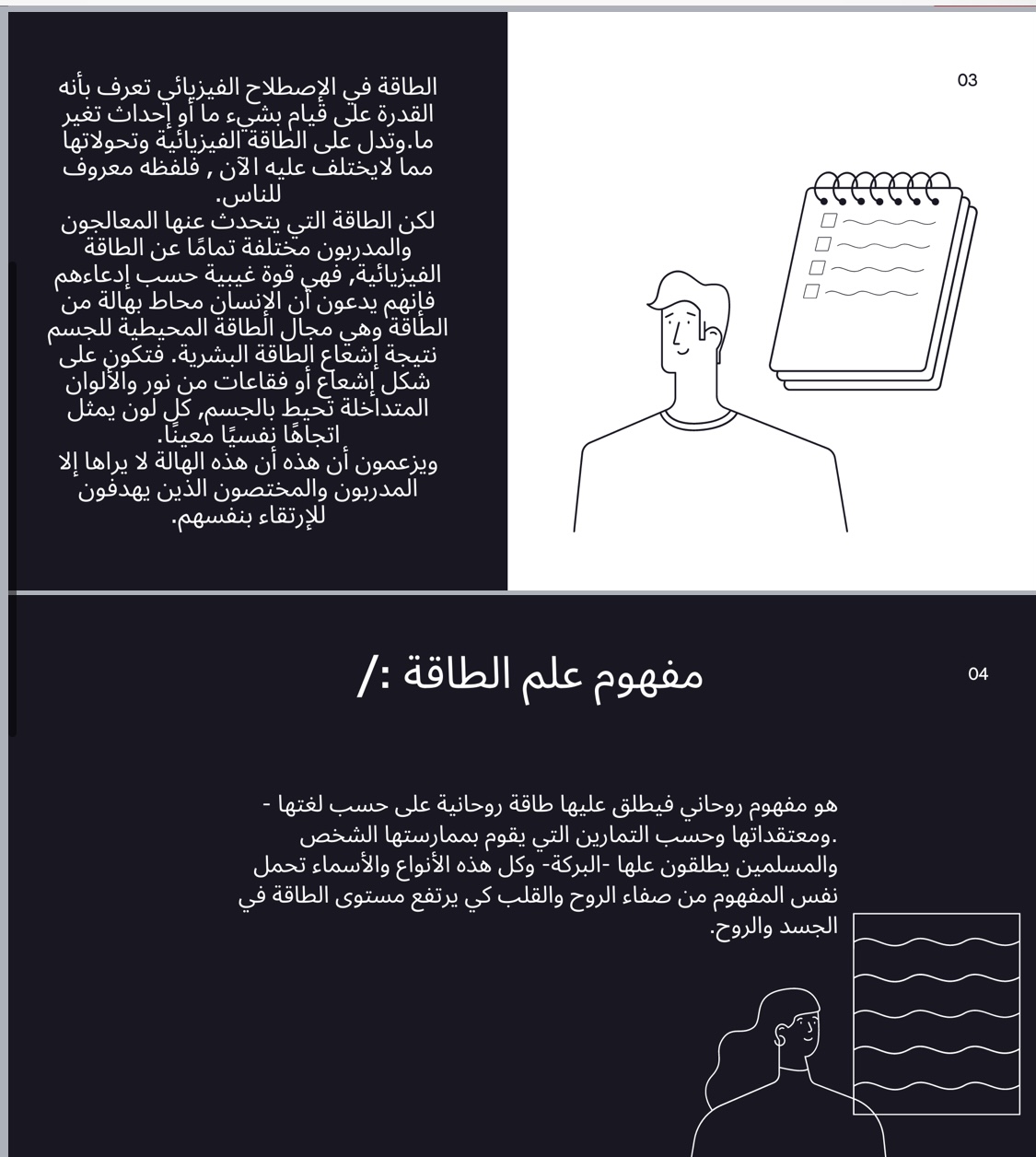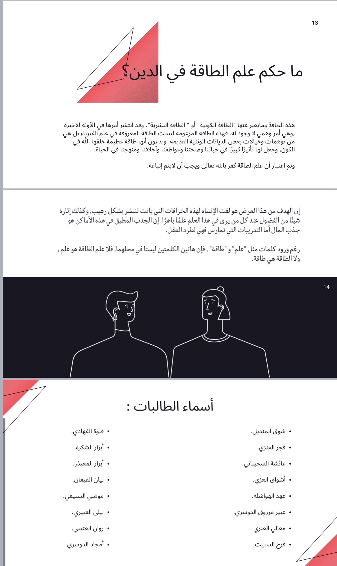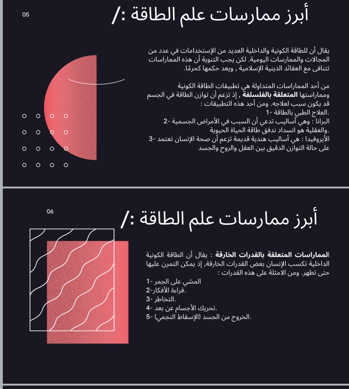 لكن نجد المعالجون بالطاقة ليسوا على صلة بينهم وبين الطاقة في مفهومها الفيزيائي لأنهم علي حسب ادعاءاتهم يقولون هذه طاقة غيبية لذلك تعتبر خرافة وليست حقيقة، وقد تم استعراض مقاطع فيديوهات متعلقة بالمحاضرة في خرفة علم الطاقة، وتأتي هذه المحاضرة كمساهمة في تعزيز مفهوم التطوع عند الطالبات وتحفيزهن للقيام بما يخدم مجتمعهن في ظل هذه الخرفة أو ما شابه ذلك.