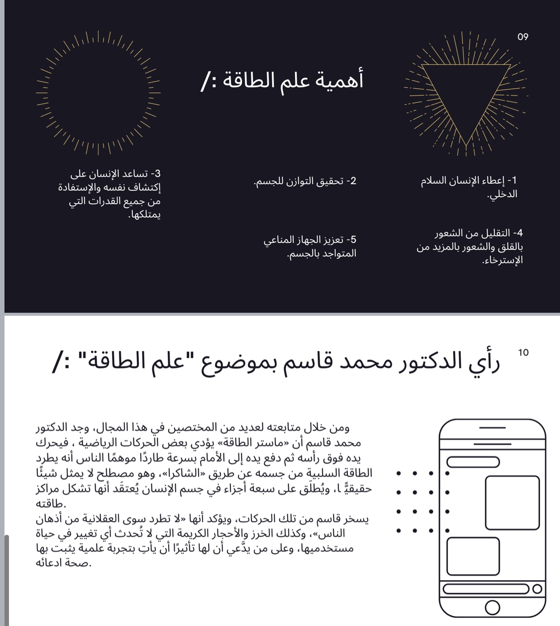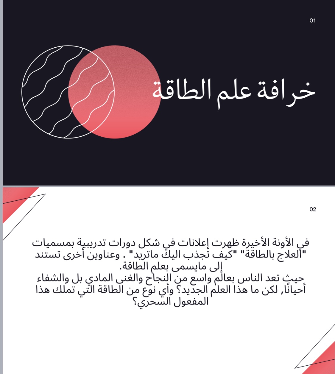 حيث بدأت المحاضرة بتعريف علم الطاقة الفيزيائي، وتوضيح الفرق بين معناها الفيزيائي والمعنى الذي يتحدث عنها المعالجون والمدربون بالطاقة، فلقد ظهرت في الآونة الأخيرة إعلانات في شكل دورات تدريبية بمسميات العلاج بالطاقة، فهي توهم الناس بعالم واسع من النجاح والغنى المادي بل الشفاء احياناً مع العلم بأن الطاقة في الاصطلاح الفيزيائي تعرف بأنه " القدرة على القيام بشيء ما أو إحداث تغير ما".