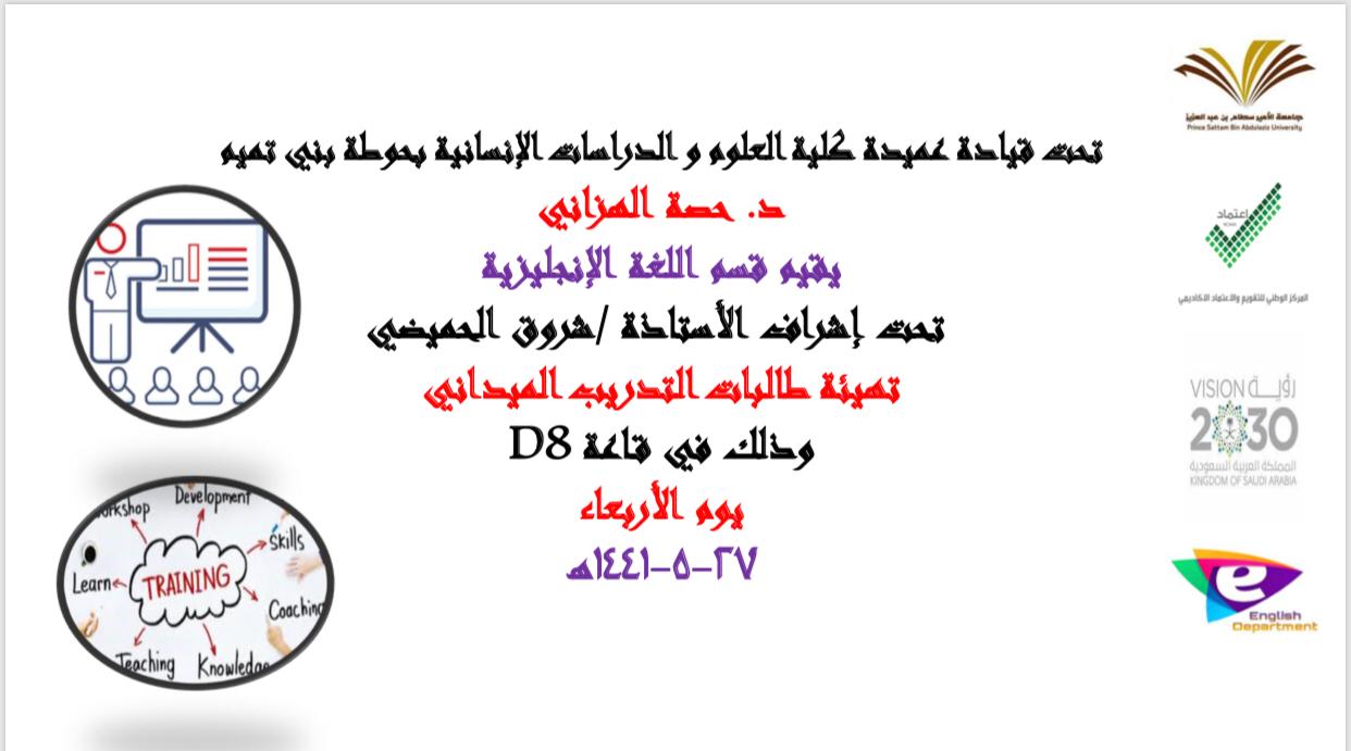 افتتحت هذه البرامج بتقديم قسم اللغة الإنجليزية, برنامج ( تهيئة طالبات التدريب الميداني). وذلك في اليوم الأربعاء الموافق:٢٧-٥-١٤٤١هـ. في تمام الساعة ٩:٣٠ صباحاً، تحت إشراف الأستاذة/ شروق الحميضي في مبنى اللغة الإنجليزية قاعة D6. وكان من أبرز أهداف البرنامج: