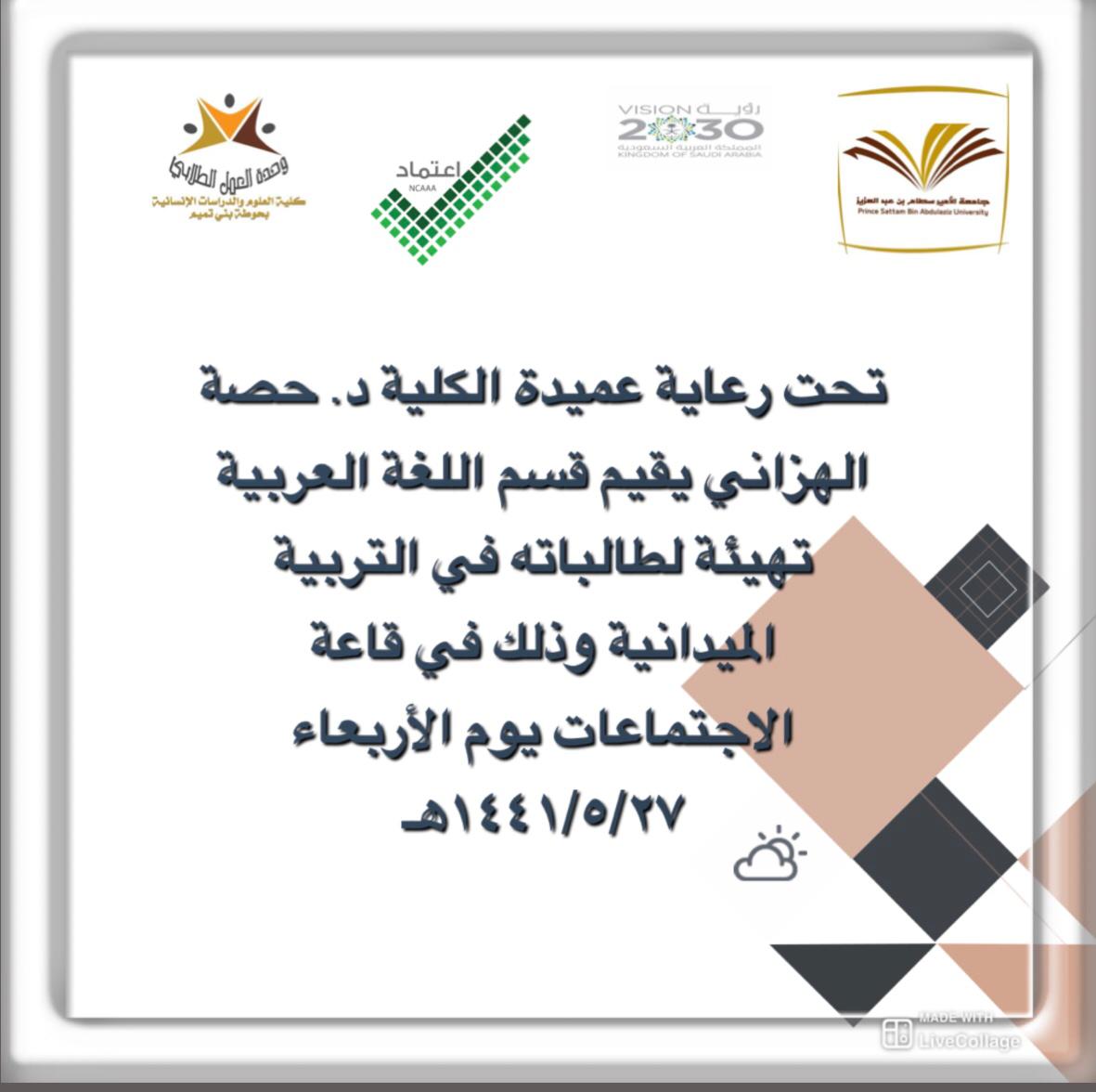 من جهة أخرى نظم قسم اللغة العربية برنامج تهيئة لطالبات التربية الميدانية في القسم بقاعة الاجتماعات, وذلك يوم الأربعاء الموافق: ٢٧-٥-١٤٤١هـ. في تمام الساعة 10صباحاً، وقد عرض فيها التعريف بالتربية الميدانية وأهدافها المعرفية والإجتماعية والمهارية، وكذلك تضمن توجيهات وإرشادات للطالبات، كما شاركت رئيسة القسم والأعضاء في إثراء الطالبات وتوجيههن بما يساعدهن في أداء التربية الميدانية بأكمل وجه، وقدمن نصائح للطالبات في بعض المشكلات والعوائق التي قد تواجه الطالبة المعلمة، وناقشن الطالبات في مخاوفهن وما يشكل عليهن من أمور، كما تم توزيع مختصر لإرشادات التربية الميدانية يخص قسم اللغة العربية.