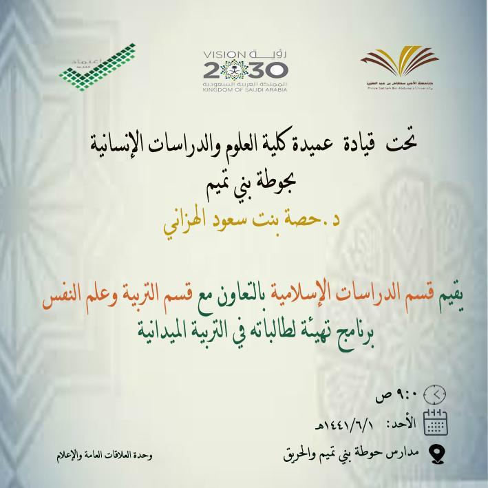 كما قدم قسم التربية وعلم النفس بالتعاون مع قسم الدراسات الإسلامية برنامج تهيئة لطالبات التربية الميدانية يوم الأحد الموافق :١٤٤١/٦/١هـ في تمام الساعة ٩:٠٠ صباحًا, تحت إشراف رئيسة قسم التربية وعلم النفس د. منال فارس ومشرفات التربية الميداني, في مدارس حوطة بني تميم والحريق. وتدور أهداف هذا البرنامج حول تهيئة الطالبة المعلمة للتدريب في الميدان, وقد تم توزيع الطالبات حسب الخطة في المدارس المقترحة. كما تم اجتماع مشرفات التربية الميداني مع مديرات المدارس ومع الطالبات المتدربات. وذلك لتهيئتهن للعمل الميداني واطلاعهن على مرافق المدرسة , ومعرفة المناهج والجداول المقترحة، والإطلاع على جميع الإرشادات والتوجيهات المطلوب الالتزام بها.