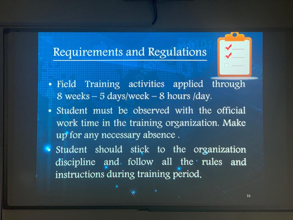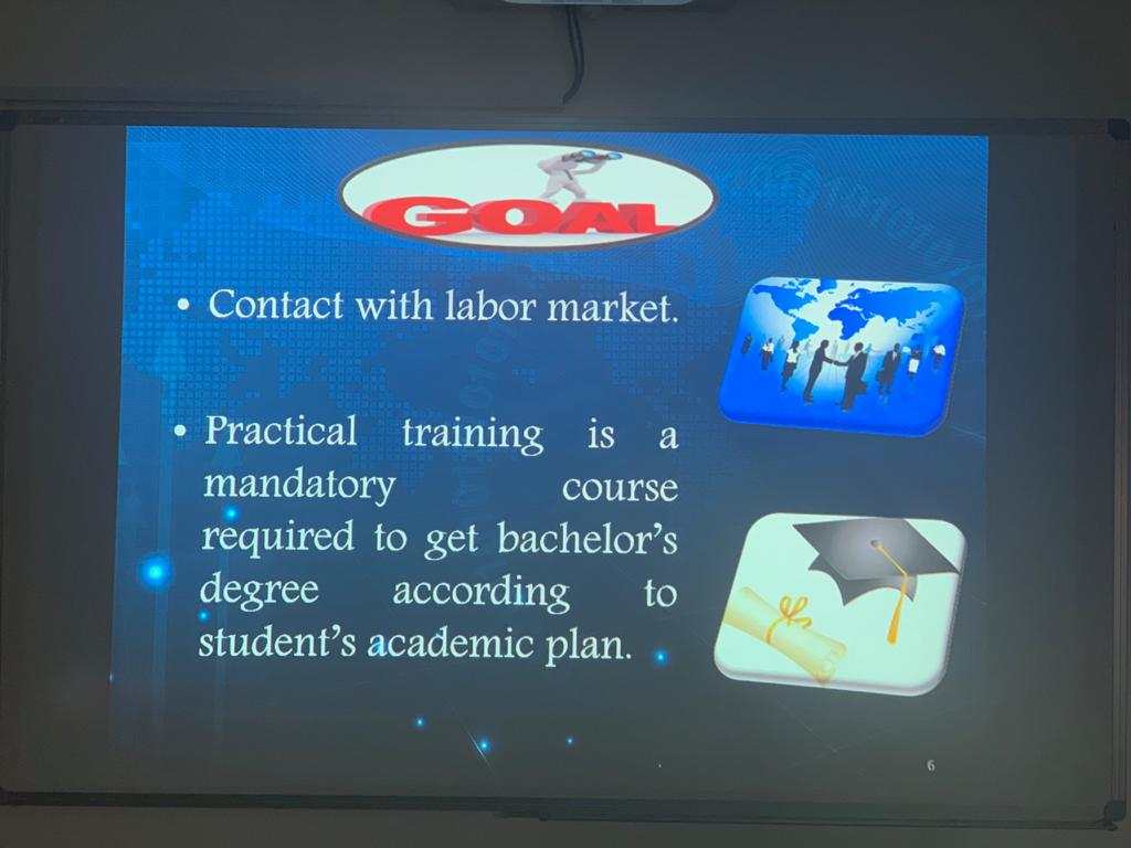 الالتقاء بطالبات التدريب الميداني و إعدادهن نفسياً و أكاديمياً ومهنياً للمرحلة التدريب القادمة، والتعريف بماهية التدريب الميداني, و ذكر الأهداف التي تسعى الجامعة للوصول إليها من جعل الطالبات يدربن في جهات تدريب مختلفة حتى تستطيع المتدربة تحقيق هذه الأهداف, ومعرفة المدخلات و المخرجات من فرصة التدريب الميداني، وما يجب على المتدربة الالتزام به خلال فترة تدريبها من المحافظة على أخلاقيات المهنة و احترام القوانين الخاصة بكل جهة تدريبية, أيضا توضيح متطلبات البدء والانتهاء من فترة التدريب الميداني بما في ذلك كتابة وتسليم التقارير اللازمة. وكان ذلك بحضور طالبات التدريب الميداني التابعات لقسم اللغة الإنجليزية للفصل الدراسي الثاني, و قد تم مناقشة بعض الأمور الغامضة على الطالبات و تم الإجابة على معظم التساؤلات حتى يتهيئن للمرحلة القادمة إن شاء الله.