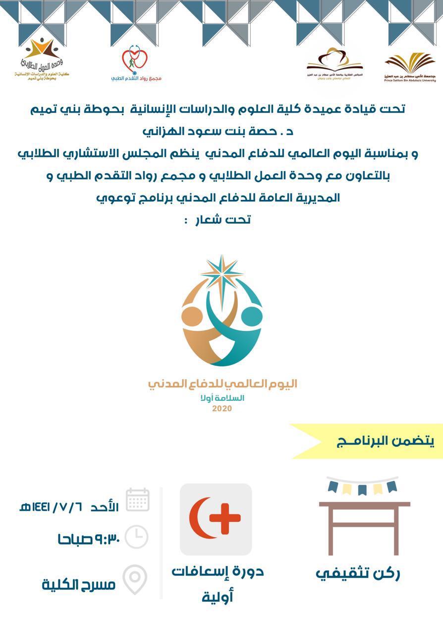 تقديراً لما تقوم به أجهزة الدفاع المدني من جهود عظيمة ومتواصلة للحفاظ على أمن وسلامة المجتمعات من خطر الكوارث والتقليل من آثارها المأساوية، نظم المجلس الاستشاري الطلابي ووحدة العمل الطلابي بالتعاون مع مجمع رواد التقدم الطبي والمديرية العامة للدفاع المدني برنامجاً تثقيفياً بمناسبة اليوم العالمي للدفاع المدني تحت شعار (السلامة أولاً) تحت قيادة عميدة كلية العلوم والدراسات الإنسانية بحوطة بني تميم د. حصة بنت سعود الهزاني، وذلك في يوم الأحد الموافق: ٦ / ٧/ ١٤٤١هـ. بإشراف منسقة المجالس الطلابية أ. منيره إبراهيم التميمي و أ. ندى التميمي بوحدة العمل الطلابي. بهدف التوعية بأهمية السلامة كسلوك وتطبيق في حياة الناس اليومية بحيث يكون الأخذ بمبدأ السلامة أولاً قبل أي عمل أو سلوك ينطوي على خطر في أعمالنا وسلوكنا اليومي في جميع مجالات الحياة، تضمن البرنامج إقامة ركن تثقيفي يحتوي على منشورات توعوية مقدمة من المديرية العامة للدفاع المدني، بالإضافة إلى دورة تدريبية عن الإسعافات الأولية للحوادث المنزلية قدمتها كلاً من الطبيبة مي عوض والطبيبة هالة عاطف. حيث تهدف هذه الدورة إلى التعريف بالإسعافات الأولية وأهميتها في الحد من الحوادث وتقليل أثرها، وكيفية تقديم الإسعافات اللازمة في حالات الطارئة مثل ( الحروق، الجروح، الاختناق، الغيبوبة). حيث أن التعامل مع مثل هذه الحالات بشكل صحيح وعلى أسس علمية يشكل ضرورة هامة للحفظ على حياة الأشخاص.
