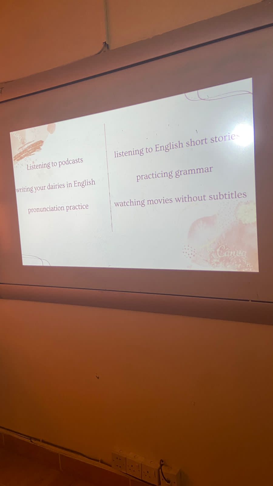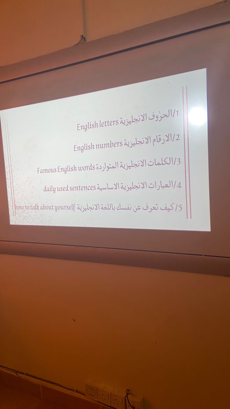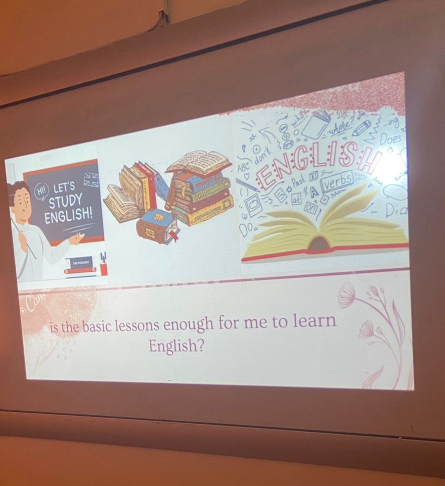 تناولت الطالبة مقدمة عن أساسيات قواعد اللغة الإنجليزية وكيفية تكوين أسئلة وجمل صحيحة وفهم القواعد اللغوية وتحدثت أيضا عن المهارات الأساسية (استماع- تحدث- قراءة - كتابة) وكيفية تطويرها وأيضا مهارات الحوار في الحياة اليومية.