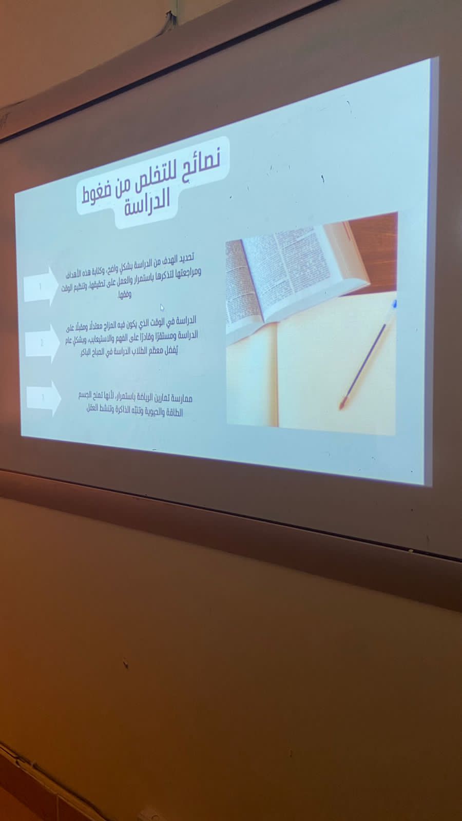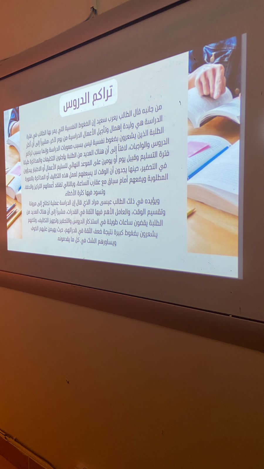 نظم المجلس الاستشاري الطلابي بإشراف أ. منيرة إبراهيم التميمي وبرعاية كريمة من عميدة كلية العلوم والدراسات الإنسانية بحوطة بني تميم د. حصة بنت سعود الهزاني برنامجاً تحت عنوان: (كيف تتعاملين مع الضغوط الدراسية) قدمته رئيسة المجلس الطلابي الطالبة مي العميره، وذلك يوم الثلاثاء الموافق 29/ 8/ 1444هـ.