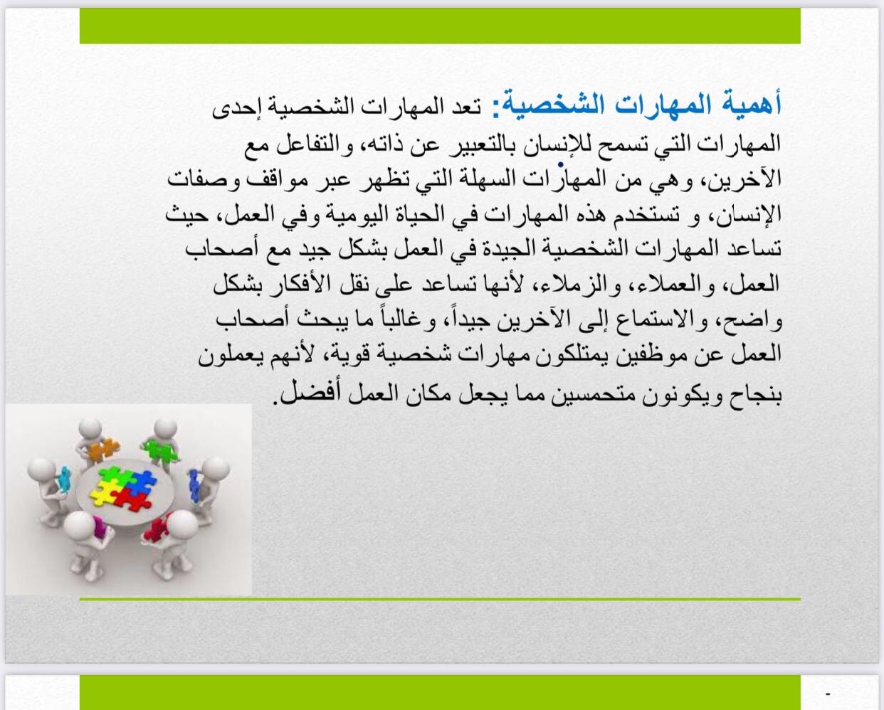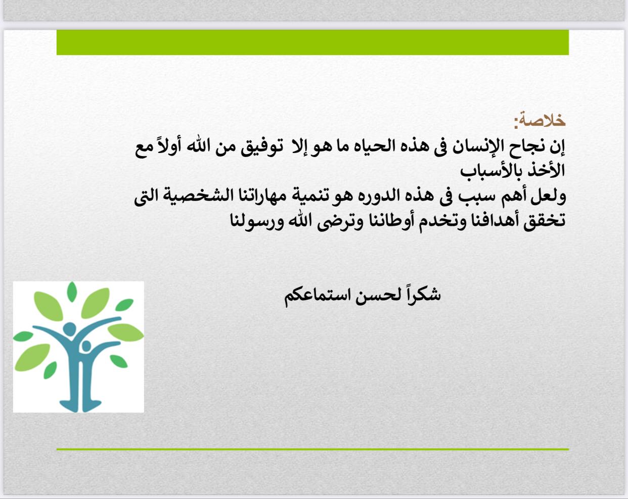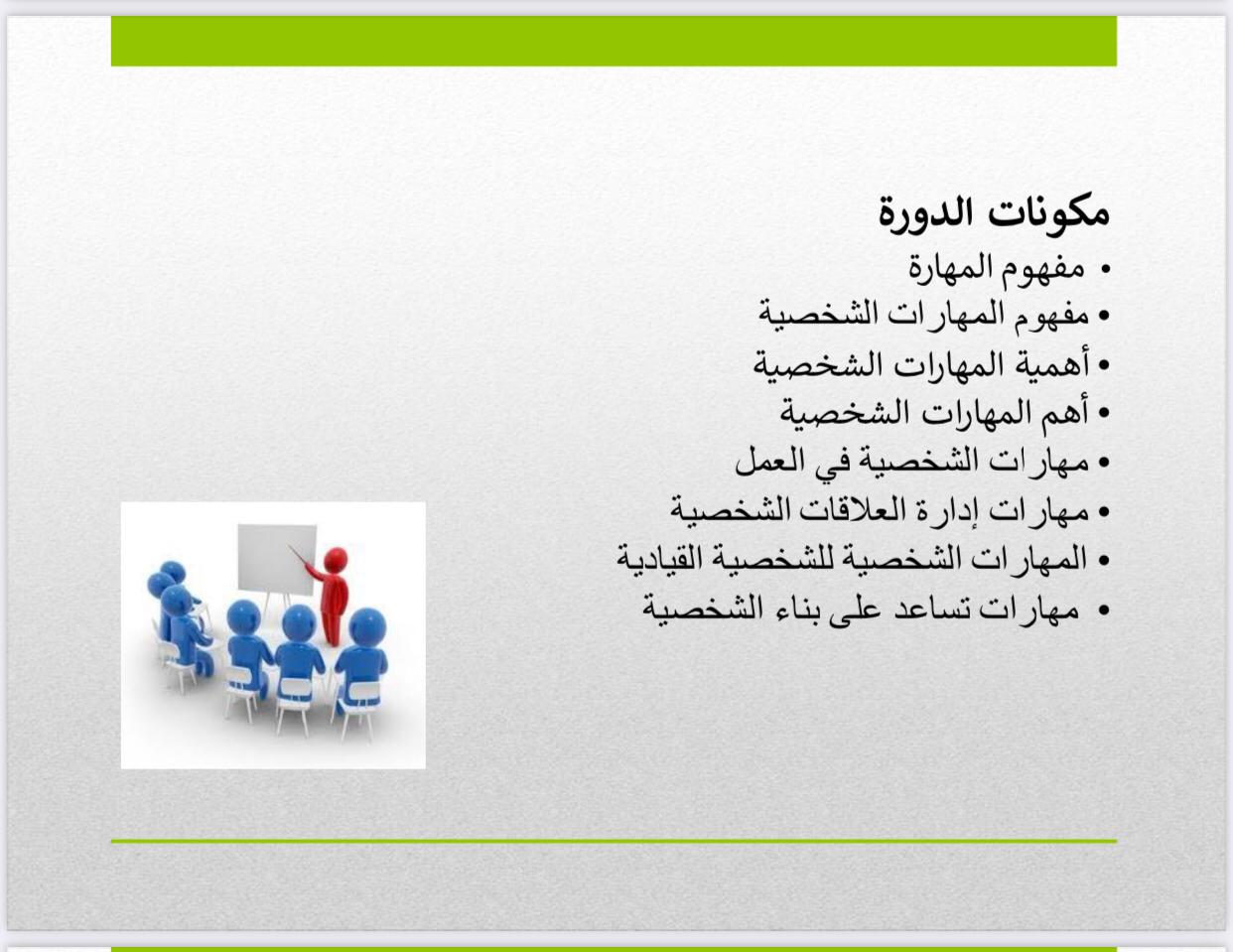 قدمت الدورة مفهوم المهارات الشخصية وأهميتها وأهم المهارات الشخصية في العمل وفي الشخصية القيادية.