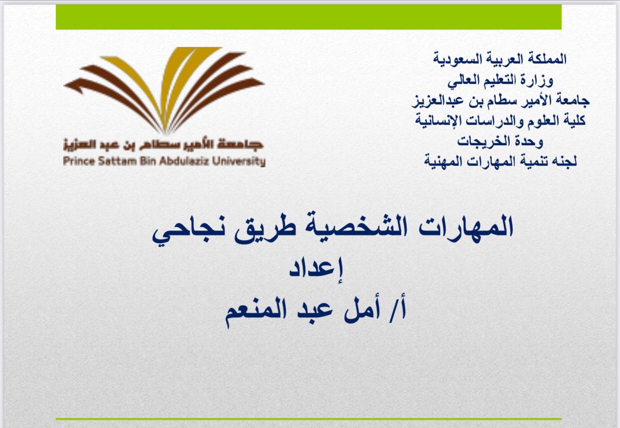 إن تعلم المهارات من أفضل الطرق لتغيير أسلوب الحياة بصورة إيجابية، حيث نظمت وحدة الخريجات لجنة تنمية المهارات المهنية بإشراف الدكتورة نحا القحطاني دورة بعنوان (مهاراتي الشخصية طريق نجاحي) تحت رعاية عميدة كلية العلوم و الدراسات الإنسانية بحوطة بني تميم، الدكتورة حصة بنت سعود الهزاني، وذلك في يوم الأربعاء الموافق: ١٤٤٢/٨/٤هـ، الساعة الثامنة مساءً عن طريق برنامج زوم من وتقديم الأستاذة أمل عبدالمنعم.