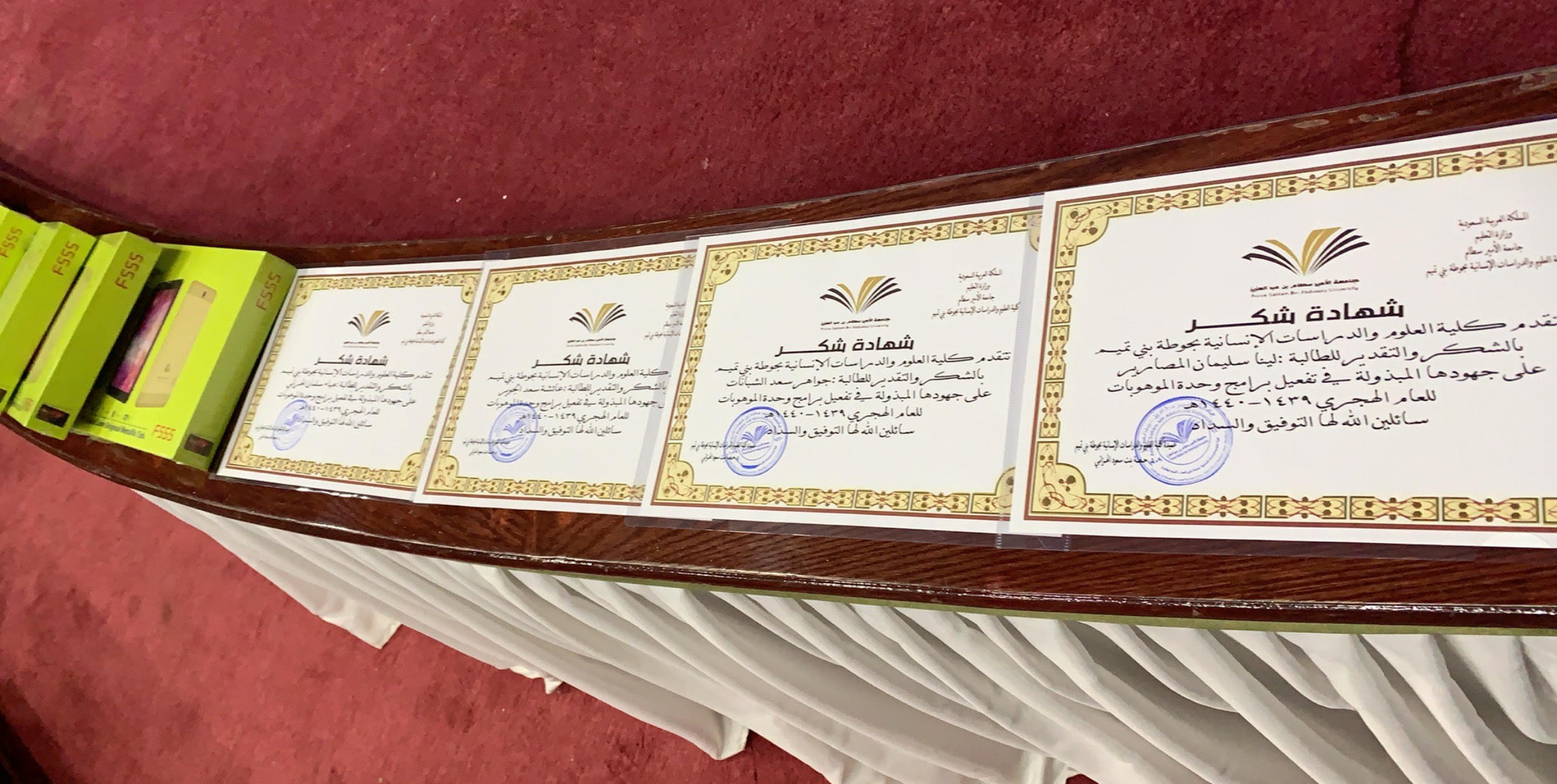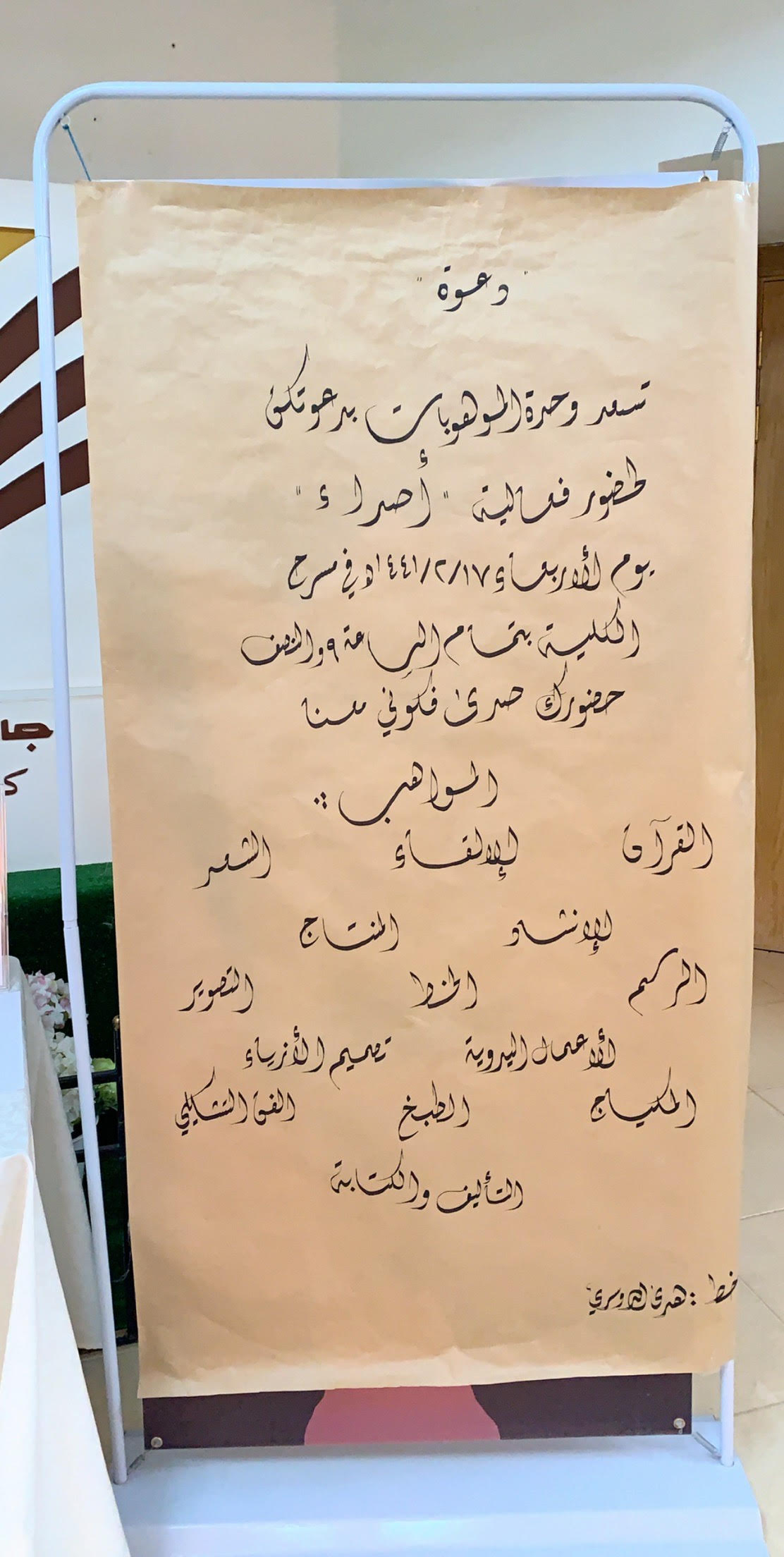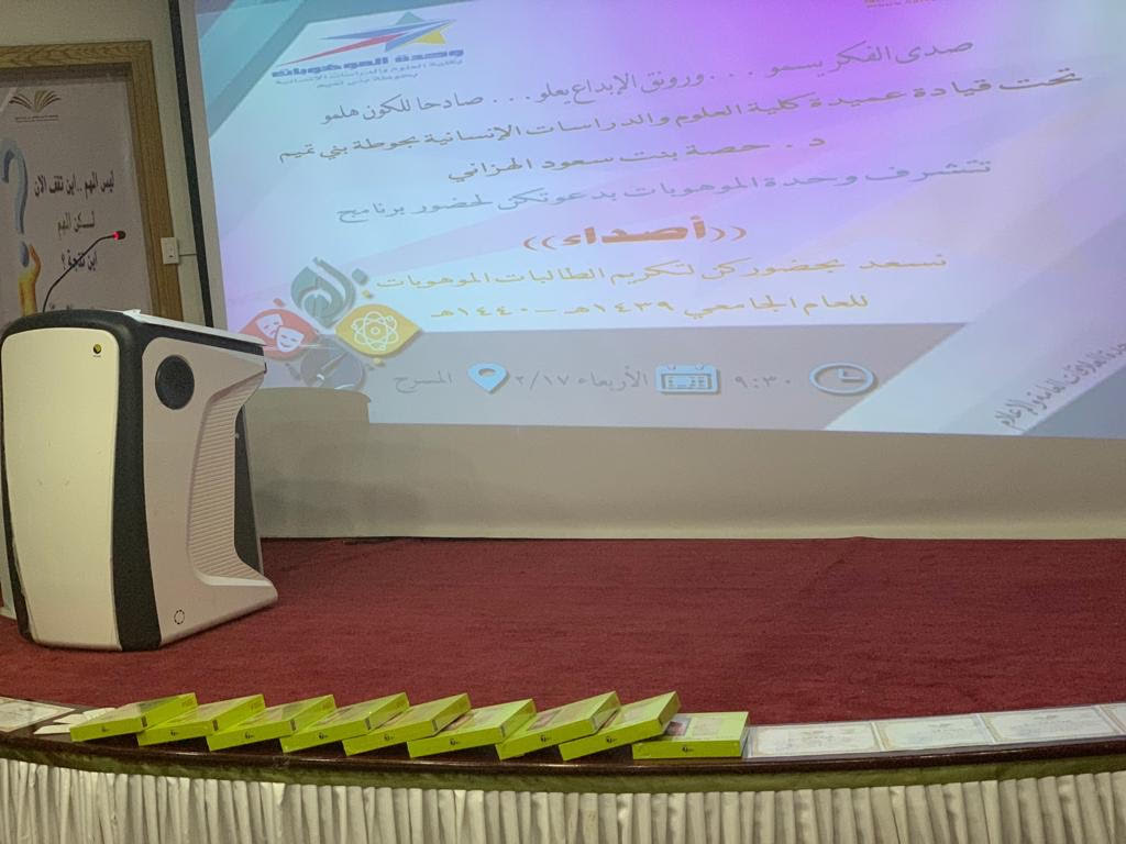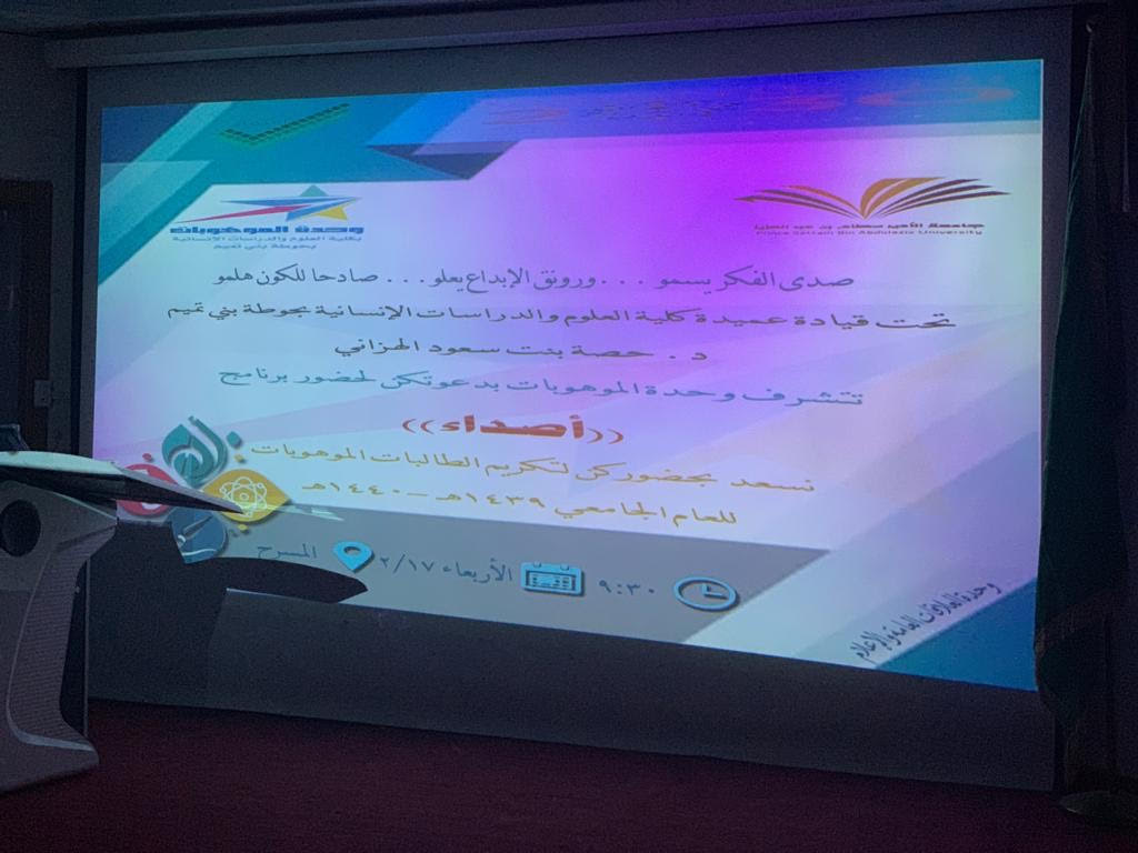 تعتبر الموهبة واكتشافها كنز لا يستهان به وثروة إنسانية يجب آلا تهدر، فمن هذا المنطلق و تحت قيادة عميدة كلية العلوم والدراسات الإنسانية بحوطة بني تميم د/حصه بنت سعود الهزاني، قدمت وحدة الموهوبات ممثلة برئيستها ا/مها الصقعبي والمساعدة لها ا/منال الدحيم ، فعالية بعنوان أصداء وذلك يوم الأربعاء الموافق :١٤٤١/٢/١٧هـ بتمام الساعة التاسعة والنصف في مسرح الكلية، حيث كان لضجيج الإعلان أثر في حضور الطالبات والمنسوبات، بدأت الفعالية بمقدمة من احدى الطالبات الموهوبات، تلى ذلك تلاوة من الذكر الحكيم، وتليها كلمة العميدة حيث أشادت باهتمام المملكة العربية السعودية بالموهبة وسمو جامعة الأمير سطام بن عبدالعزيز بها ورعايتها ، وأن كليتنا تمثل" الرؤية ٢٠٣٠" التي تسعى للوصول نحو التطور والقمم، ومن ثم قُدم مونتاج يصور أعمال الطالبات الموهوبات ومشاركاتهم للفعاليات والبرامج خلال فترة السنتين الماضية، كما ألقت رئيسة الوحدة كلمتها التي رحبت فيها بالحضور وأشارت إلى المراكز التي حازت عليها كليتنا من الموهوبات وقدمت لهن الشكر والاستعداد التام لاستقبال المشاركات في المواهب لتنميتها وتطويرها، والحث على التسجيل في استمارة الجامعة التي تنهض بمستوى الموهوبات. وقد قدمت العميدة لهن شهادات الشكر وهدايا قيمة ومن ثم كان التكريم للطالبات الموهوبات رمز عطاء وسجل وفاء ومنبع حماس للالتحاق بهذا الركب.
