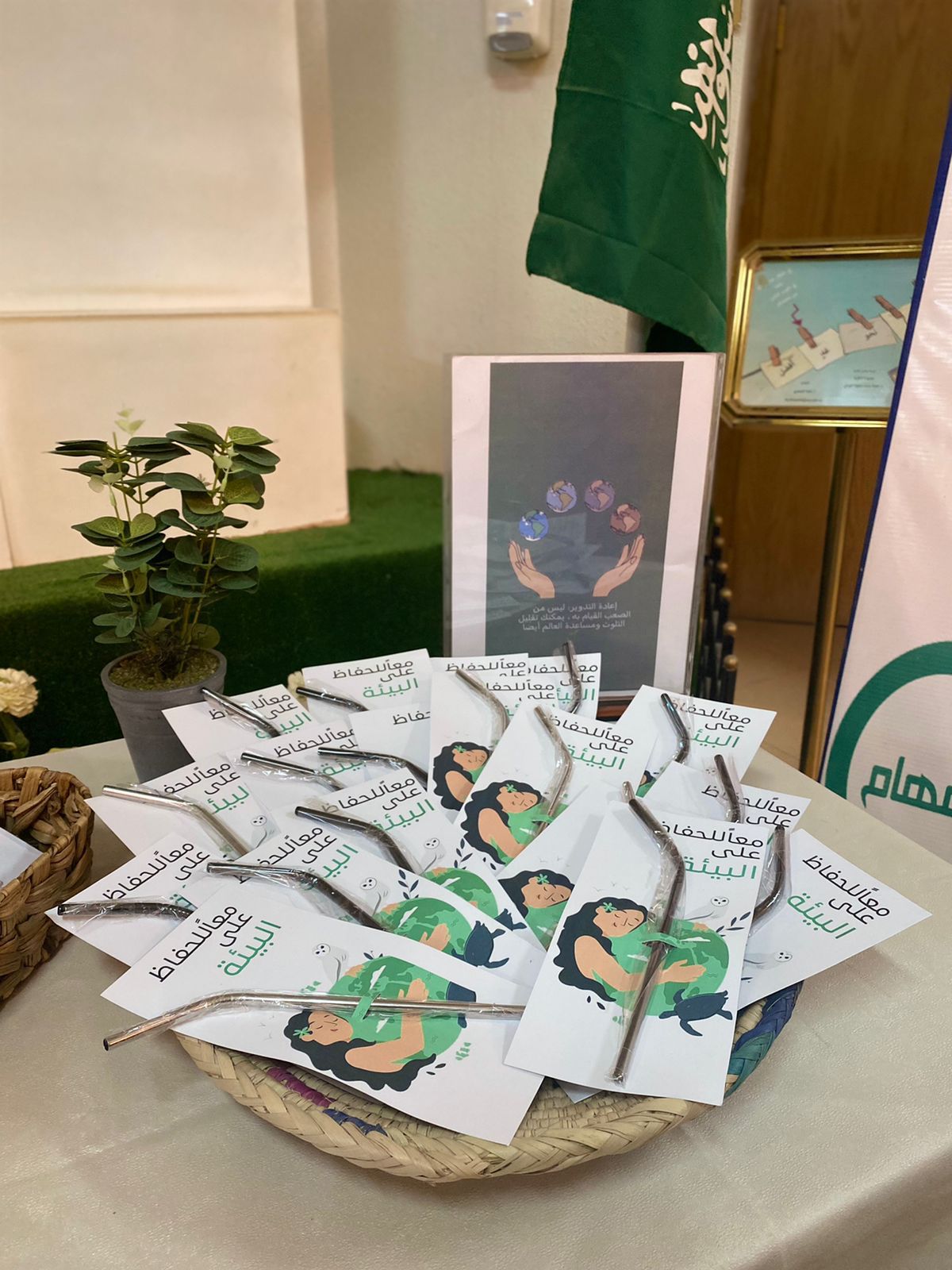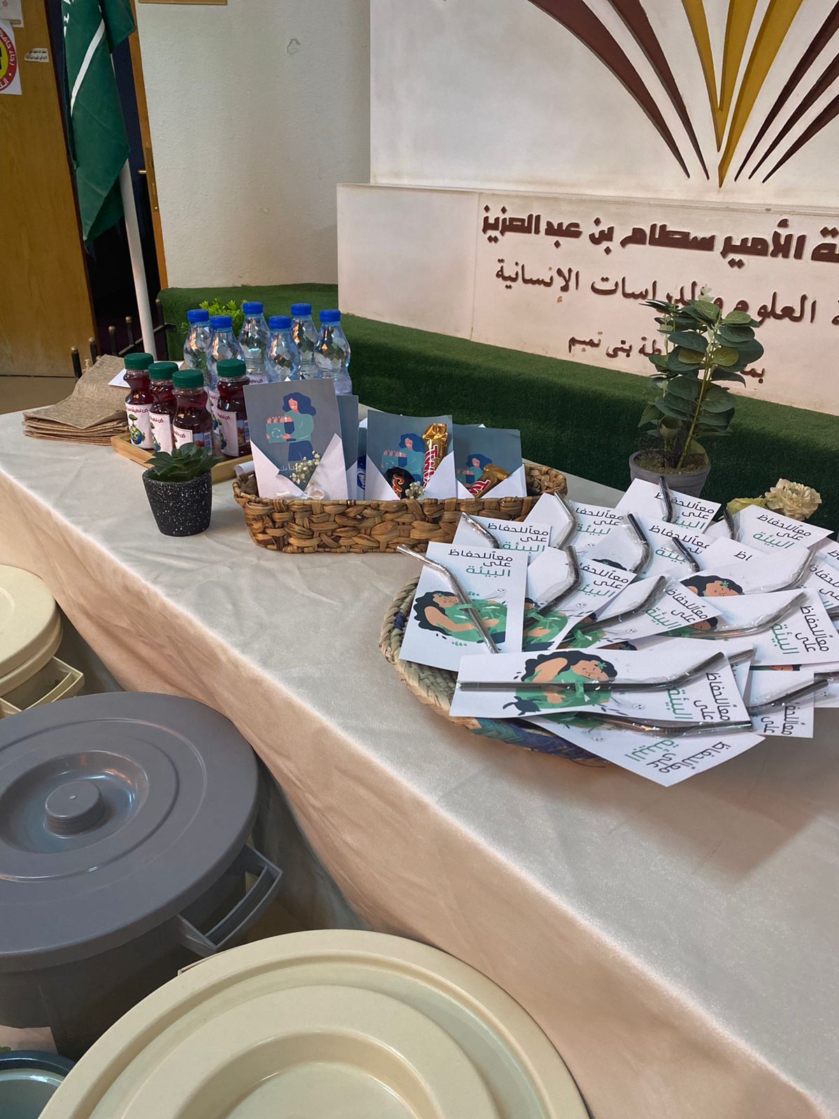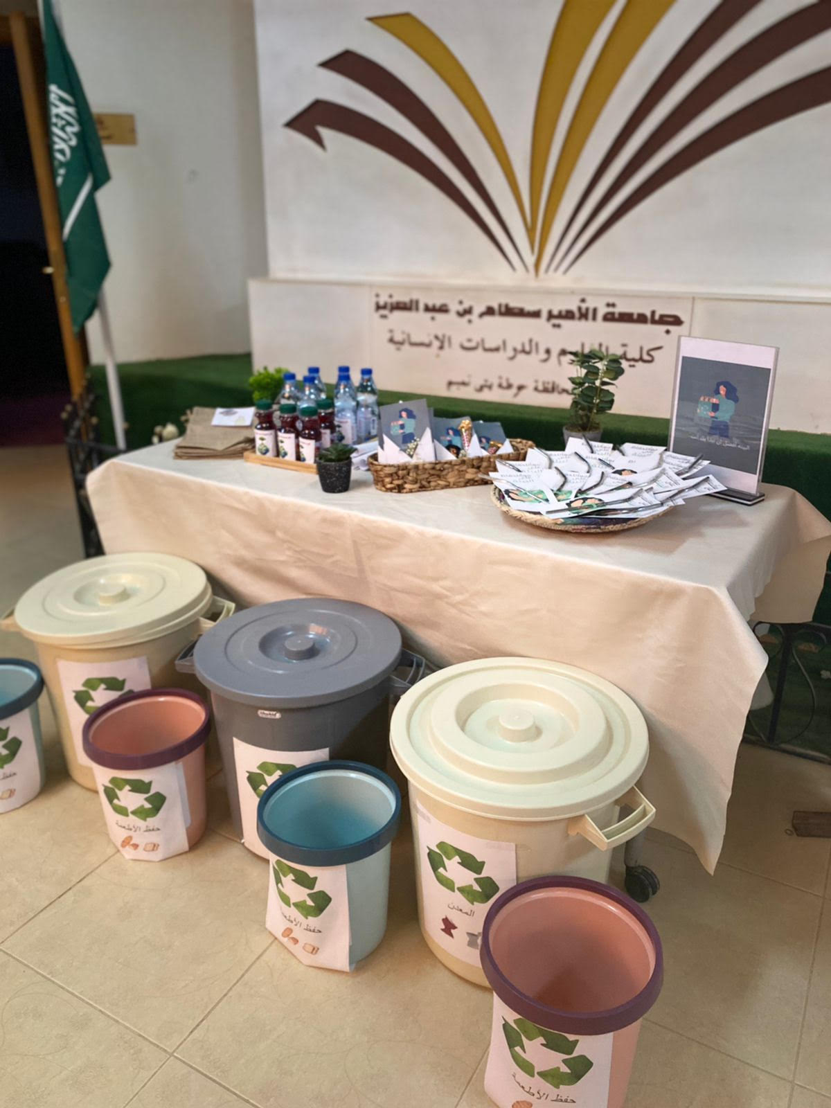 عرض توضيحي وركن توعوي عن فائدة إعادة التدوير وإدارة النفايات للمحافظة على البيئة في ساحة الكلية احتوى على توزيعات وسلال إعادة تدوير وأكياس قماشية لاستبدال الأكياس البلاستيكية، وقد حضر الفعالية عدد من رئيسات الأقسام وأعضاء هيئة التدريس ومنسوبات وطالبات الكلية.