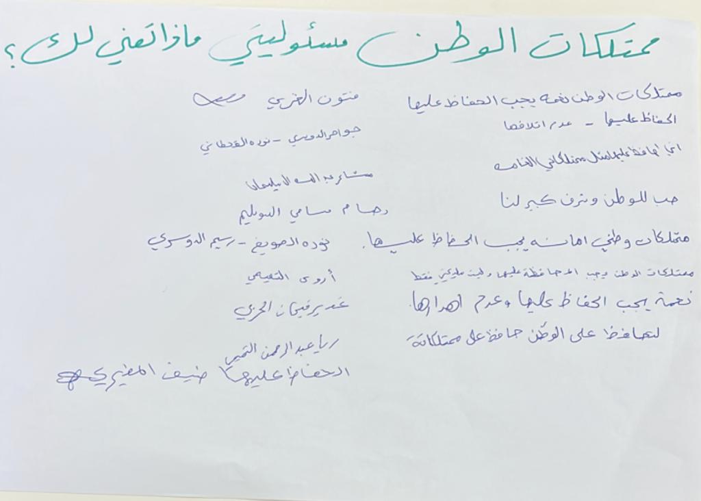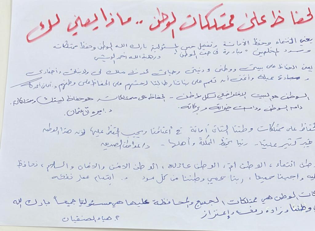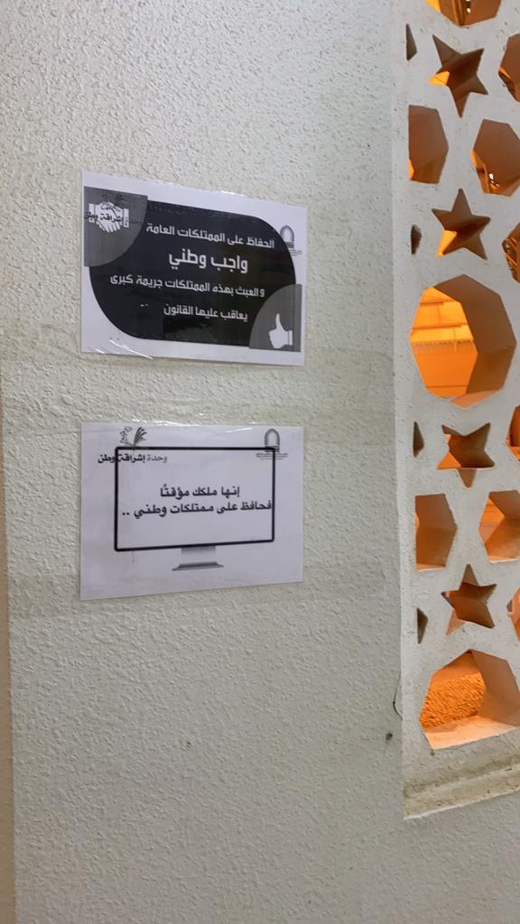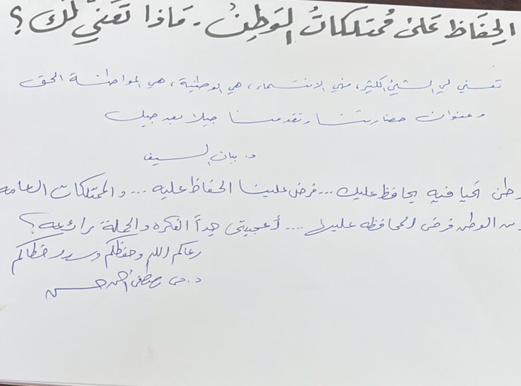 كما سجلت عبارات جميلة ممتدة من عميدة الكلية ووكيلة الكلية ورئيسات الأقسام كما تم التجوال بين مقاعد الطالبات الخارجية لتوضيح أهمية الممتلكات وواجبنا نحوها وسجلن بصمات لهن في ذلك ساعين بما نملك لرد جميل هذا الوطن في الحفاظ على ما يبذله ويقدمه لنا.