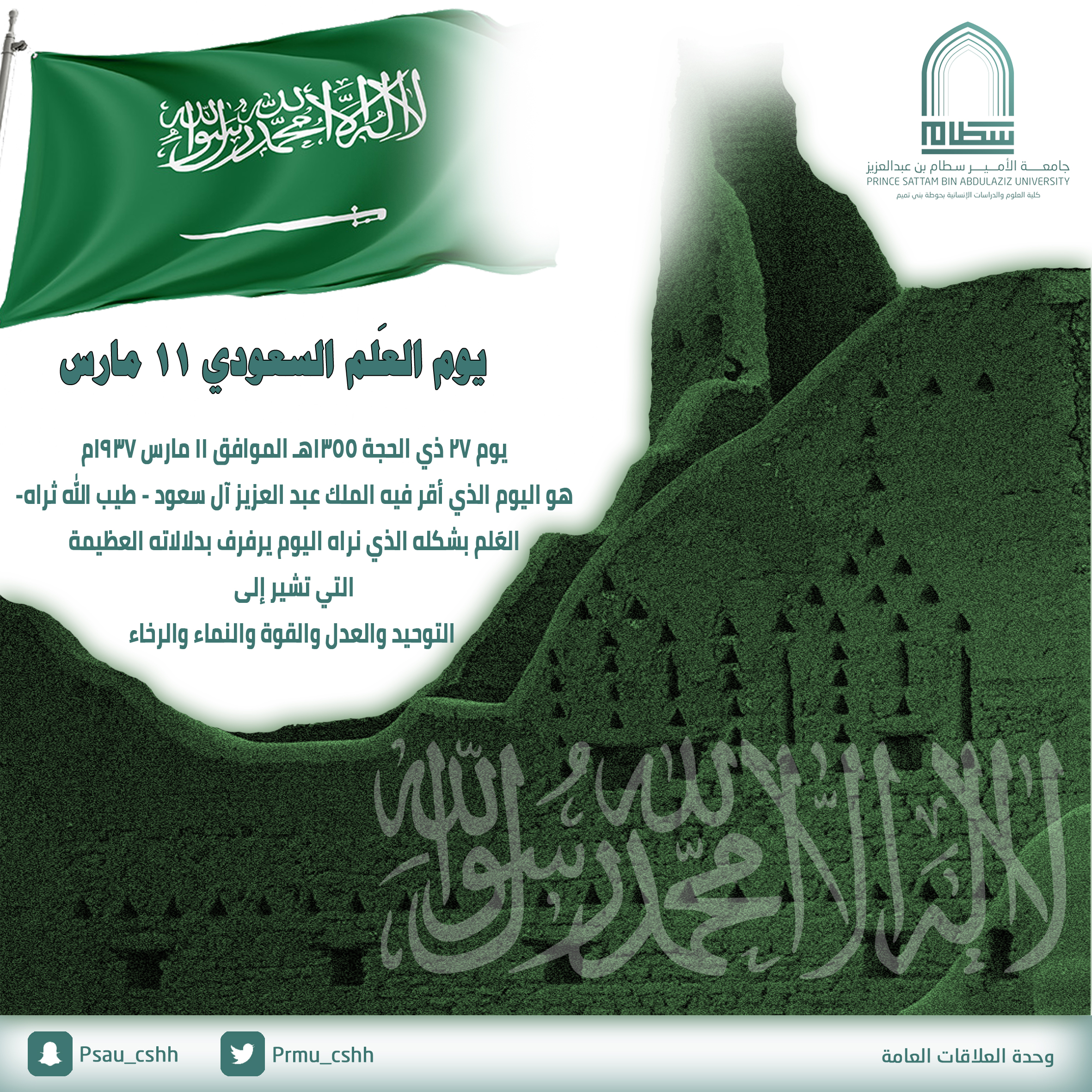 أعلن الديوان الملكي السعودي، قرار خادم الحرمين الشريفين الملك سلمان بن عبد العزيز آل سعود، إصدار أمرًا ملكيًا بجعل يوم 11 مارس يوم خاص بالاحتفاء بالعَلم السعودي، وبكل فخر ونماء ورفعة وعطاء تسعد وحدة إشراقة وطن بكلية العلوم والدراسات الإنسانية بحوطة بني تميم تحت رعاية عميدة الكلية د. حصة بنت سعود الهزاني بتنظيم برنامجًا بعنوان (مسيرة عَلم) من تنفيذ أ. منال الدحيم والفريق التابع له وتحت إشراف العلاقات العامة بالكلية ، وبحضور وكيلة الكلية للشؤون التعليمية والأكاديمية د. أميرة العثمان ومنسوبات وطالبات الكلية.