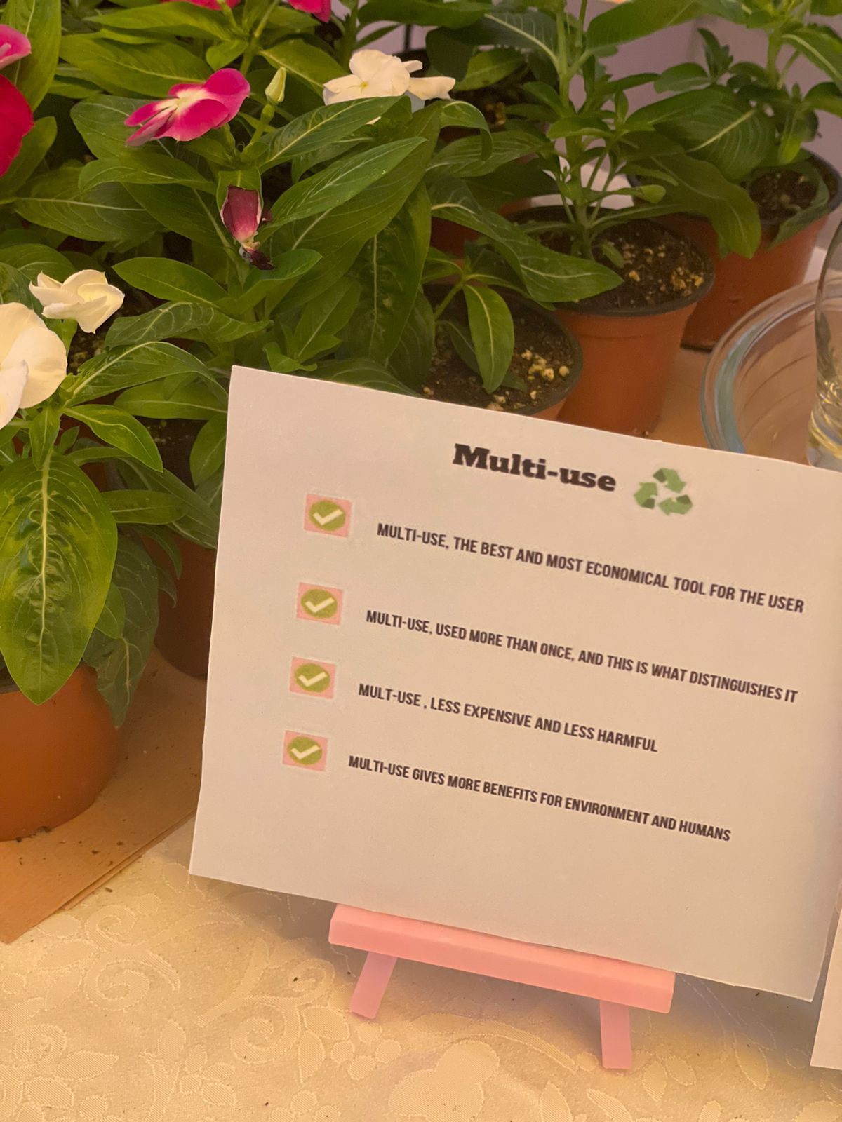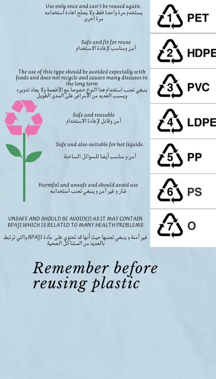 وتهدف هذه الفعالية إلى نشر التوعية البيئية وطرح المشاكل التي تهدد البيئة فهي جزء منا "فحافظنا لها اليوم يحفظ مستقبلنا بالغد"،وقد تضمنت الفعالية توزيعات ونشرات توعوية، حيث تم عرض لوحات توضيحية عن الأواني البلاستيكية متعددة الاستعمال والأواني ذات الاستعمال الواحد مع وجود عينات مرئية، كما تم توزيع ٢٠ كيس قماشي كبديل صديق للبيئة عن أكياس البلاستك، وتم توزيع ٢٠ شتلة من الزهور متعددة الألوان للتشجيع على ثقافة الغرس والزراعة، بالإضافة إلى توزيع استبانة على الزائرات تناقش أبرز التحديات المتعلقة بالبيئة.