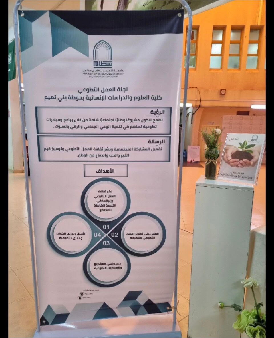 تحت رعاية عميدة كلية العلوم والدراسات الإنسانية بحوطة بني تميم د. حصة بنت سعود الهزاني نظم فريق غيث التطوعي (حملةً للتعريف بالعمل التطوعي)، وذلك خلال أسبوع كامل من يوم الأحد الموافق 16/ 3/ 1445هـ إلى يوم الخميس 20/ 3/ 1445هـ في بهو الكلية.