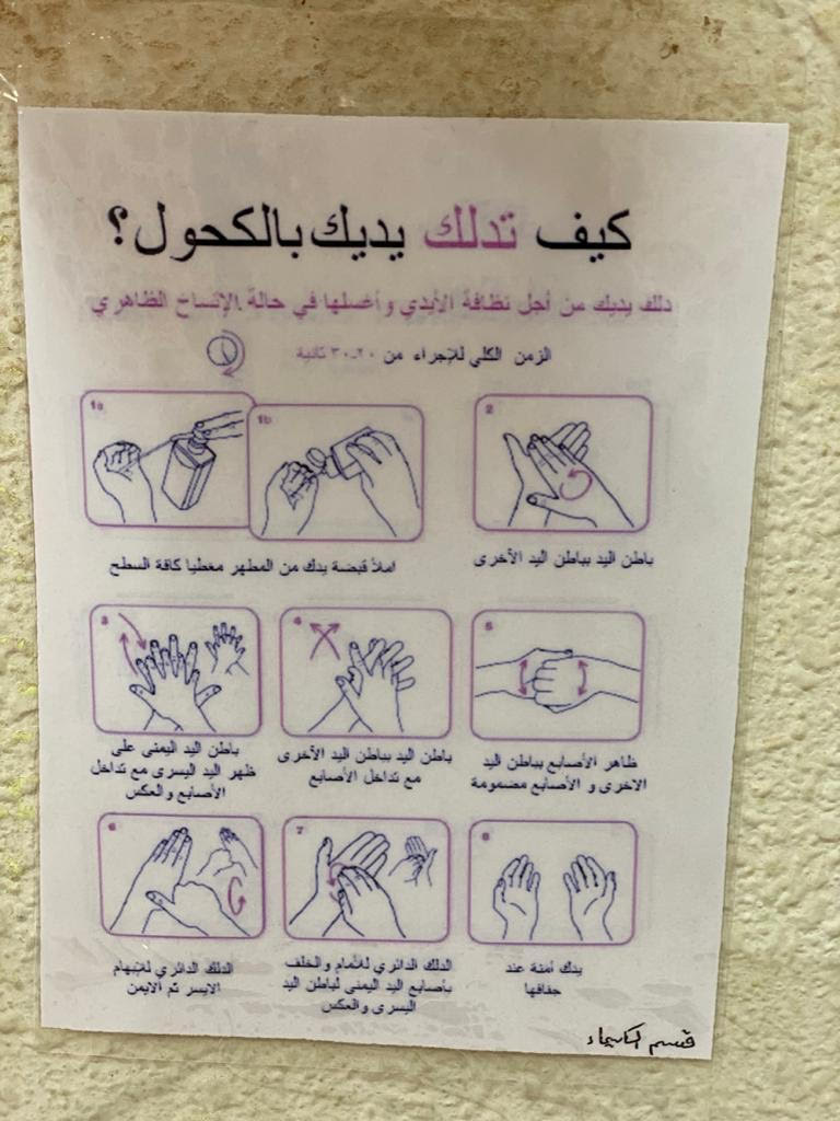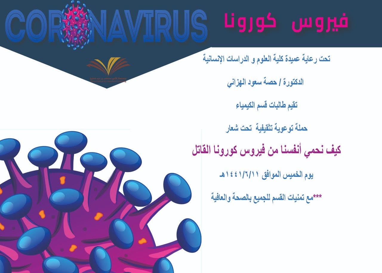 في إطار الحملة التثقيفية التوعوية التي ينظمها قسم الكيمياء بكلية العلوم والدراسات الإنسانية بحوطة بني تميم تحت قيادة عميدة الكلية سعادة الدكتورة/ حصة بنت سعود الهزاني. قامت طالبات المستوى الرابع والسادس بقسم الكيمياء بحملة توعوية تحت شعار ( كيف نحمي أنفسنا من فيروس كورونا القاتل) وذلك يوم الأربعاء الموافق:1441/6/11هـ حيث قمن بجولة داخل القاعات الدراسية ومكاتب أعضاء هيئة التدريس والإداريات، لتقديم بعض الإرشادات العامة التي تتعلق بالوقاية من الفيروس. وتم خلالها توزيع الكمامات والقفازات الطبية . ونشر اللوحات الإرشادية في مرافق الكلية .