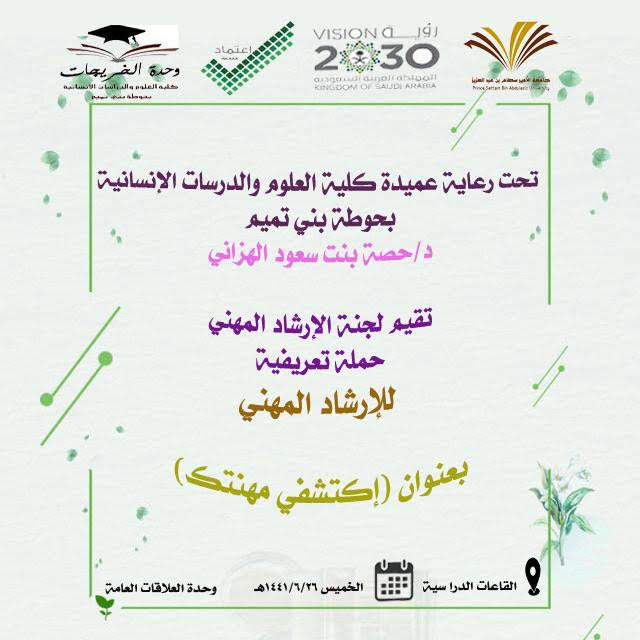 تسعى كلية العلوم والدراسات الانسانية بحوطة بني تميم بقيادة العميدة الدكتورة/ حصة سعود الهزاني إلى توجيه الطالبات للعمل والمهنة التي يمكن من خلالها استثمار طاقاتهن فالأمم تُبنى بسواعد أبنائها، وايضاً لتحسين مستوى معيشتهن وزيادة دخلهن، ومن هذا المنطلق أقامت لجنة الارشاد المهني بوحدة الخريجات برنامج ( اكتشفي مهنتك ) عباره ركن تعريفي يحتوي علي بعض المهن، و ذلك لتمكين الطالبات من النظر إلى جميع المسارات المهنية وقطاعات سوق العمل على نحو متساوي بما فيها القطاع الخاص والعمل الحر . وتم ذلك في يوم الخميس الموافق: 1441/6/26هـ . في تمام الساعة9:20 صباحاً.
