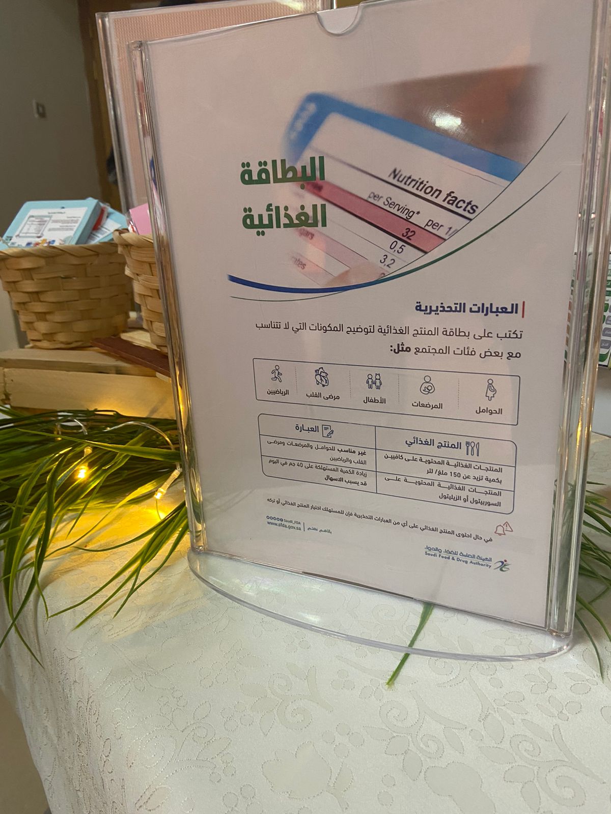 تعتبر المعلومات المقدمة على المنتجات الغذائية أحد أهم الوسائل المباشرة لتوصيل المعلومات إلى المستهلك. بطاقة المواد الغذائية (Food Label) هي متطلب أساسي لكل منتج غذائي ويتم العمل بها في معظم دول العالم حيث يتم توضيح (السعرات الحرارية، كمية البروتين، السكريات، الدهون المشبعة وغير المشبعة، الكوليسترول بالإضافة إلى الفيتامينات والمعادن) وذلك من أجل المحافظة على صحة الفرد. ولأهمية هذه البطاقة كبطاقة هوية للمنتج لا غنى عنها وبرعاية كريمة من سعادة عميدة كلية العلوم والدراسات الإنسانية بحوطة بني تميم د. حصه بنت سعود الهزاني، نظم المجلس الاستشاري الطلابي لقسم الكيمياء بإشراف أ. تهاني عبدالرحمن الجويعد و أ. منيره إبراهيم التميمي يوم الأحد الموافق: 19/ 7/ 1443هــــ الساعة 9:30 ركن توعوي تضمن التعريف بالبطاقة الغذائية وأهم المتطلبات التي يجب توافرها في البطاقة الغذائية وإرشادات التعامل معها بهدف رفع مستوى الوعي بأهمية قراءة محتويات البطاقة الغذائية لعبوات المنتجات الغذائية مما يسهم في اختيار الغذاء المناسب من ناحية القيمة الغذائية ومدى ملائمته للحالة الصحية للمستهلك.