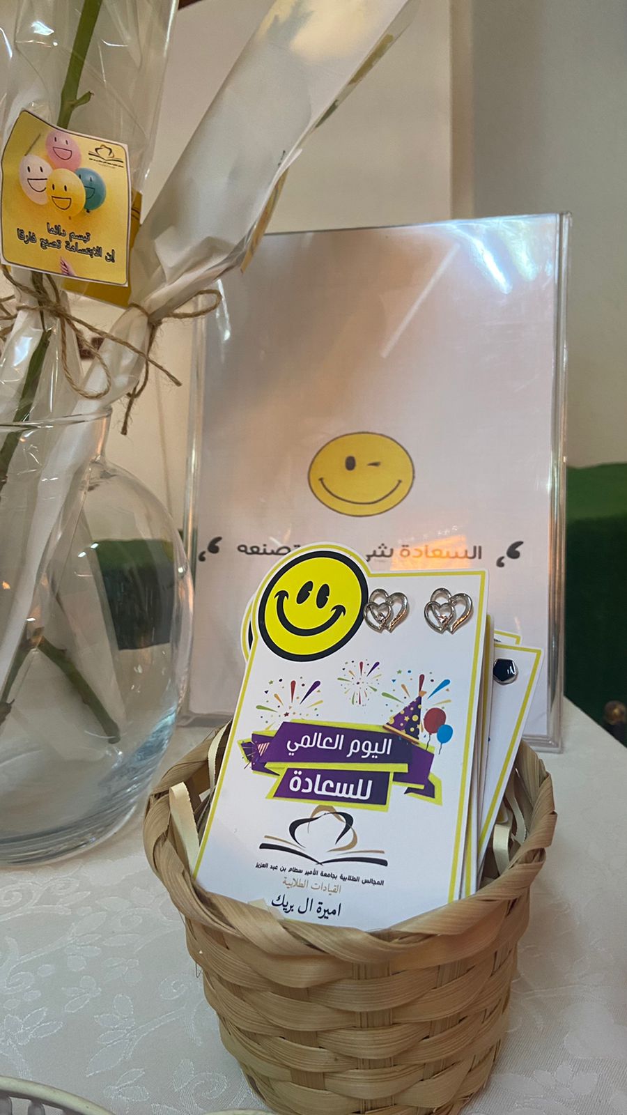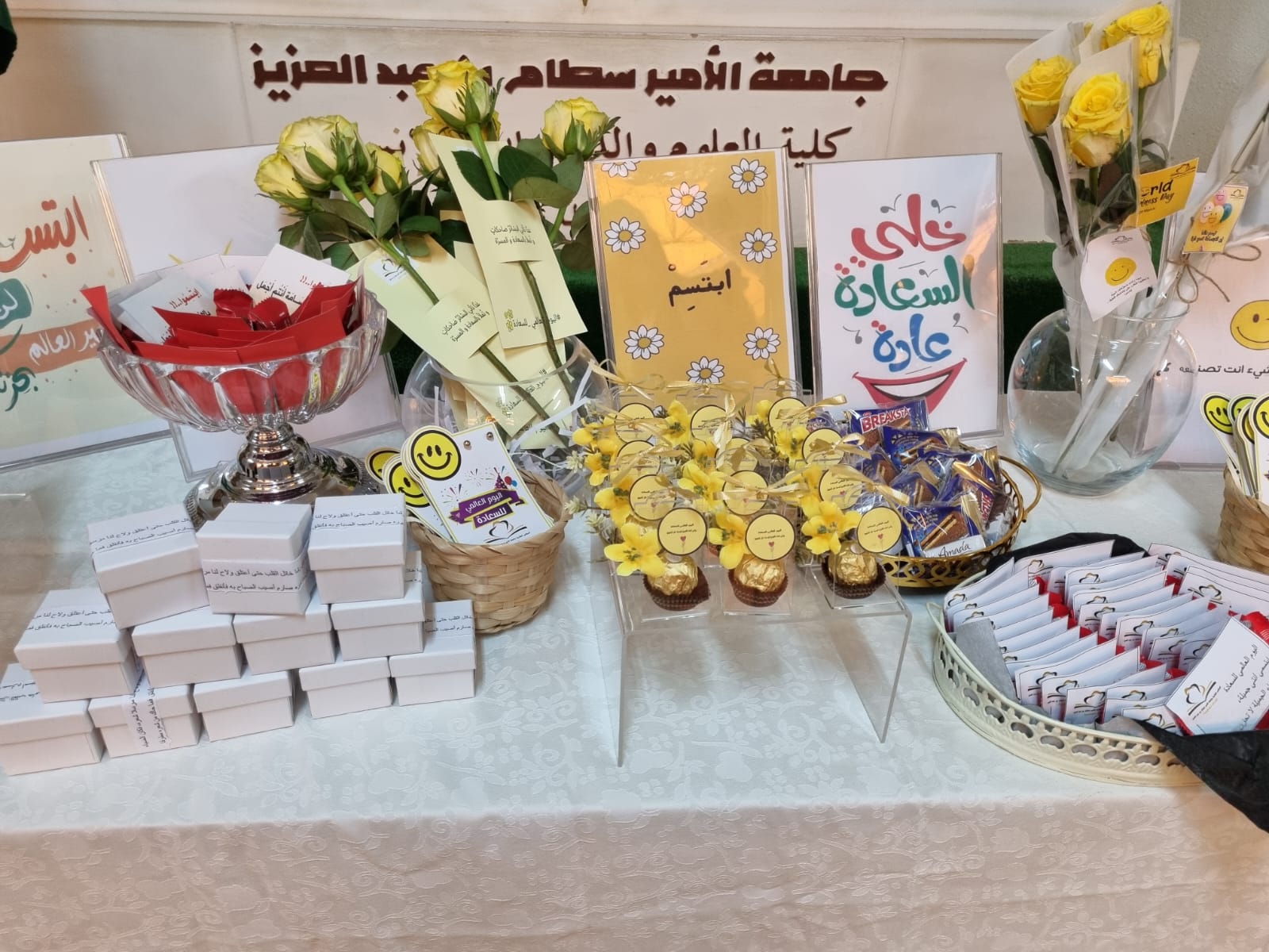 يمثل يوم السعادة حدثًا عالميًا يتم الاحتفال به في جميع أنحاء العالم في يوم 20 مارس من كل عام(International Day of Happiness) بهدف تعزيز مقومات السعادة ونشر الإيجابية بين فئات المجتمع، وبهذه المناسبة نظم المجلس الاستشاري الطلابي في كلية العلوم والدراسات الإنسانية بحوطة بني تميم، وبإشراف أ. منيرة إبراهيم التميمي وبرعاية كريمة من عميدة الكلية د. حصة بنت سعود الهزاني ركنًا بعنوان (بالابتسامة أنتم أجمل)، وذلك في يوم الإثنين 28/ 8/ 1444هـ.
