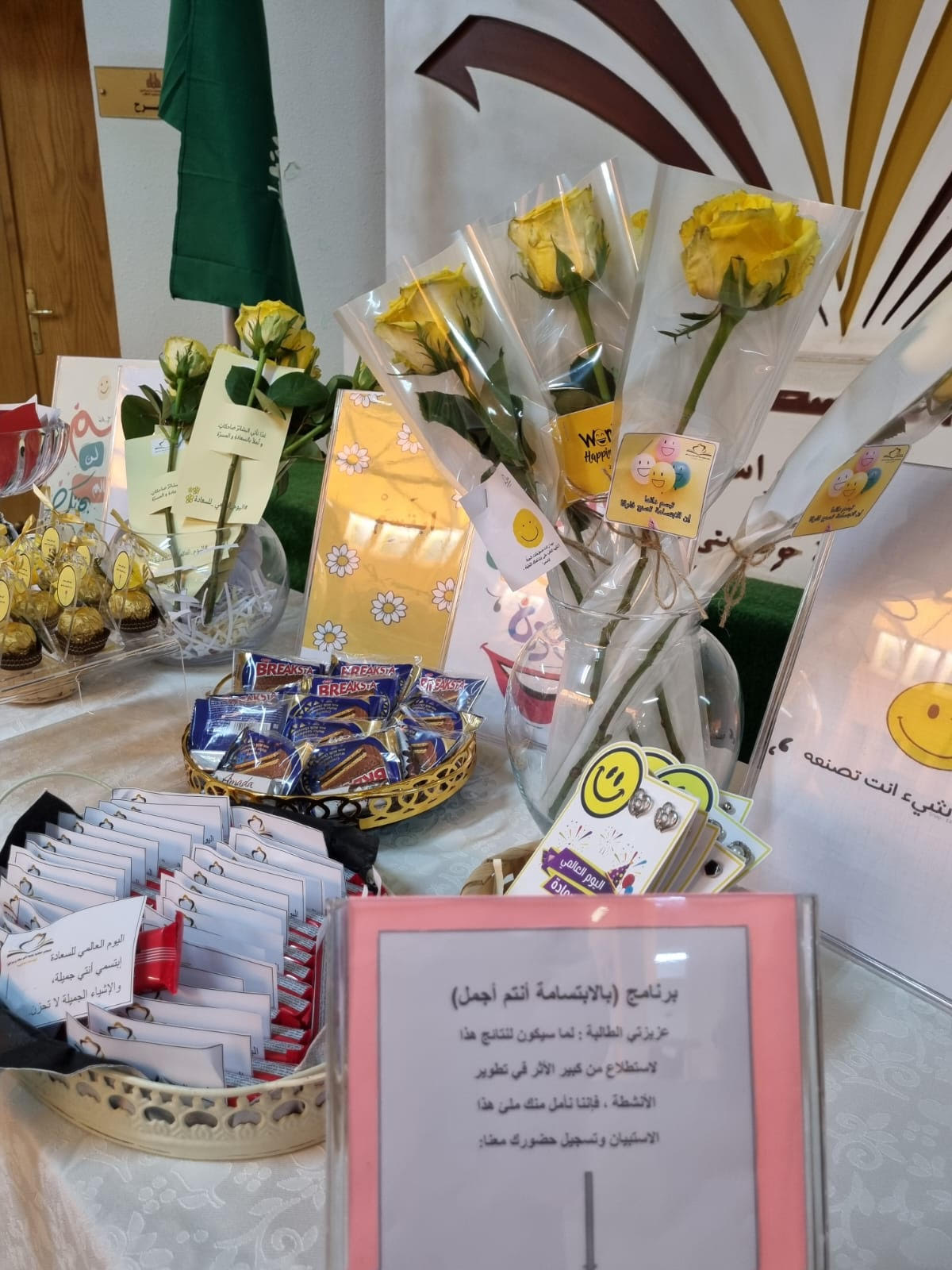 حيث اشتمل الركن على العديد من العبارات الإيجابية والتوزيعات والورود التي تحمل أجمل العبارات عن تعريف السعادة، وتفعيل مثل هذا الأيام العالمية داخل مقر الكلية له دور للتعريف بمفهوم السعادة الإيجابية وجعلها أسلوب حياة في بيئة العمل للتحفيز على الإبداع والتميز وإدخال البهجة والسرور على منسوبات وطالبات الكلية.