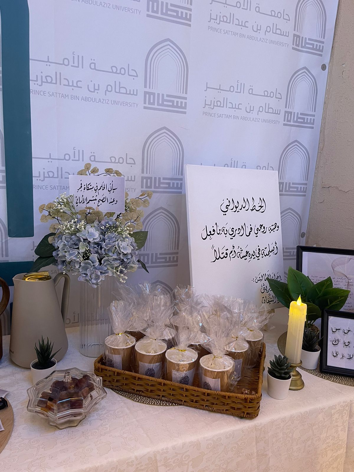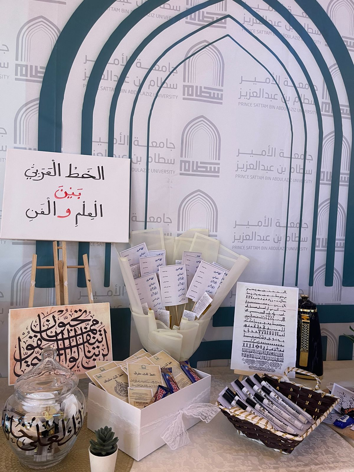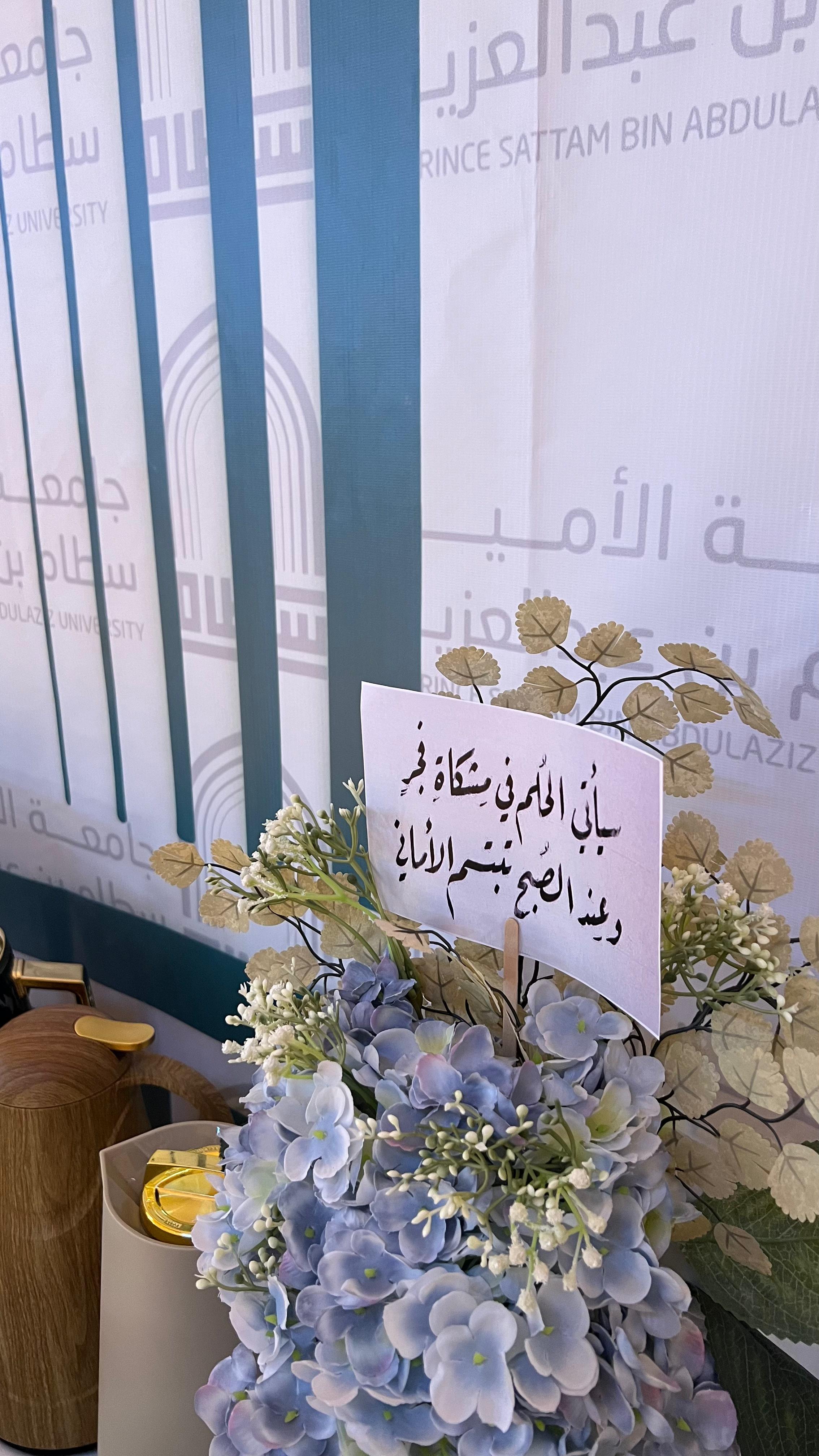 تحت رعاية عميدة كلية العلوم والدراسات الإنسانية بحوطة بني تميم د. حصة بنت سعود الهزاني نظمت وحدة العمل الطلابي ممثلة بقسم اللغة العربية ركنًا بعنوان: (الخط العربي بين العلم والفن) بإشراف الدكتورة نحا القحطاني يوم الأحد الموافق:١٤/ ٤/ ١٤٤٥هـ بتمام الساعة التاسعة والنصف في بهو الكلية.
