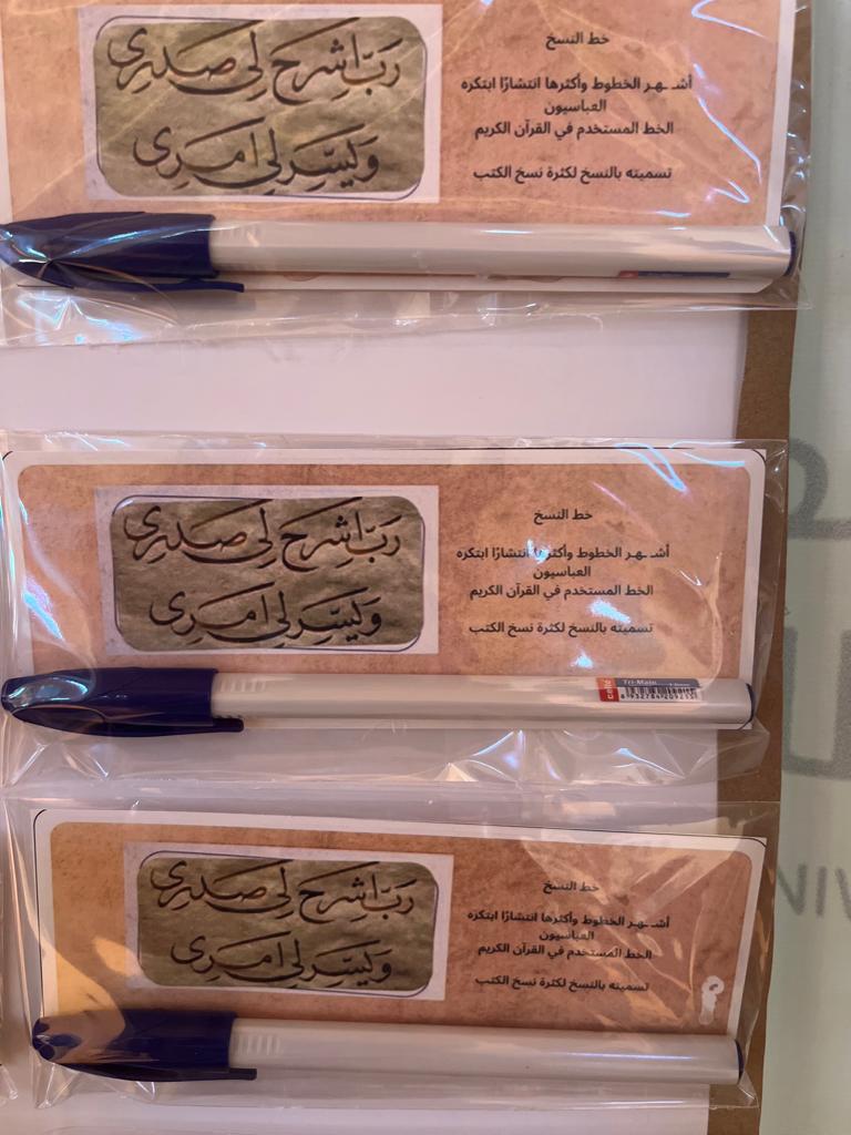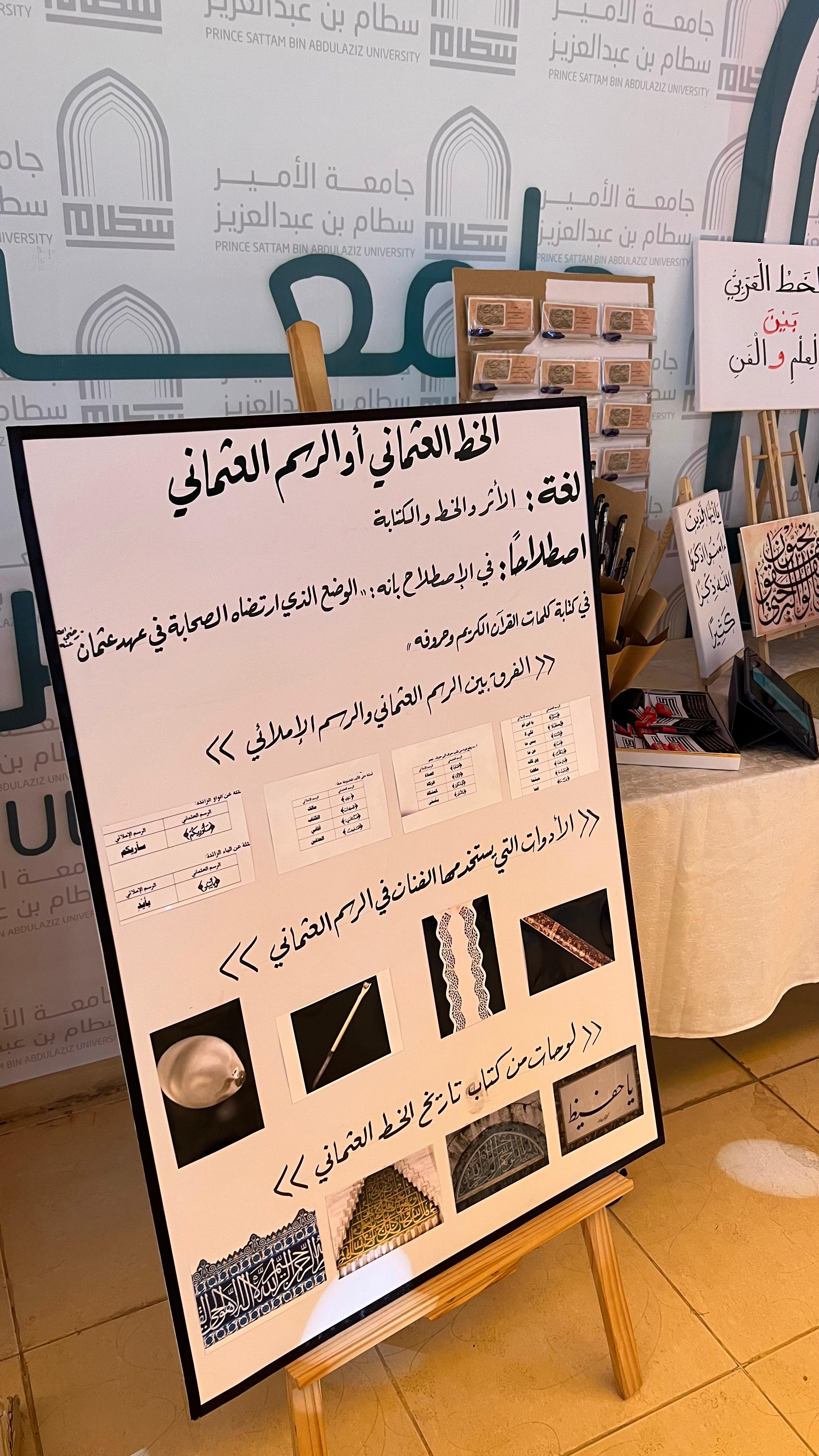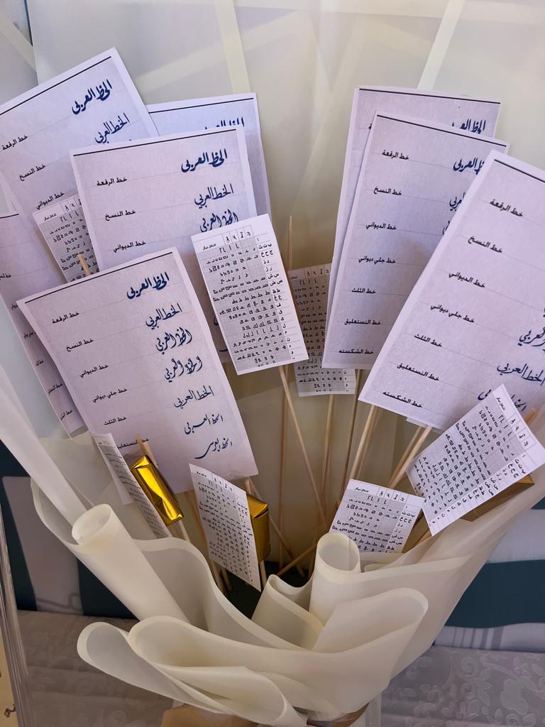 حيث أعدت الطالبات ركنًا احتوى على عدد من الخطوط العربية كالخط العثماني، والكوفي، والثلث، وعرضن طريقة الكتابة بتلك الخطوط، وأضفن بعض التوزيعات التي تحمل معلومات عن التعريف بكل خط وشكله وطريقة كتابته بحضور رائدة النشاط بالقسم ووكيلة القسم وبعض الأعضاء المنسوبات وعدد من الطالبات.