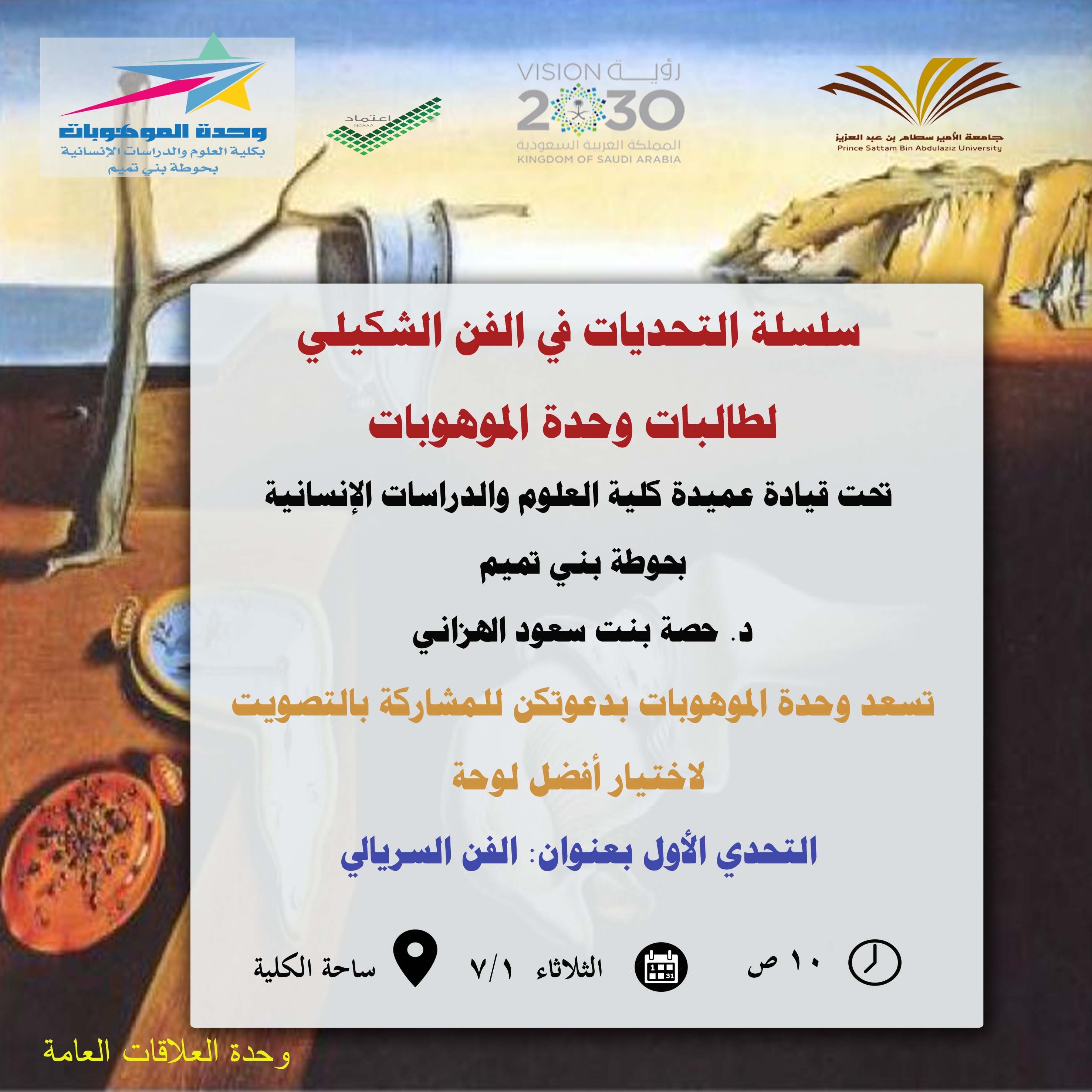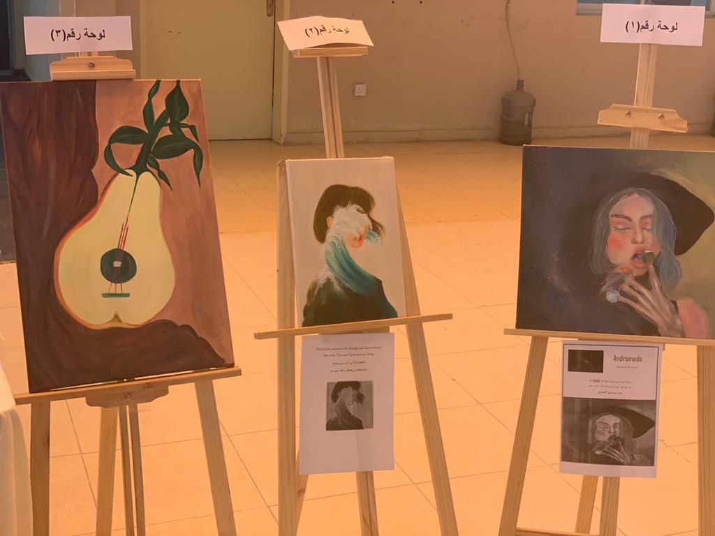 تُنظم مجموعة من طالبات وحدة الموهوبات في الفن التشكيلي بكلية العلوم والدراسات الإنسانية بحوطة بني تميم سلسلة من التحديات، من خلال تقديم لوحات فنية تشكيلية من أعمالهن خلال الفصل الدراسي الثاني. في ظل قيادة سعادة عميدة الكلية د. حصة بنت سعود الهزاني. تحت إشراف منسقة وحدة الموهوبات أ/ مها الصقعبي. ابتدأت هذه التحديات بعرض الموضوع الأول بعنوان (الفن السريالي ) وذلك في يوم الثلاثاء الموافق: 1441/7/1هـ. في ساحة الكلية. حيث سبقها تعريف الطالبات عن نشأة الفن السريالي، وأهم سماته وأشهر الفنانين. والهدف من هذه التحديات هو تعريف المجتمع بإبداعات الطالبات الموهوبات في الفن التشكيلي، وصقل مهاراتهن بهذا المجال الإبداعي، إضافة إلى نشر الحس والوعي الجمالي وتثقيف المجتمع بقيمة الفنون الإنسانية الإبداعية. تم عرض لوحات الطالبات أمام الجميع بساحة الكلية، بعد ذلك تم التصويت لأفضل لوحة من خلال مشاركة طالبات الكلية ومنسوباتها. وفي النهاية تم حساب عدد الاصوات لكل لوحة، ليتم ترشيح صاحبة أفضل لوحة خلال هذه السلسلة. وكانت النتائج كتالي: في المركز الأول لوحة الطالبة جواهر الشبانات (لوحة رقم 1Andromeda -- مجرة المرأة المسلسلة) حصلت على( 109) صوت. وفي المركز الثاني لوحة لطالبة هياء الجنوبي (لوحة رقم 2- Malachite olamon - قلب قوي وشجاع).وحصلت على (78) صوت. أما المركز الثالث لوحة الطالبة عائشة الجوير( لوحة رقم 3- أوتار) حصلت على (20) صوت. المركز الرابع والأخير لوحة الطالبة ولاء علي (لوحة رقم 4- الحرية هي امتلاك إمكانية العزلة) حصلت على (16) صوت. وقد شهدت هذه الفعالية حضور وتفاعل مجموعة كبيرة من طالبات الكلية وصل عددهم تقريبا إلى 223طالبة .