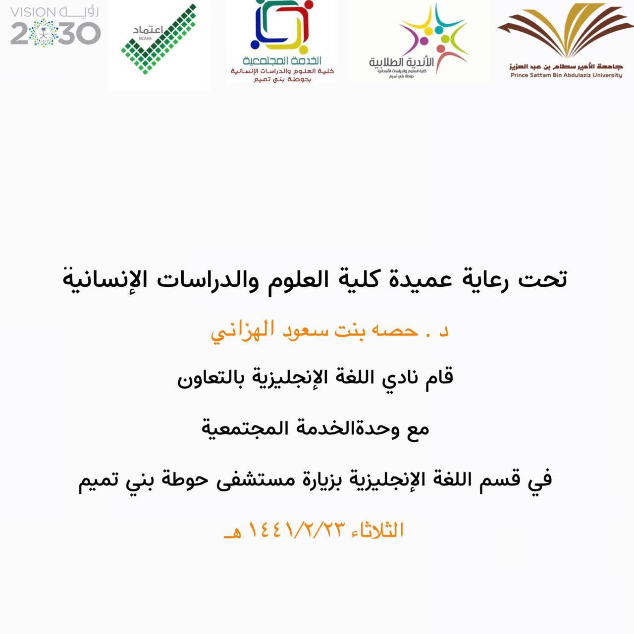أن تعميق أسس روح التعاون والترابط بين كل أفراد المجتمع يعتبر من ضمن الأهداف الاجتماعية والتربوية التي تسعى كلية العلوم و الدراسات الإنسانية بحوطة بني تميم إلى تحقيقها بقيادة سعادة العميدة د. حصه بنت سعود الهزاني، حيث نظمت طالبات نادي اللغة الإنجليزية بالتعاون مع وحدة الخدمة المجتمعية في قسم اللغة الإنجليزية زيارة لمستشفى حوطة بني تميم العام، وذلك في يوم الثلاثاء 1441/2/23هـ في تمام الساعة التاسعة و النصف. تم استقبال الطالبات من قبل وفد من المستشفى و الترحيب بهن، بعد ذلك قامت الطالبات بإشراف مشرفة نادي اللغة الإنجليزية و مشرفة وحدة الخدمة المجتمعية في القسم بتقديم الهدايا والورود على الأطفال والمرضى في أقسام مختلفة، كما تم تقديم الورود على الطاقم الطبي شكراً و تقديراً لجهودهن في خدمه المرضى. و قد هدفت هذه الزيارة إلى تعزيز دور جامعة سطام عامةً و قسم اللغة الإنجليزية خاصةً في خدمة المجتمع و التواصل مع فئات المجتمع المختلفة.