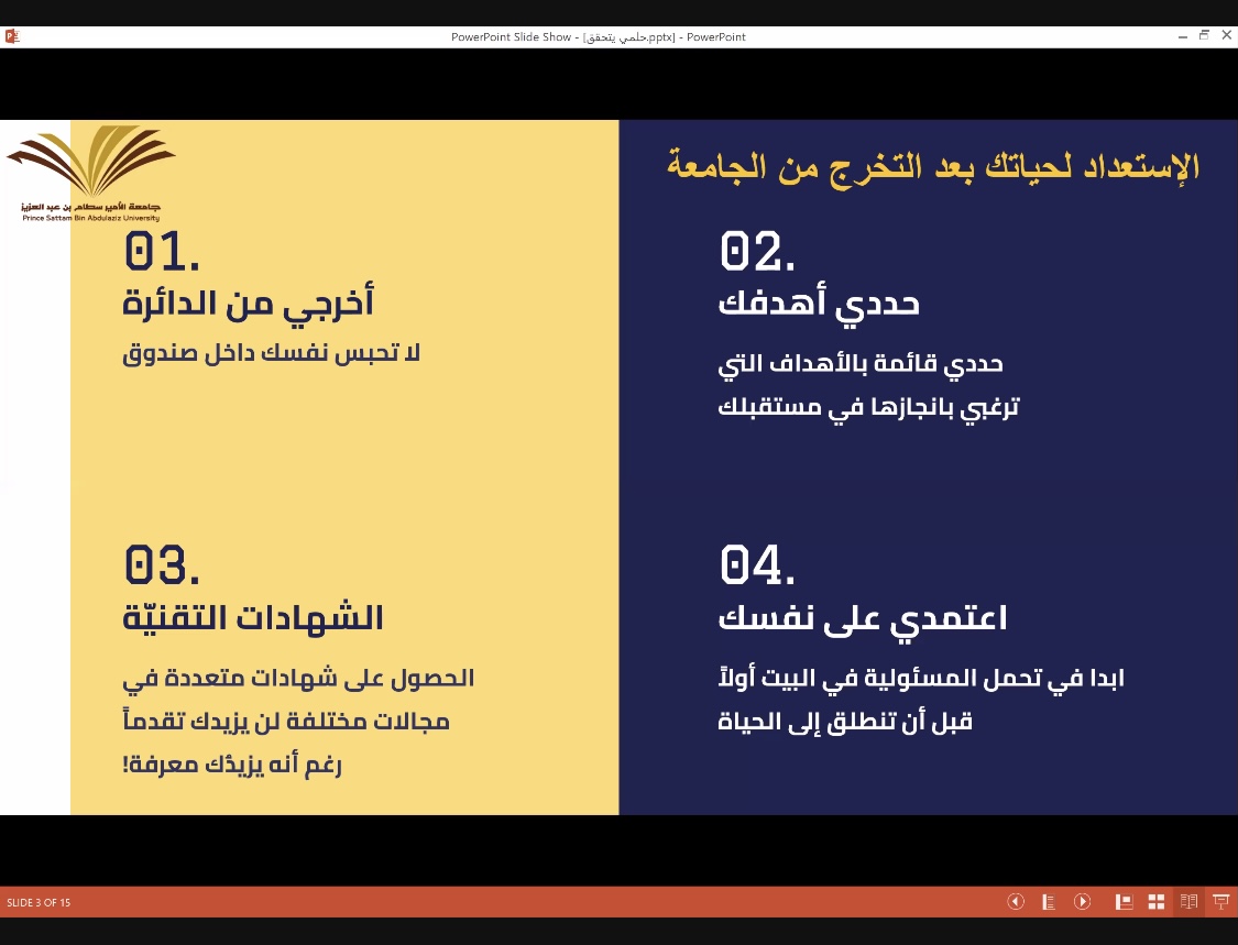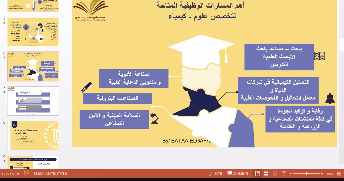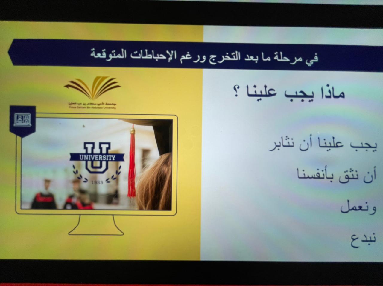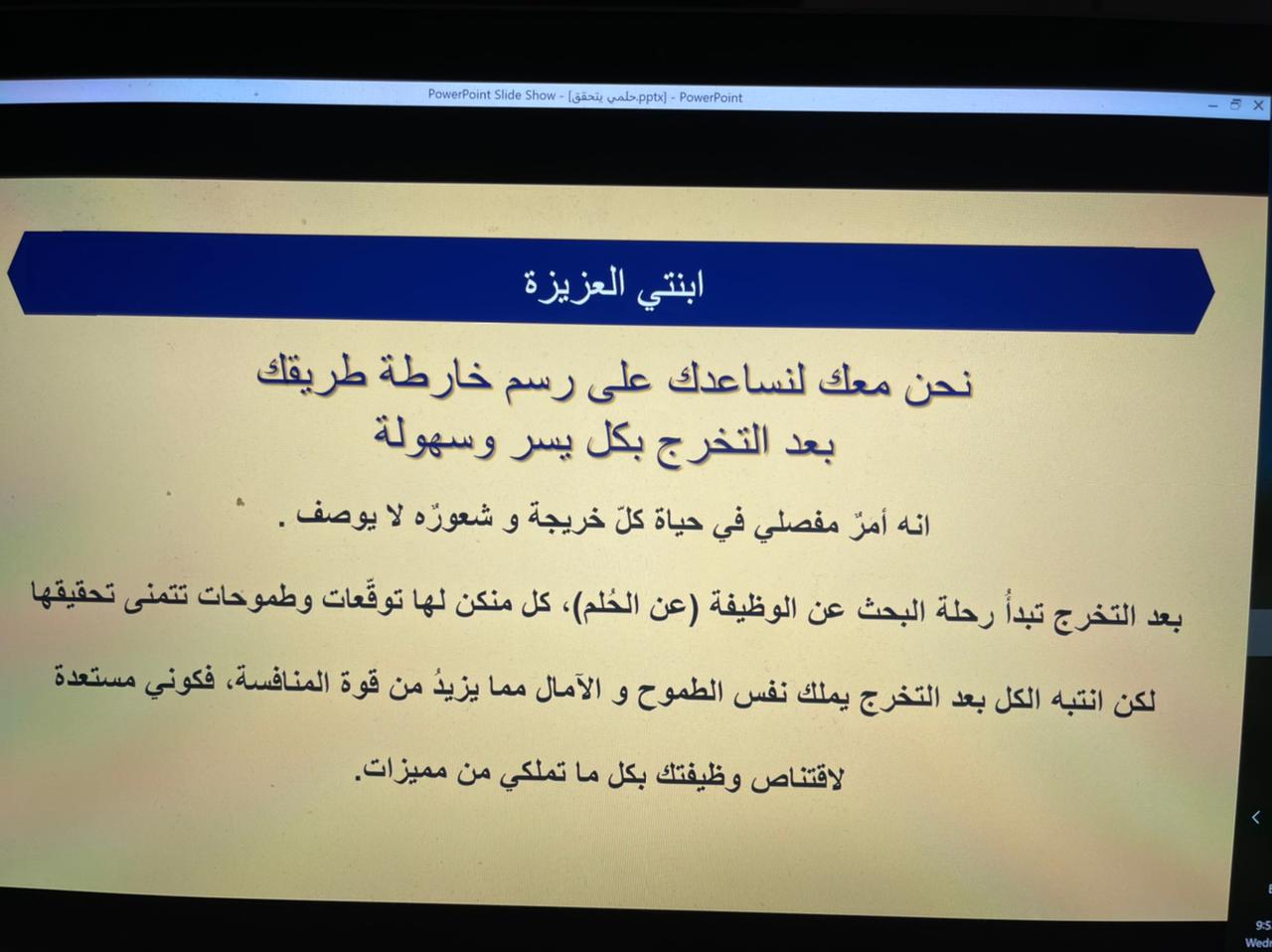 حيث أقامت وحدة الخريجات ( الإرشاد المهني ) بالتعاون مع قسم الكيمياء الجزء الثاني من فعالية ماذا بعد التخرج؟ بعنوان(حلمي يتحقق)، تقديم أ. باتعة الجعفري محاضر بقسم الكيمياء و كانت في ضيافتها الخريجة ( نورة عوضة ).وذلك في يوم الأربعاء الموافق:17/7/1442هـ تمام الساعة السابعة مساءً عبر برنامج Zoomبحضور منسقة لجنة الإرشاد المهني بالكلية د. فاطمة التاج و بعض عضوات هيئة تدريس و عدد 34 طالبة من قسم الكيمياء، حيث انقسمت الفعالية لجزئين: في الجزء الأول تناولت تعريف الطالبات بالاستعدادات الواجب إتباعها استعداداً لحياة ما بعد التخرج و تحقيق حلم الحصول على وظيفة أو العمل الحر و توضيح للمهارات المطلوبة بشكل عام لسوق العمل ثم استعراض مبادرات صندوق تنمية الموارد البشرية متمثلة في (برنامج تمهير منصة دروب – منصة سبل ) و دورها في اكساب الخريجات الخبرات والمهارات.