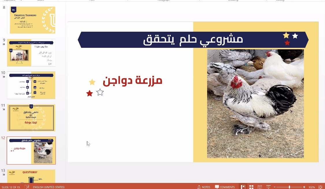 أما عن الجزء الثاني من الفاعلية فكان الحوار بين أ. باتعة الجعفري و الخريجة نورة عوضة لاستعراض حلمها الذي بدء يتحقق ( مشروع دواجن) وطرح فيه ما قامت به من أعمال أثناء فترة دراستها و المهارات التي اكتسبتها من دراساتها للكيمياء و كيف استفادت منها و أيضا المقومات التي عززت بها نفسها للدخول في مجال العمل الحر.