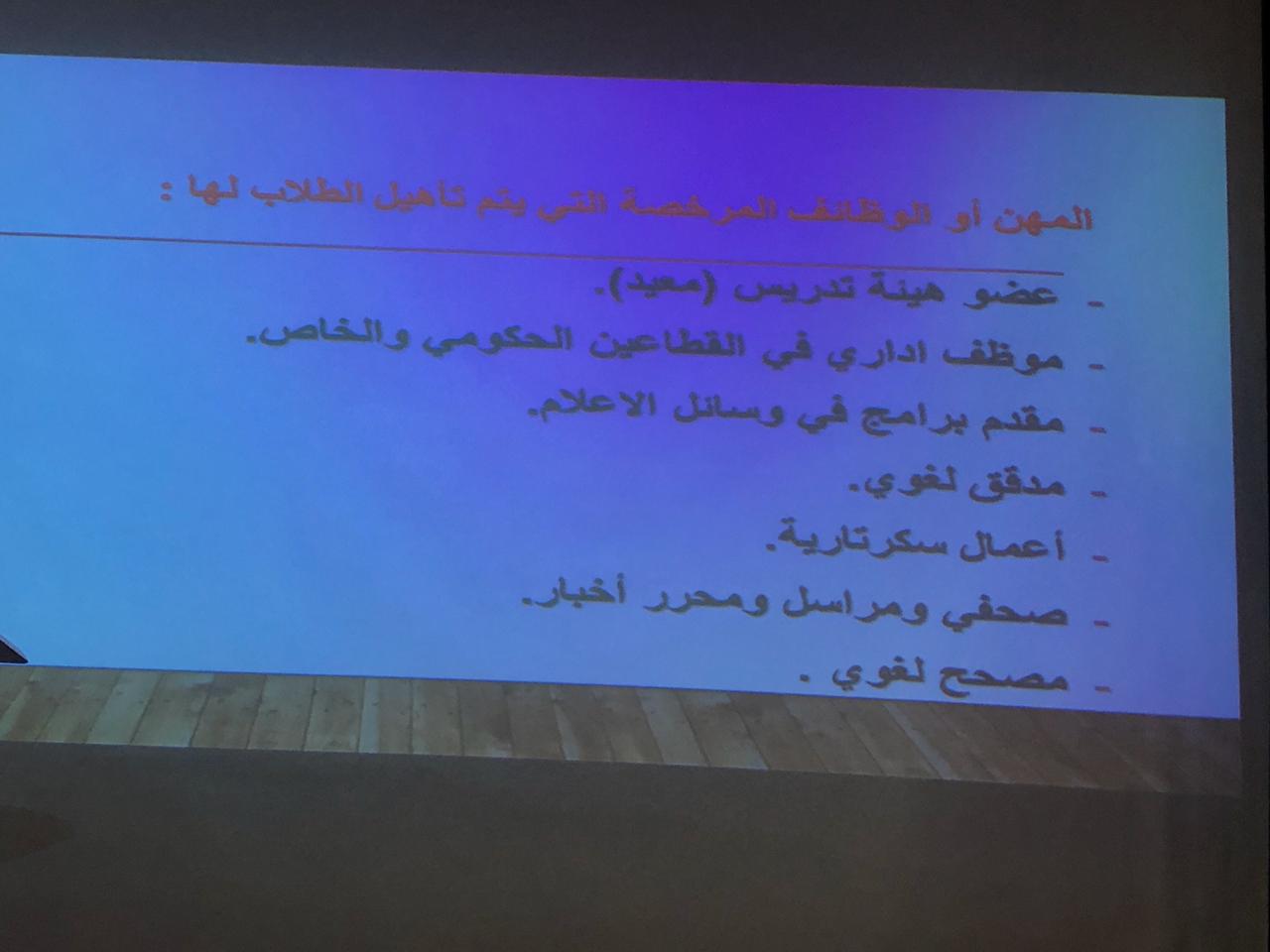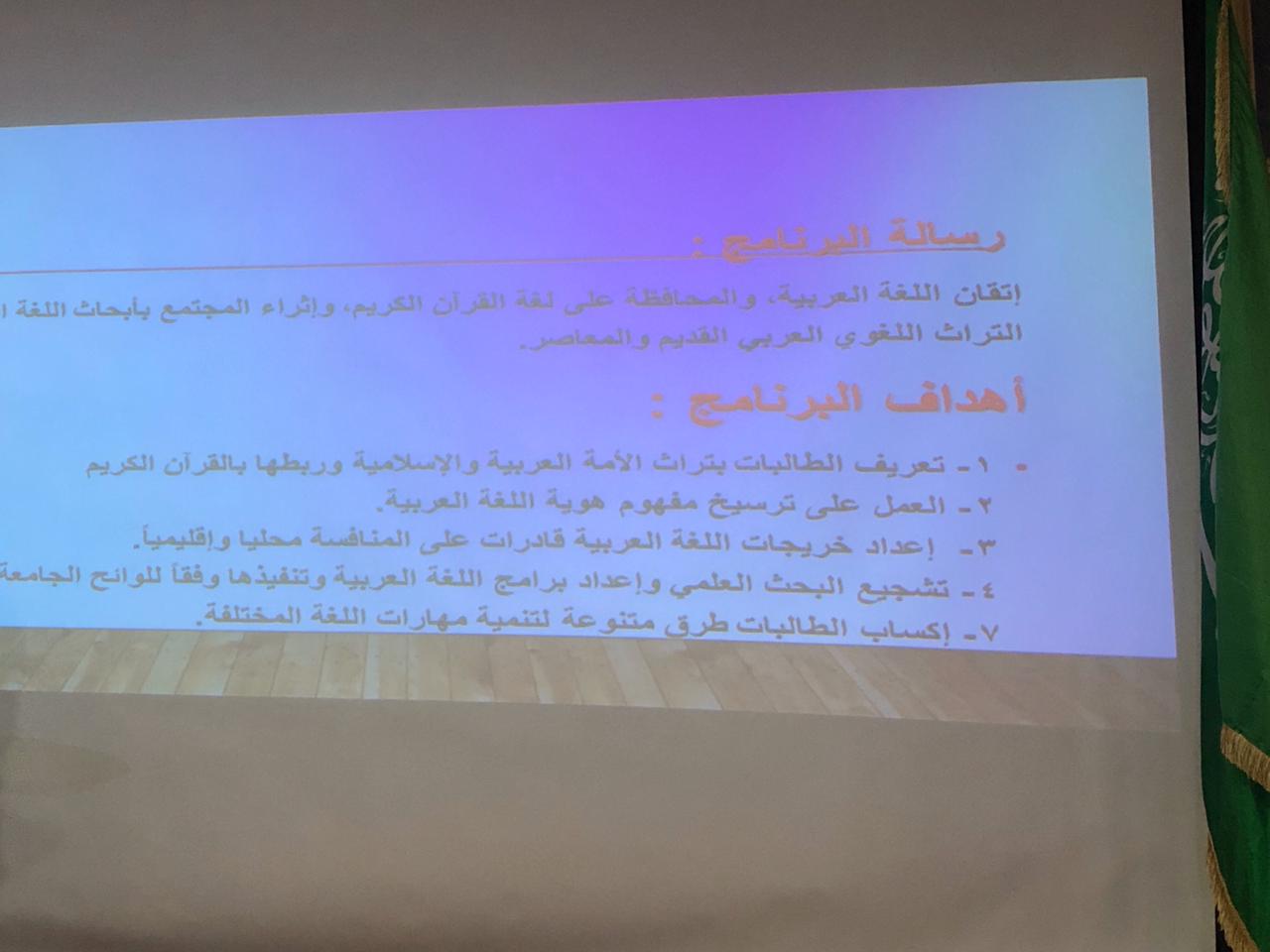 واختتم البرنامج بتقديم قسم اللغة العربية تهيئة لطالباته المستجدات، بتمام الساعة 10 صباحاً. وتم فيه تعريف الطالبات ببرنامج اللغة العربية وخطته وأهدافه وأهميته وتوصيف البرنامج وأهم المهن والوظائف التي يتم تأهيل الطالبة لها، كما اشتمل على ذكر أهمية الحضور للمحاضرات وأثر الغياب على مستوى الطالبة وتقدمها العلمي، وكذلك تعريفهن بكيفية الاعتذار أو التأجيل الدراسي. وشاركت رئيسة القسم د. أماني عبد الرازق في الترحيب بالطالبات وقدمت توجيهات ونصائح لهن، كما شاركت د. نادية الأمين في تعريفهن بأنظمة الكلية وأهدافها، وقدمت د. أميرة صالح تعريف بالخدمة المجتمعية وأهميتها للطالبة، وكذلك شاركت د. أماني فرح بالترحيب بالطالبات وتقديم تعريف بالقسم وأهميته.