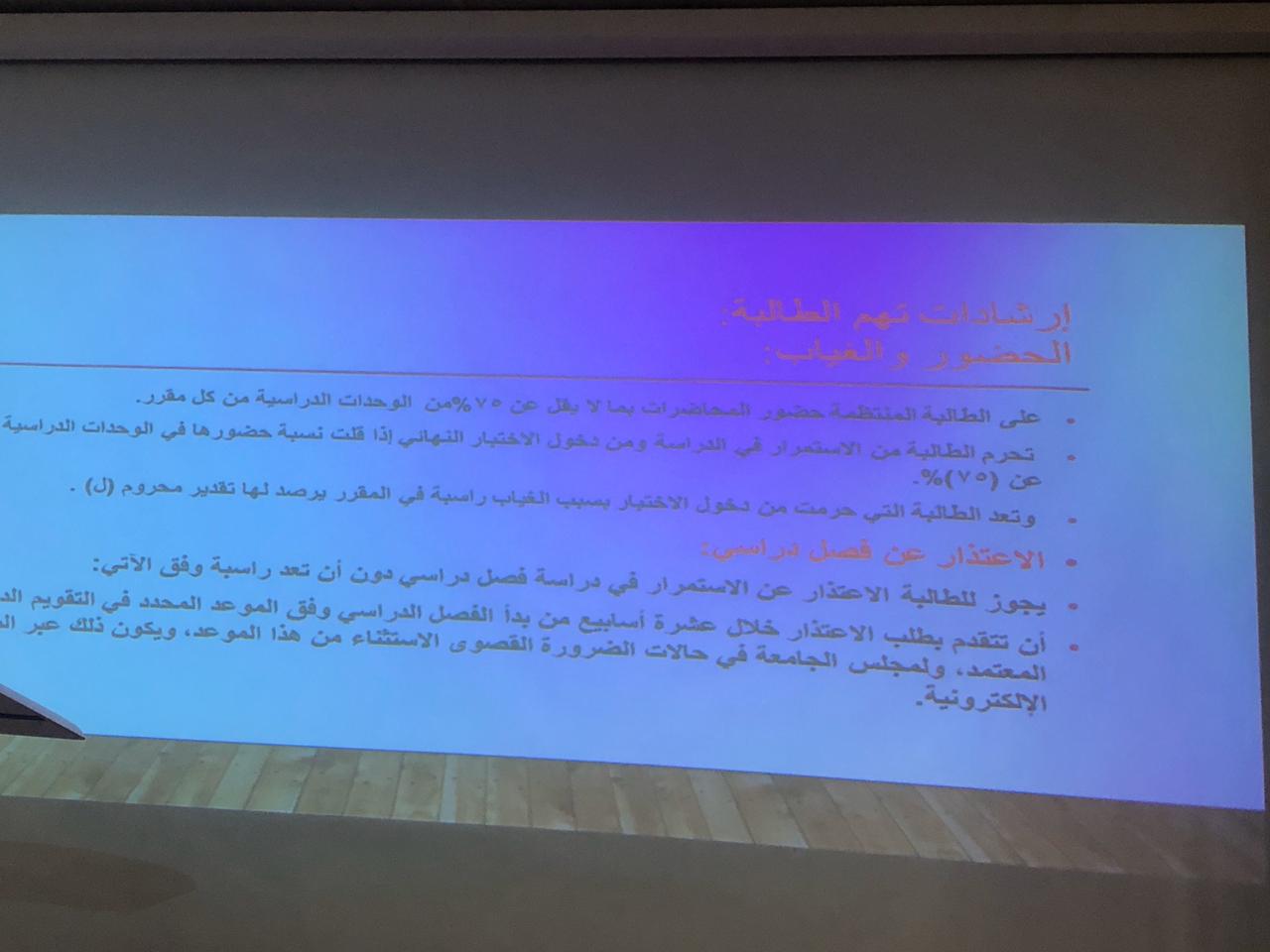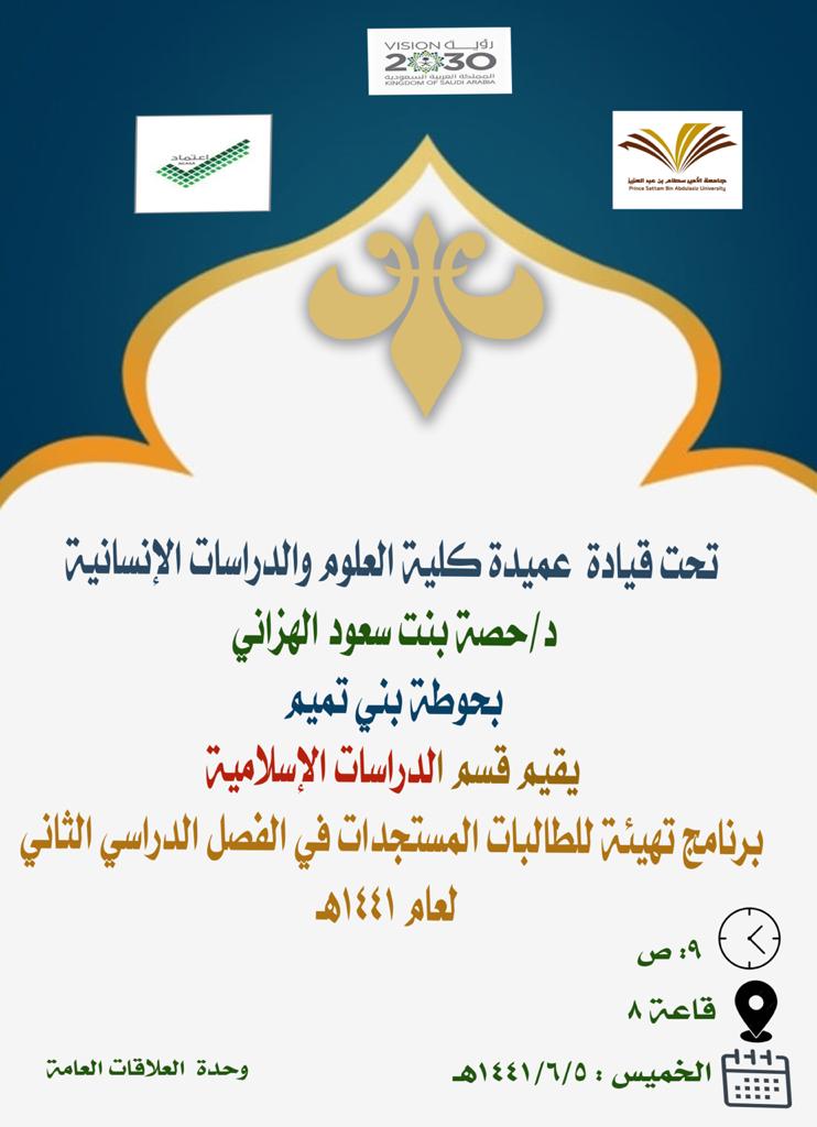 توالت اللقاءات التعريفية تباعاً في بقية أقسام الكلية في يوم الخميس الموافق :١٤٤١/٥/٦هـ ، حيث بدأ قسم الدراسات الإسلامية بتقديم برنامج (تهيئة الطالبات المستجدات في الفصل الدراسي الثاني ) في مبني دراسات قاعة B_8 في تمام الساعة 9صباحاً. قدمته أ/ فايزة سالم منسقة الجودة بالقسم بالترحيب بالطالبات المستجدات مع ذكر رسالة وأهداف القسم. وتم توضيح بعض الأساسيات الأكاديمية التي تحتاجها الطالبة في بداية مسيرتها الجامعية، وشاركت الدكتورة فاطمة المشاري رئيسة القسم الطالبات ببعض التعليمات المهمة في الحضور والغياب والتحويل والاعتذار عن المقرر .كما حفزت الطالبات على الاجتهاد والتفوق وتمثيل القسم بأجمل صورة ، وحضر اللقاء عدد من عضوات هيئة التدريس وشاركن في الإجابة على استفسارات الطالبات. كما اشتمل البرنامج على ركن احتوى مطويات وتوزيعات تعريفية بالقسم ونظام الدراسة ، ووزعت د. ندى التميمي مطويات محفزه عن النجاح والتقدم كان لها أثر ايجابي لدى الطالبات.