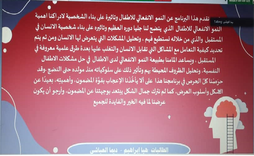 انطلاقاً من دور وحدة الخدمة النفسية والاجتماعية، في تعزيز مفهوم التحصين النفسي للمجتمع بتحقيق التوازن النفسي والصحة النفسية ذلك من خلال دراسة وتحليل السلوك الإنساني وما وراء هذا السلوك من عمليات عقلية أو دافعية حتى يمكن فهمه وضبطه والتنبؤ به مستهدفين فئة الأطفال والذين تتشكل ملامح شخصياتهم في المستقبل في فترة الطفولة، وتحت رعاية عميدة كلية العلوم والدراسات الإنسانية بحوطة بني تميم د. حصة بنت سعود الهزاني أقامت الوحدة برنامج "النمو الانفعالي للأطفال وأثره في تكوين الشخصية " في الساعة السادسة مساء من يوم الاثنين الموافق:30 / 8 /1442هـ، عبر تطبيق زووم، من تقديم طالبات قسم الكيمياء وقسم اللغة الإنجليزية وتحت إشراف د. عديلة حسين جبارة عبدالجليل.