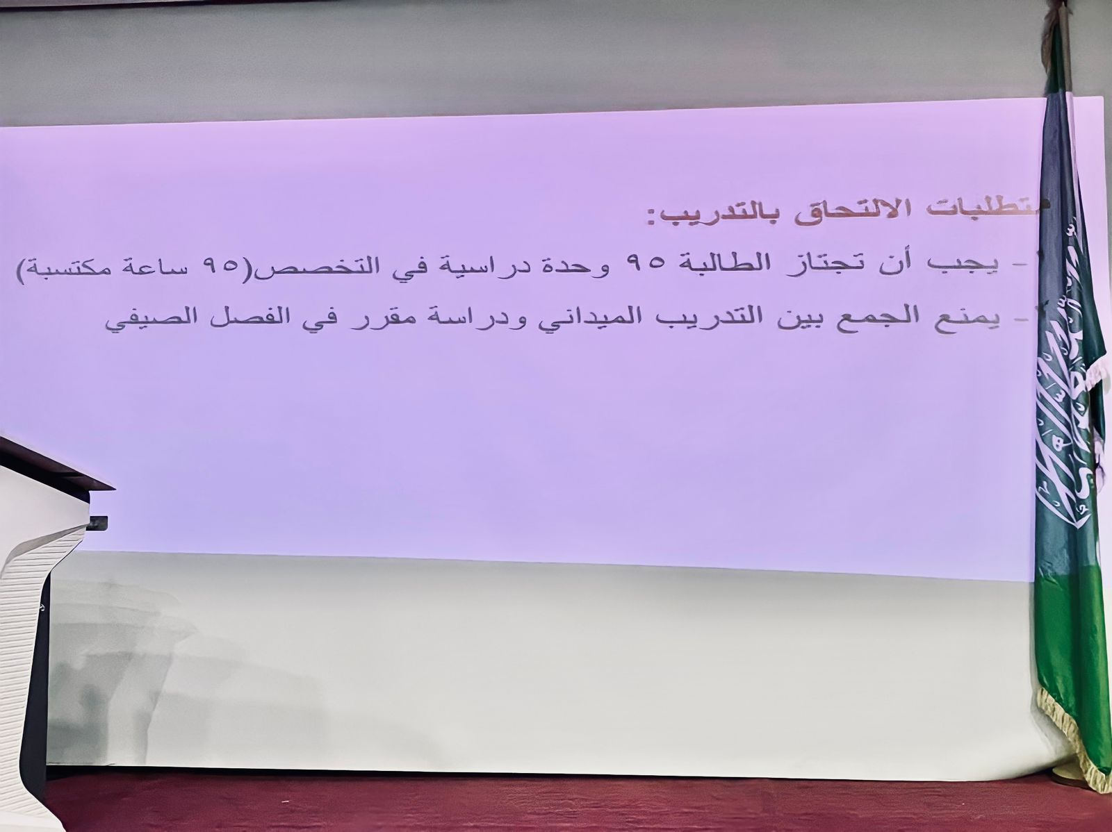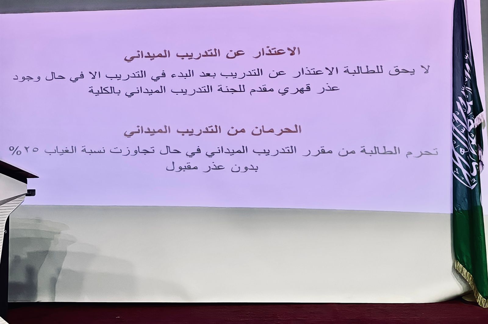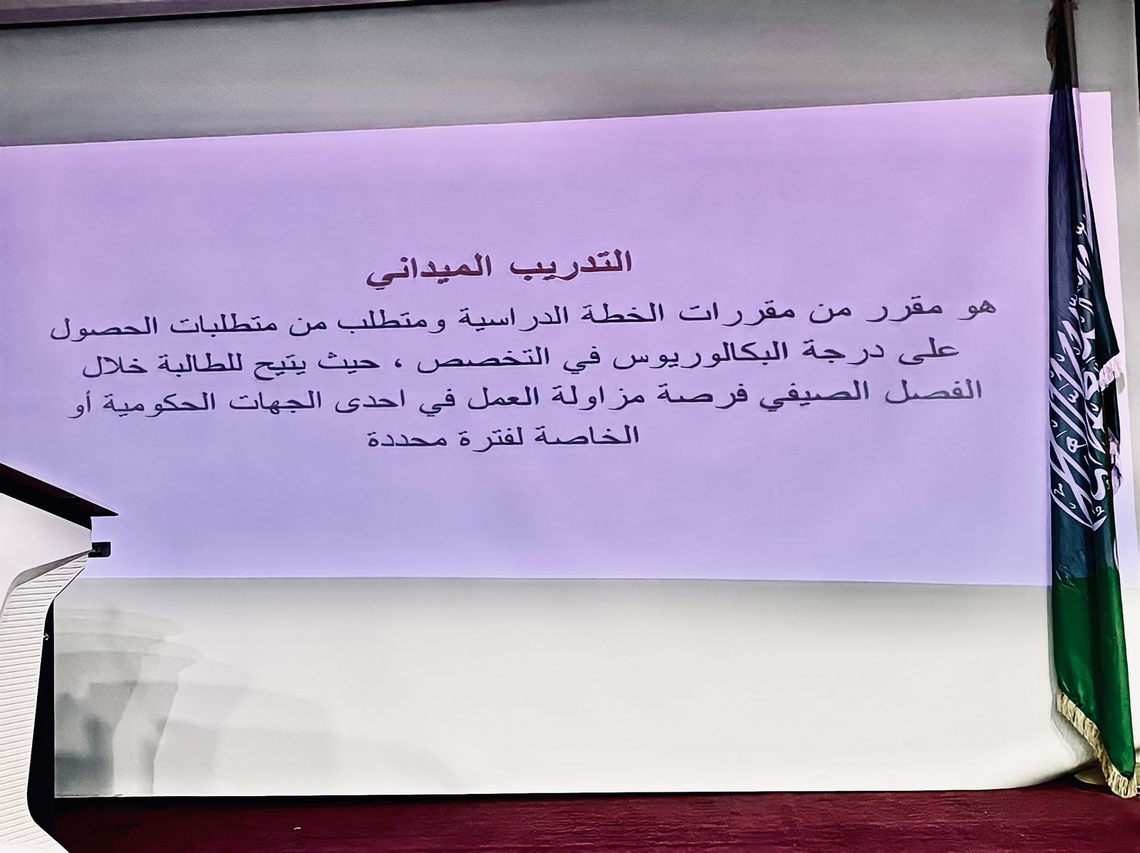 فمن خلال البرنامج تم التعرف على المفاهيم الأساسية للتدريب الميداني ومتطلبات الالتحاق بالتدريب وبعض المجالات التي يمكن للطالبة التدريب فيها، بالإضافة إلى توضيح الجوانب الأكاديمية المتعلقة بالتدريب مثل الاعتذار، الغياب، والحرمان.