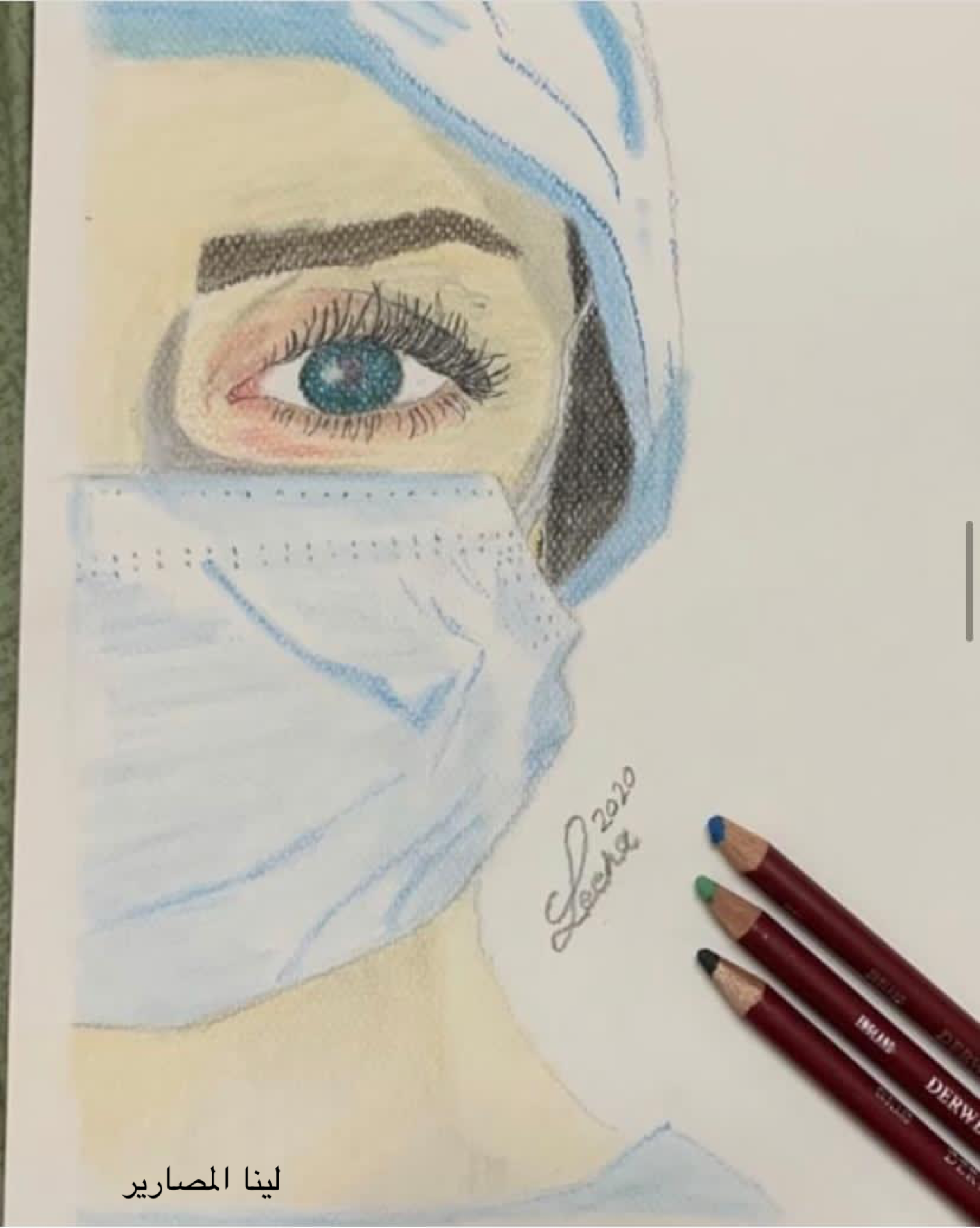 وفي اللوحة الثانية "راقصات الباليه" نلاحظ تبادل الألوان الفاتحة والغامقة لتؤكد على موسيقى الخلفية لاكتساب الحيوية والحركة في اللوحة،أما في اللوحة الثالثة استخدمت ألوان الباستيل وهذه الألوان الرقيقة التي تستطيع أن توضح لون البشرة كما هو الحال في رسم بورتريه يمثل جزء من وجه دكتورة في زمن الكورونا وقد بدا عليها التعب والإرهاق في سبيل التصدي للفيروس.