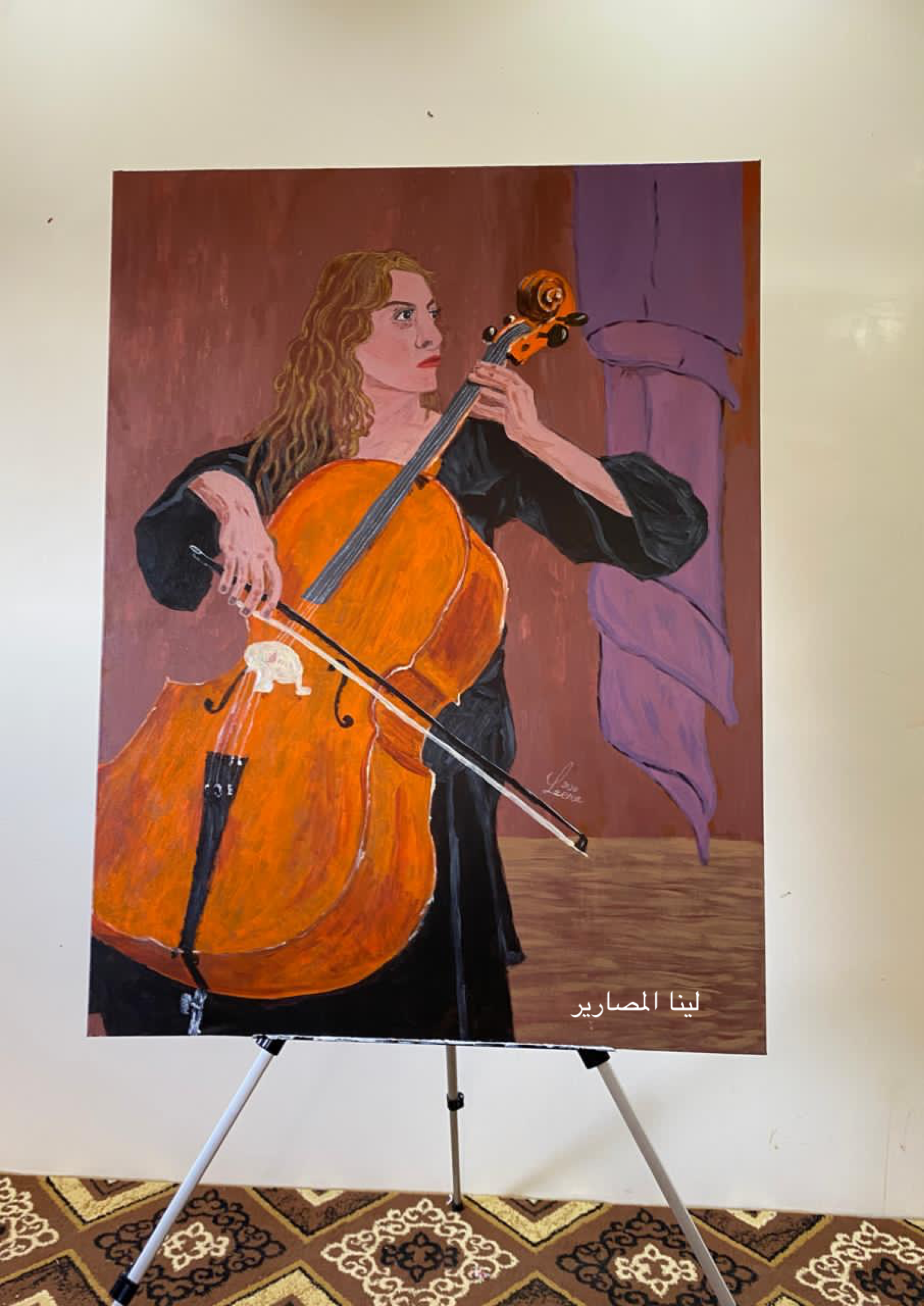فقد قدمت الطالبة لينا المصارير من قسم اللغة الإنجليزية لوحة فنية باستخدام ألوان الاكريلك في لوحة "عازفة التشيلو" حيث اعتمدت في إبراز اللوحة على الألوان الدافئة.