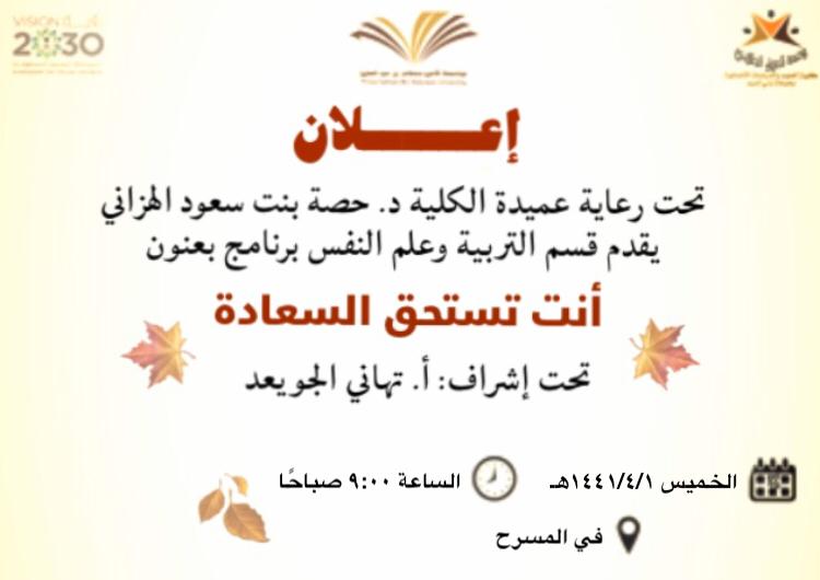 إن السعادة الحقيقية هي التي ترتبط بالآخرة والالتزام بأوامر الله تعالى، والسير على نهج النبي الكريم -صلى الله عليه وسلم ، ومن هذا المنطلق قدم قسم التربية وعلم النفس برنامج بعنوان " أنت تستحق السعادة " تحت قيادة عميدة كلية العلوم والدراسات الانسانية بحوطة بني تميم د/حصه بنت سعود الهزاني ، وذلك في يوم الخميس الموافق: ١٤٤١/٤/١هـ في تمام الساعة ١٠:٠٠ صباحًا بمسرح الكلية. تحت إشراف أ. تهاني الجويعد . وتدور محاور البرنامج حول معنى السعادة وكيفية الوصول إليها. ففي بداية البرنامج تم عرض مقدمة عن السعادة ، ثم مشهد تمثيلي يحكي عن التشاؤم والحزن وعدم الصبر ، ثم توضيح كيفية التغلب على تلك الصفات للوصول إلى السعادة المرجوة بمشاركة الحضور والطالبات . وفي الختام تم تقديم الهدايا لهن .