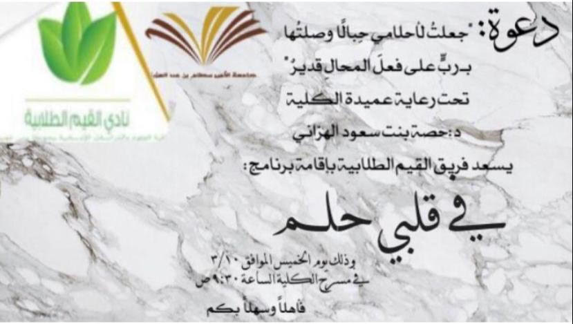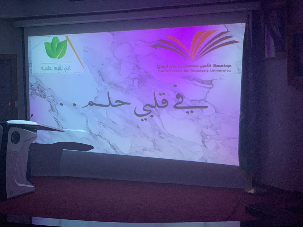 يعد الحلم والطموح حجر الأساس للوصول لتحقيق النجاح فمن هذا المنطلق وتحت قيادة عميدة كلية العلوم والدراسات الانسانية د. حصة بنت سعود الهزاني . أقام نادي القيم الطلّابية برنامج بعنوان "في قلبي حلم" وذلك في يوم الخميس ٩/ ٣/ ١٤٤١هـ في تمام الساعة ٩:٣٠ صباحاً بمسرح الكليّة. وتدور محاور البرنامج عن أهمية تحديد الأهداف والسعي لتحقيق الطموح والأحلام ، حيث شاركت بعض الطالبات بقصصهن الملهمة في تحقيق انجازاتهن ، وتم عرض بعض الفيديوهات التحفيزية عن أشخاص مؤثرين وناجحين، وفي نهاية البرنامج تم توزيع منشورات للحضور تحتوي على عبارات تشجيعية وملهمة.